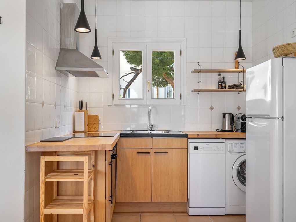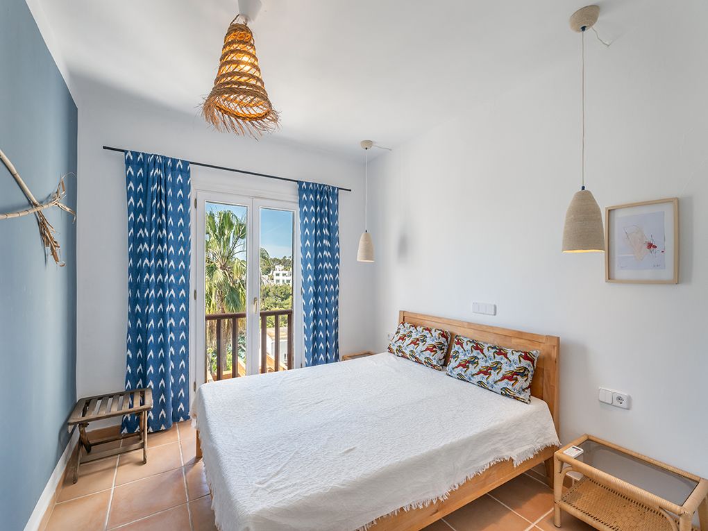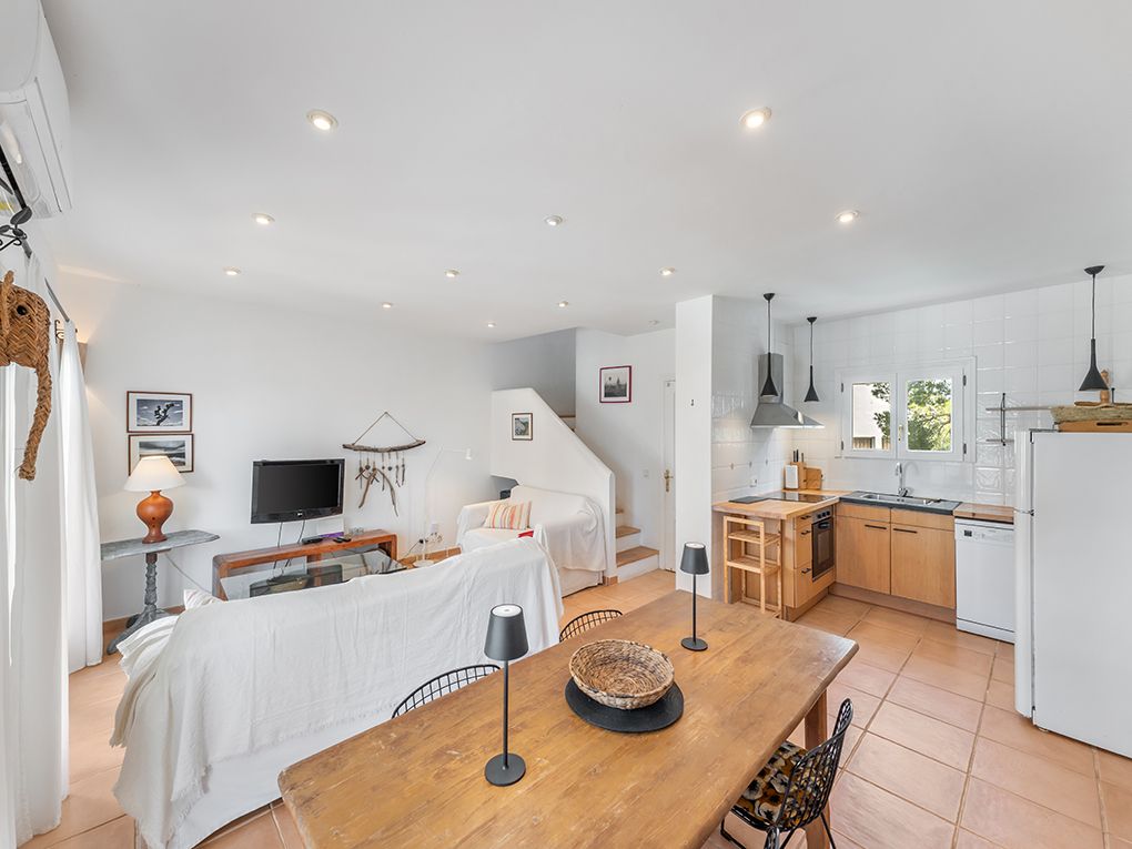 This beautiful apartment is available from September 2026 and spans approximately 100 sqm. It is located on the second line from the sea, just a few steps from the idyllic Cala Gran bathing cove. It forms part of a small ensemble of only three terraced houses and offers stunning sea views from all three levels. The bright living and dining area with an adjoining kitchen is located on the first floor. A covered terrace with an integrated BBQ completes this level. The second floor features two bedrooms as well as a shower bathroom. Both bedrooms have access to a balcony with a seating area and magnificent sea views. A particular highlight is the spacious rooftop terrace, which adds approximately 30 square meters. An outdoor shower with hot water provides additional comfort. Parts of the property were renovated in 2025, presenting the apartment in a well-maintained and modern condition. Thanks to air conditioning with both heating and cooling functions, the apartment is comfortable to live in all year round. A private parking space and a communal pool complete the property. Electricity, water, and internet costs are charged separately. The property is available for a minimum rental period of 11 months. Rental prices vary depending on the season; please inquire individually. Here, you will live in a highly sought-after location with spectacular views of the Mediterranean Sea and enjoy the Mediterranean lifestyle at its finest.