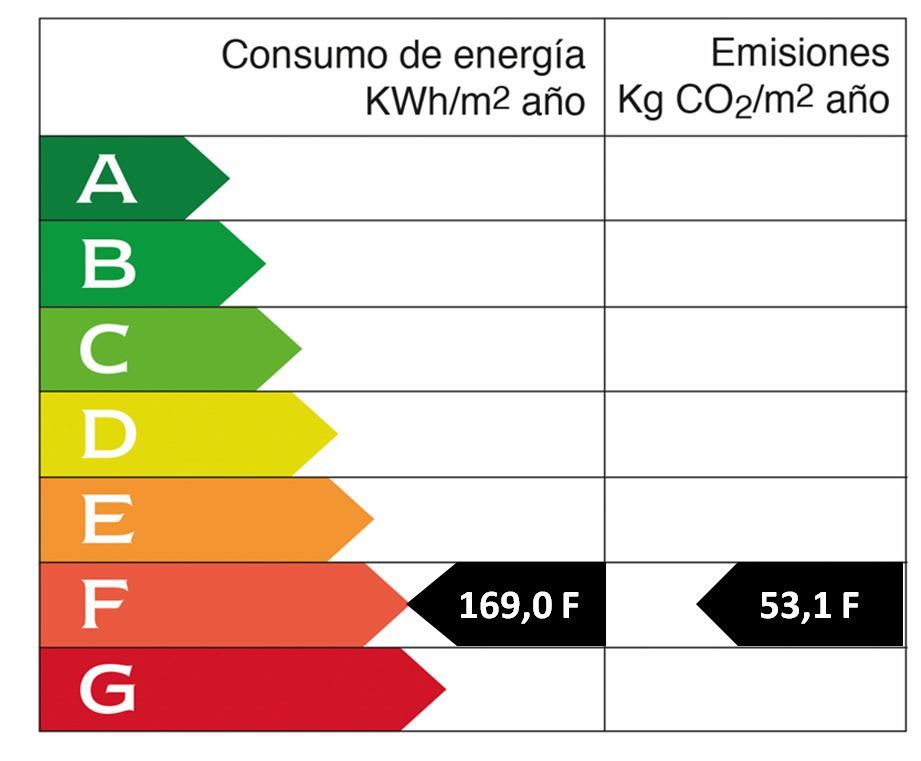 • Energy consumption value: 169.0 kWh/(m2*a) • CO2 emission: 53.0 kg/m2 • CO2 Emission Rating: F • Energy efficiency rating: F