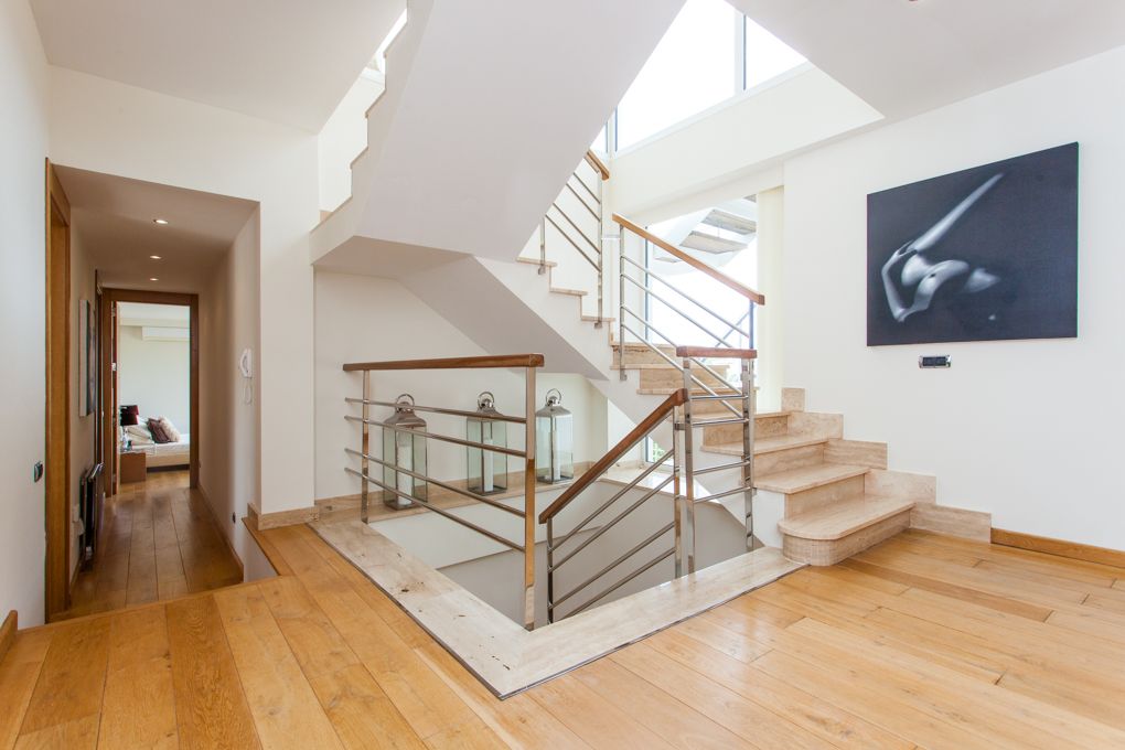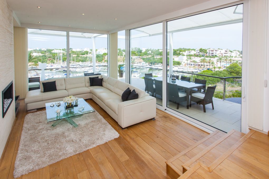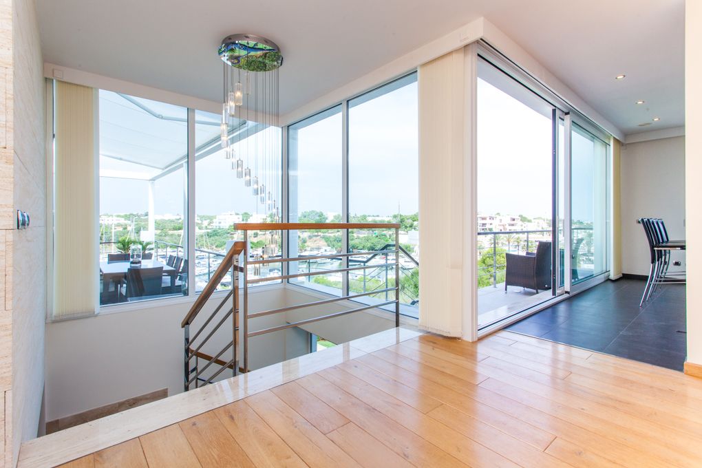 This unique villa stands directly above the exclusive marina at Cala d’Or and enjoys breathtaking views. A pathway alongside the house leads straight down to the harbour promenade. The property itself is split into three levels. Flooded with natural light, the main entrance is located on the second floor, promising sensational views across the harbour. In addition to a spacious living/dining area with fireplace, there is a modern, open-plan fitted kitchen and guest WC. An array of terraces will allow you to savour the bustling activity in the harbour below. On the first floor there are three beautiful bedrooms with en-suite bathrooms, walk-in closets and terraces, plus a large garage and utility room. A master suite with dressing room is located on the ground floor, complete with en-suite bathroom and terrace. There is also one more bedroom with en-suite bathroom and another room. A generously sized living room with its own bar and billiard table is the perfect place to spend a relaxing evening with family and friends. Rounding off the picture on this floor is a fitness room with a shower. Step outside onto the terrace and into the garden which boasts a gorgeous infinity pool and whirlpool. The villa is situated in a peaceful cul-de-sac and has three parking spaces on site. An outdoor staircase also provides access to the various levels. All of the terraces which grace this elegant property offer spectacular views across the harbour. The excellent Vall d’Or golf course near Porto Colom and the charming village of Santanyi with its weekly markets and shops can be reached by car in just a few minutes.