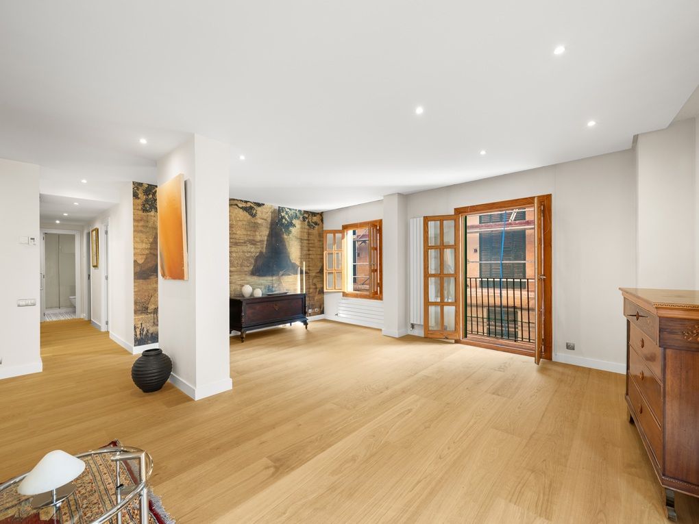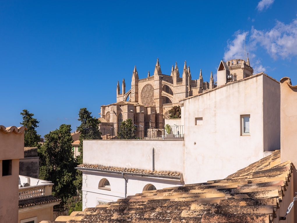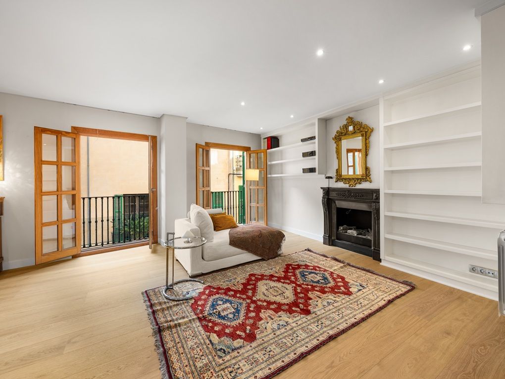 Located in the heart of Palma historic old town, just a few steps from the impressive La Seu Cathedral of Mallorca, this elegant and spacious apartment is situated at one of the island capital’s most sought-after addresses. The living space is distributed across three bright bedrooms, two bathrooms, and a generous living and dining area with five balconies that allow plenty of natural light to flood in, creating an airy and open atmosphere. A fireplace adds a special ambiance to the living room, while parquet floors and high-quality features underline the apartment’s classic charm. The fully equipped kitchen with a separate utility room offers great functionality and comfort. All rooms are fitted with air conditioning (hot/cold), central heating with radiators (city gas), and modern Climalit windows. Particularly noteworthy is the beautiful and typical Mallorcan courtyard at the entrance of the building, which has a small section of the Roman wall of the city of Palma, giving it a very special historical character. A rare bonus in the old town are the two private parking spaces in the building’s own garage, as well as an elevator that ensures convenient and direct access to the apartment. The well-maintained communal rooftop terrace offers stunning views of the sea and partial views of the cathedral – perfect for relaxed evenings with a Mediterranean flair. The location provides close proximity to Palma’s cultural highlights, exclusive boutiques, stylish cafés, and excellent restaurants. The neighborhood around the cathedral is one of the city’s most charming and traditional areas, with cobbled streets, historic buildings, and a unique atmosphere. The property also offers attractive modernization potential – ideal for those looking to combine stylish urban living with room for personal design.