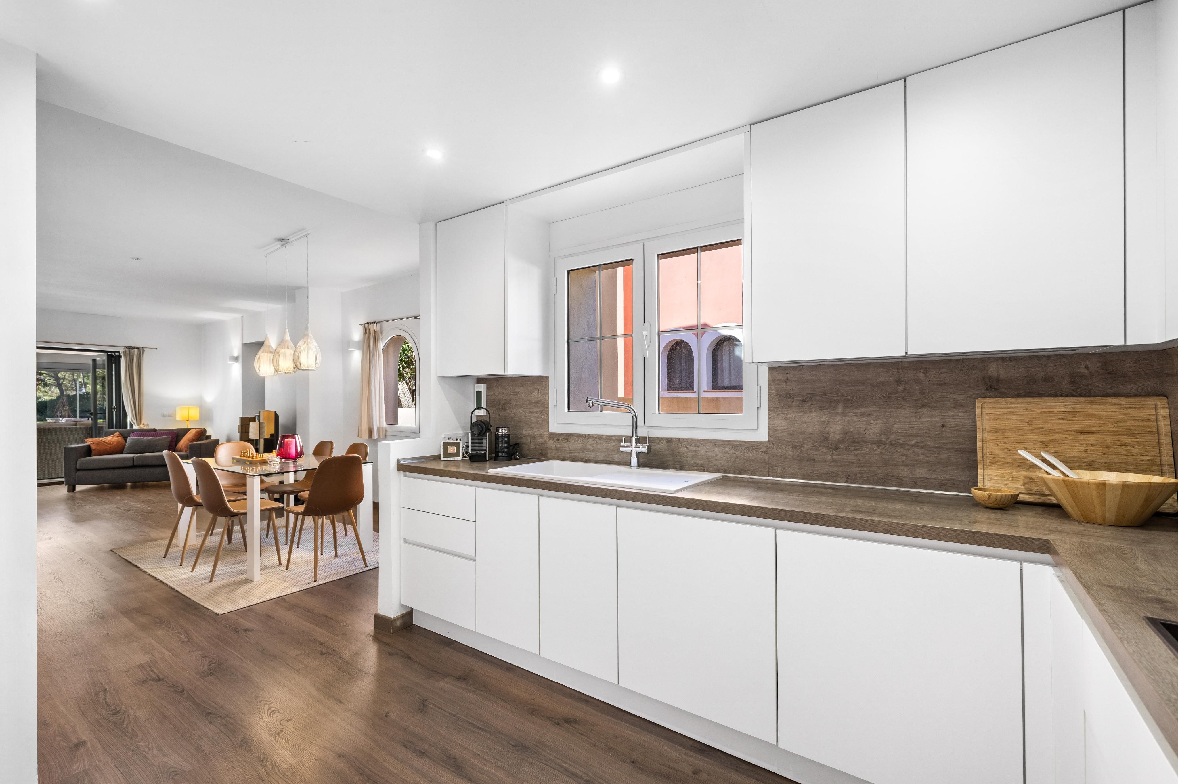 This exceptional villa for sale in Nova Santa Ponsa is located in an exclusive frontline golf community, offering a rare combination of privacy, modern comfort and a prime location directly on the golf course in Mallorca’s sought-after southwest. Set within a peaceful, well-maintained gated development, the property enjoys direct views over the green fairways, creating a wonderful sense of space and tranquillity. With a built area of approx. 195 m², the villa is perfectly designed for relaxed Mediterranean living. The bright open-plan living and dining area with integrated kitchen creates a welcoming atmosphere, while large windows provide abundant natural light and connect the interior seamlessly with the garden and outdoor areas. The villa features four bedrooms, three of them with en-suite bathrooms, as well as a guest toilet. Two bedrooms are located on the ground floor, one with direct access to the garden and private swimming pool, making it ideal for guests or comfortable single-level living. Air conditioning throughout and a cosy fireplace ensure year-round comfort. The outdoor area is a highlight, offering a private pool, a spacious garden and plenty of room for relaxing or dining al fresco. Residents also benefit from several communal pools, including a heated indoor pool. Two private parking spaces in a covered carport add convenience and security. The exclusive marina Port Adriano, designed by Philippe Starck and offering fine restaurants, boutiques and water sports, is just a 10-minute walk away. Nova Santa Ponsa is one of Mallorca’s most desirable residential areas, close to beaches, renowned golf courses and international schools.