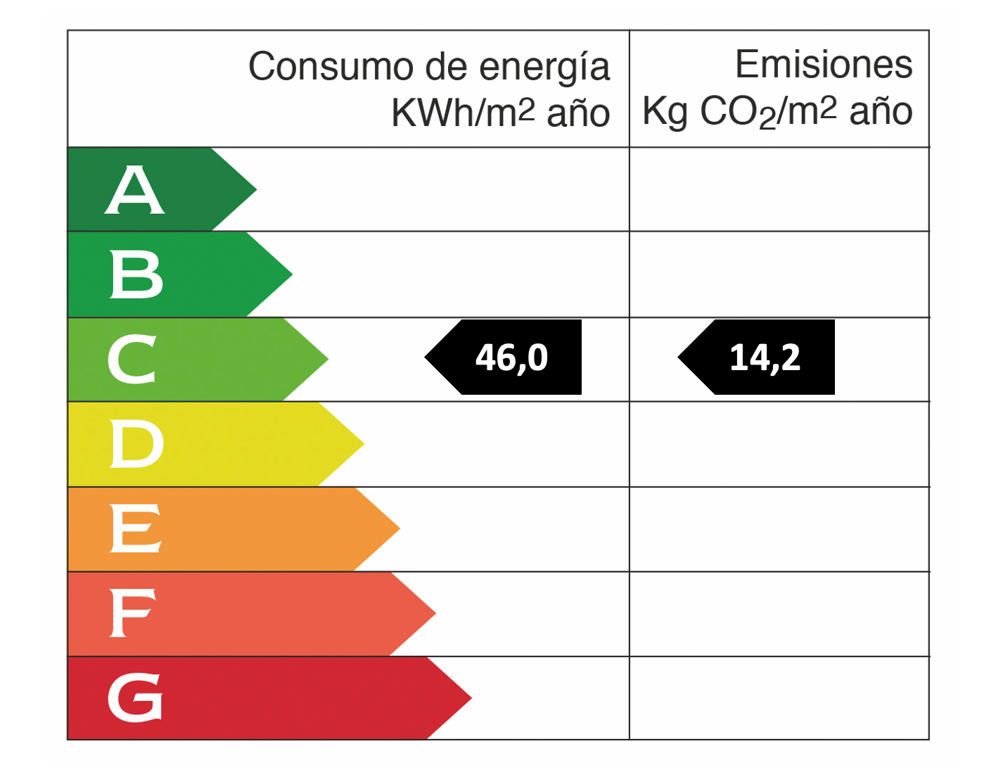 • Energy consumption value: 46.0 kWh/(m2*a) • CO2 emission: 14.2 kg/m2 • CO2 Emission Rating: C • Energy efficiency rating: C