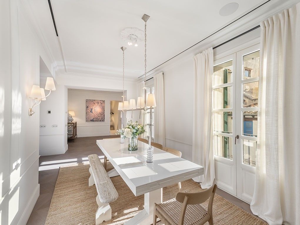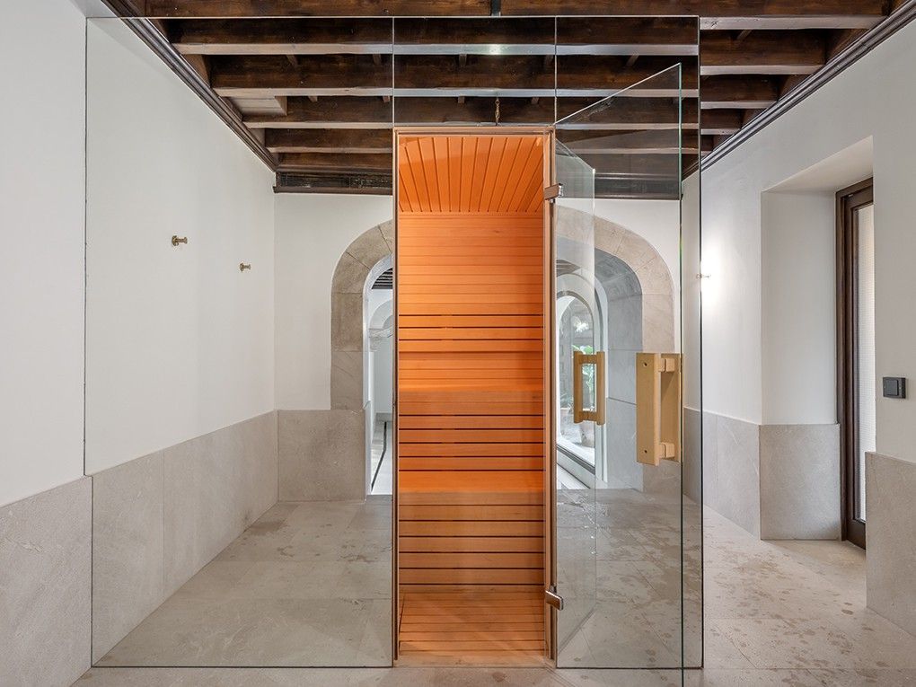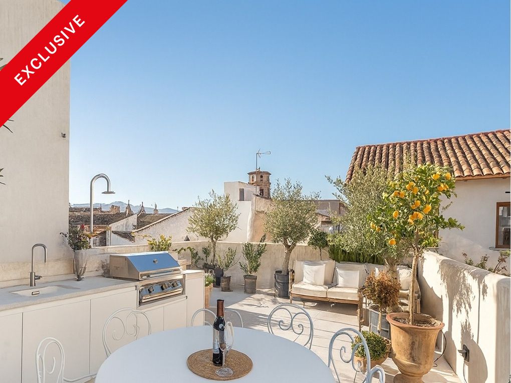 This sophisticated property is in a city palace that was completely renovated a few years ago. Access is provided through the historic entrance courtyard with enchanting arches. This light-filled apartment spans two floors and features, on the entrance level, a spacious living and dining area with an integrated kitchen, a bedroom with an en-suite bathroom, two guest WCs, and a utility room. The lower level includes a bedroom with its own en-suite bathroom and a connecting room, currently used as a TV lounge, which can be utilized flexibly. From here, you have access to the outdoor area. A staircase leads to the sunny terrace with a lounge and dining area as well as a summer kitchen. An outdoor shower provides refreshment during the warmer months. Enjoy relaxing hours under the open sky, unwind with a glass of wine, or spend sociable evenings in a stylish setting. The features of this elegant residence include central air conditioning (hot/cold), underfloor heating and Sonos speaker. A private parking space in the building adds to the living comfort. The communal areas offer an exclusive spa area with an indoor pool and steam bath, as well as a modern fitness studio. Admire the facade of Can Santacília and look back on over 400 years of history. In these walls lived important figures of the 16th century. The Santacília family was one of the well-established Mallorcan noble families who decided to build a residence over several generations that would bear their family name, reflecting their social status and style. Immerse yourself in the history of this magnificent city palace and make this architectural jewel your home – a unique place where historical elegance meets modern comfort, right in the heart of a vibrant metropolis. A true luxury retreat.