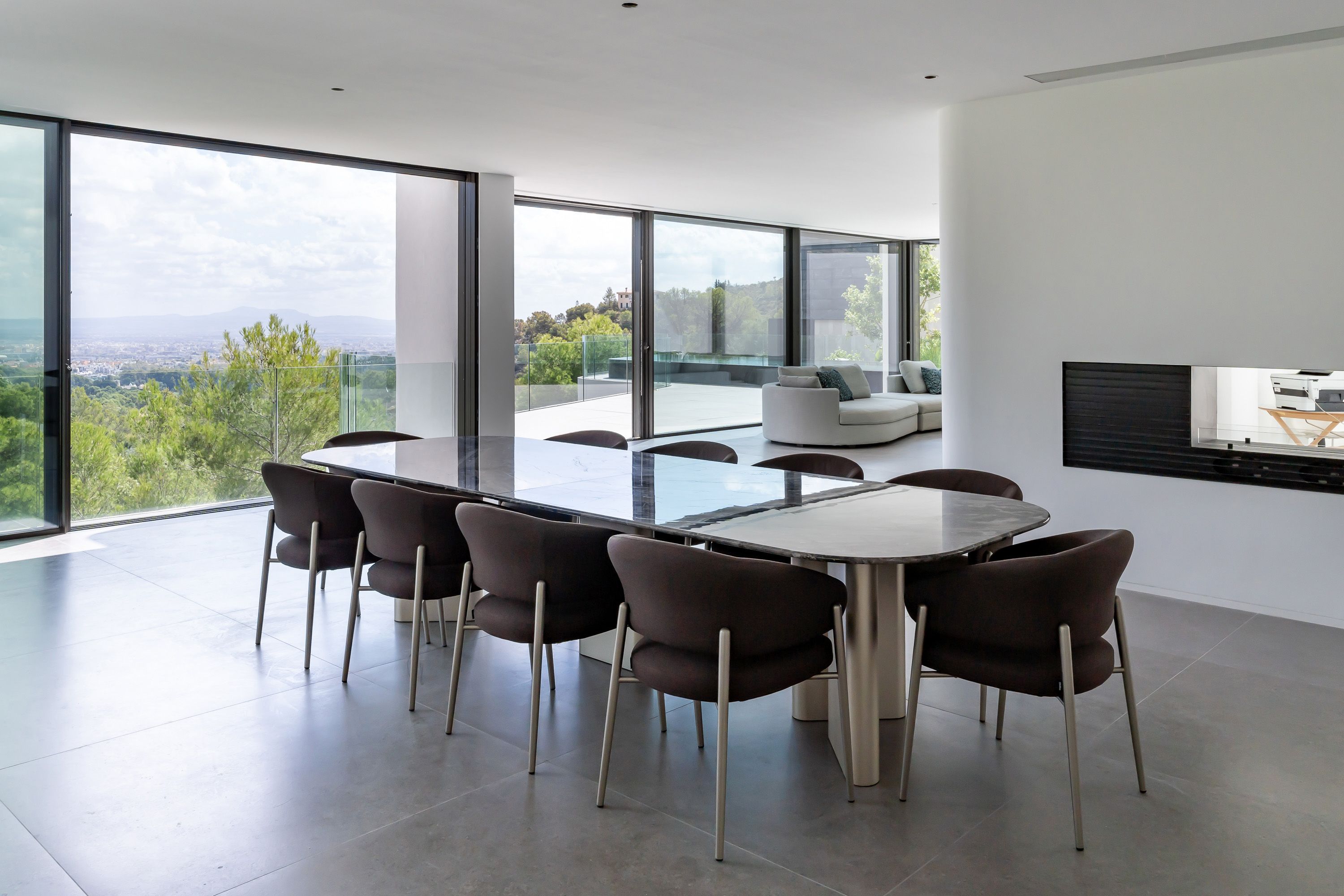 Spanning approx. 825 m² of living space, the villa seamlessly blends modern design with the utmost comfort and a Mediterranean lifestyle. The driveway leads directly to the double garage, and an elevator or staircase takes you comfortably to the main floor. Here, you will find a spacious, light-filled living and dining area complete with a contemporary open-plan kitchen, an elegant fireplace and a study. Expansive terraces and a 55 m² pool create the perfect setting for relaxing hours under the Mallorcan sun.