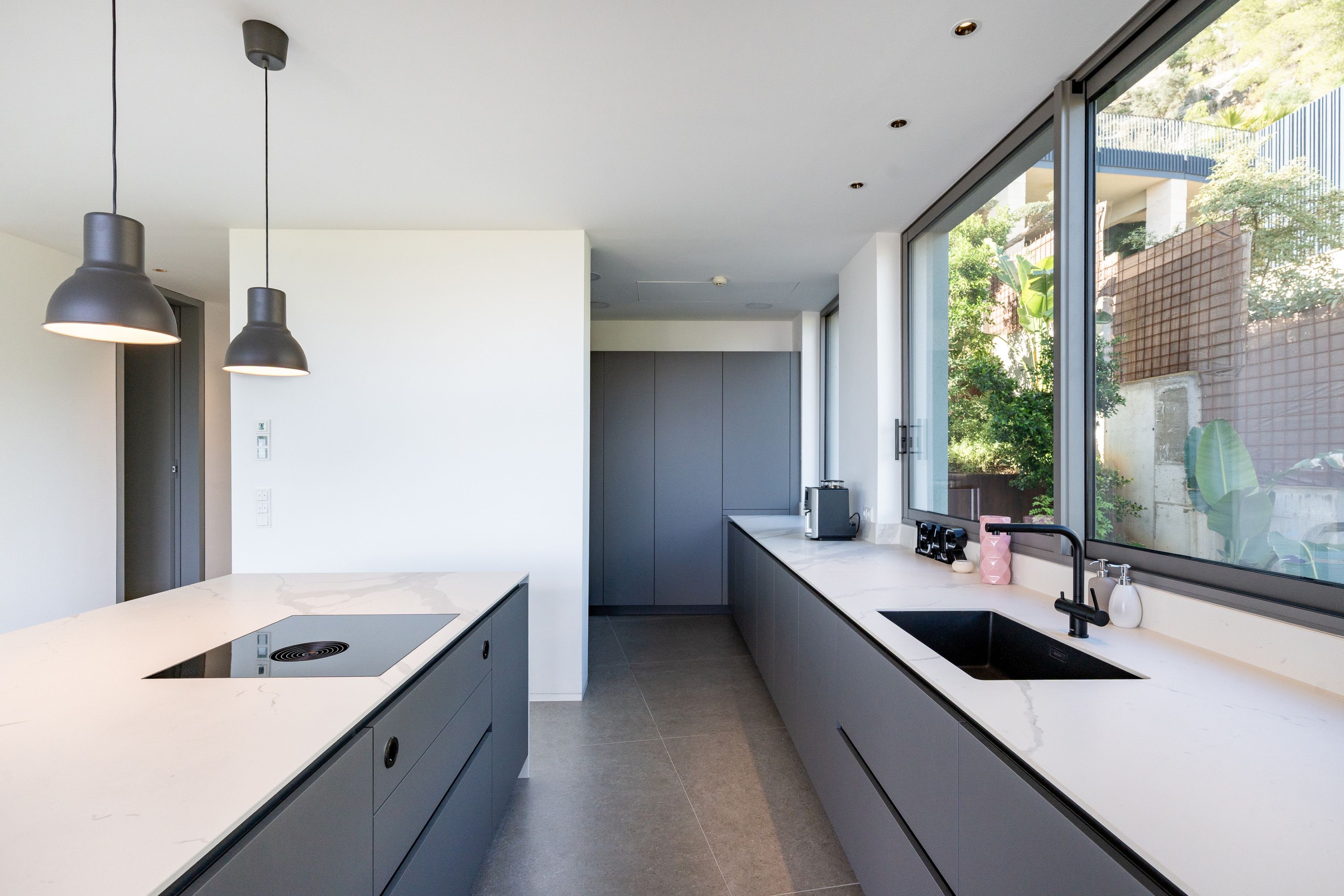A private driveway leads to the main entrance and the double garage. Inside, the entrance hall flows seamlessly into an inviting dining area with a spacious open-plan kitchen, while the bright and generous living room is situated on the same level. All rooms open onto a large, covered terrace that affords breathtaking panoramic views of Palma and the sea. A guest WC rounds off this floor. A lift provides convenient access to all levels.
