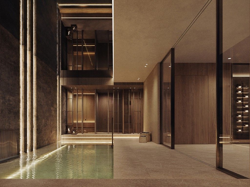 The villa is complemented by an 18 metre long pool and spacious, covered terraces. The design is characterised by open and transparent spaces. The large glazed entrance area with double-height ceilings welcomes visitors to this architectural masterpiece.
