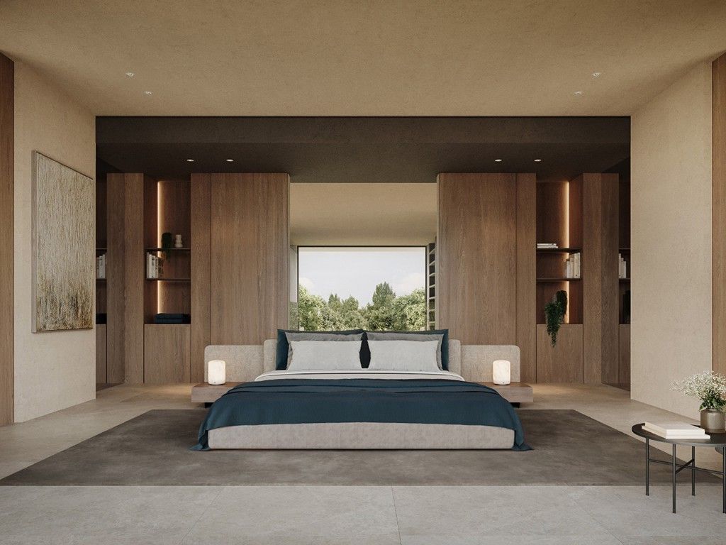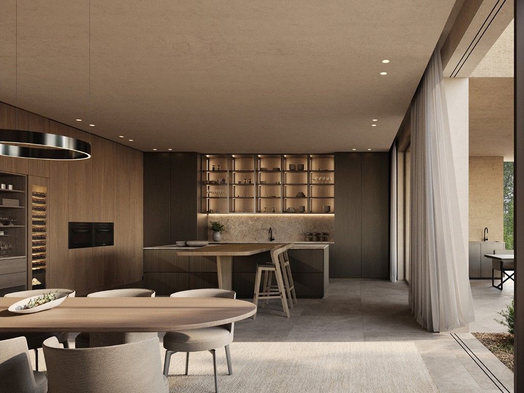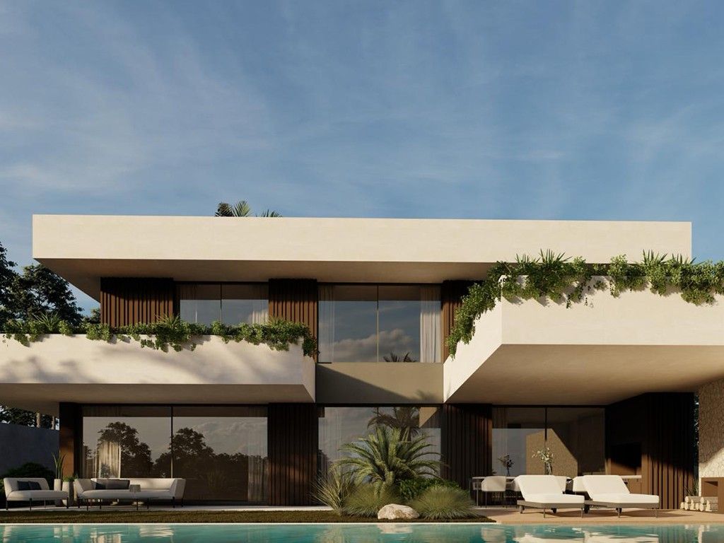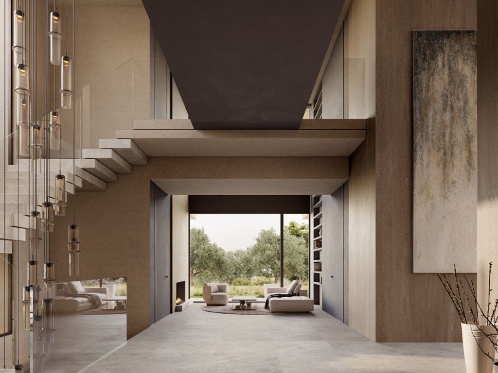 The project has two façades: The main façade faces south-east and houses the living area with a large living room, kitchen and dining area separated by a fireplace, from here you can access the impressive terraced gardens with a large pool. The master suite with dressing room, en-suite bathroom and two balconies is located on the upper floor.