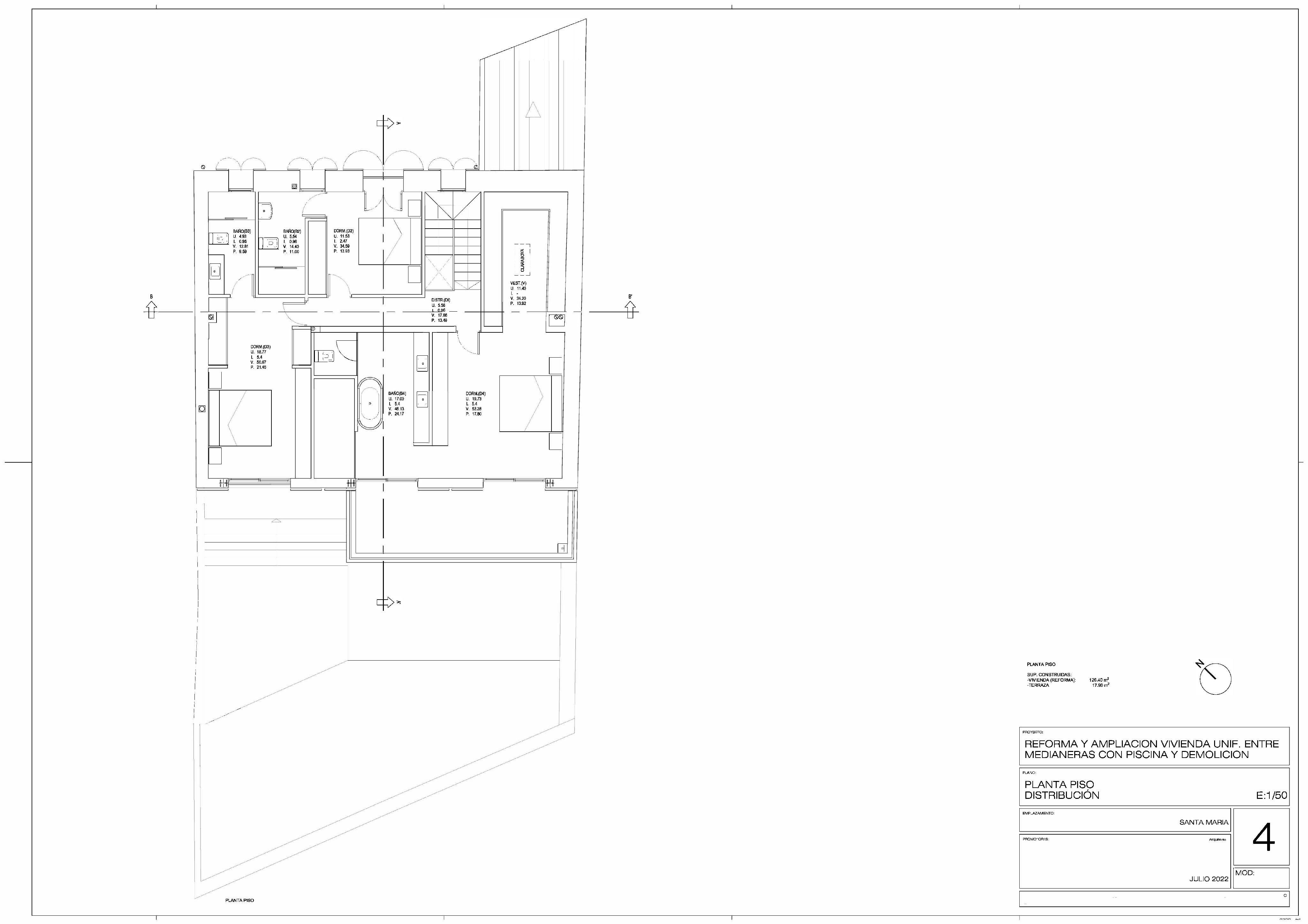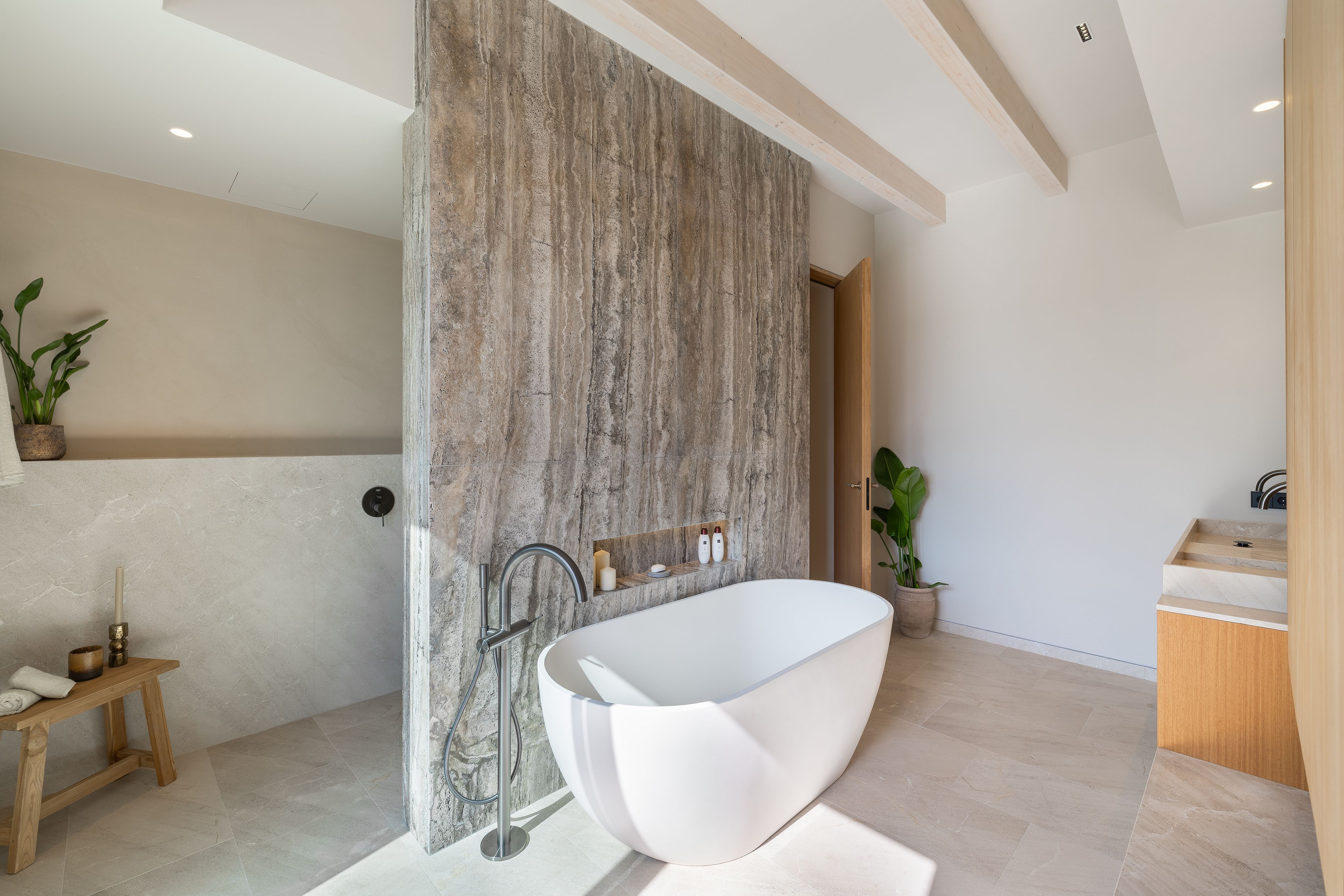 The upper floor hosts three bedrooms with en-suite bathrooms, including the master suite with walk-in closet, modern bathroom, and private terrace, offering panoramic views of the garden and the Santa Maria landscape.