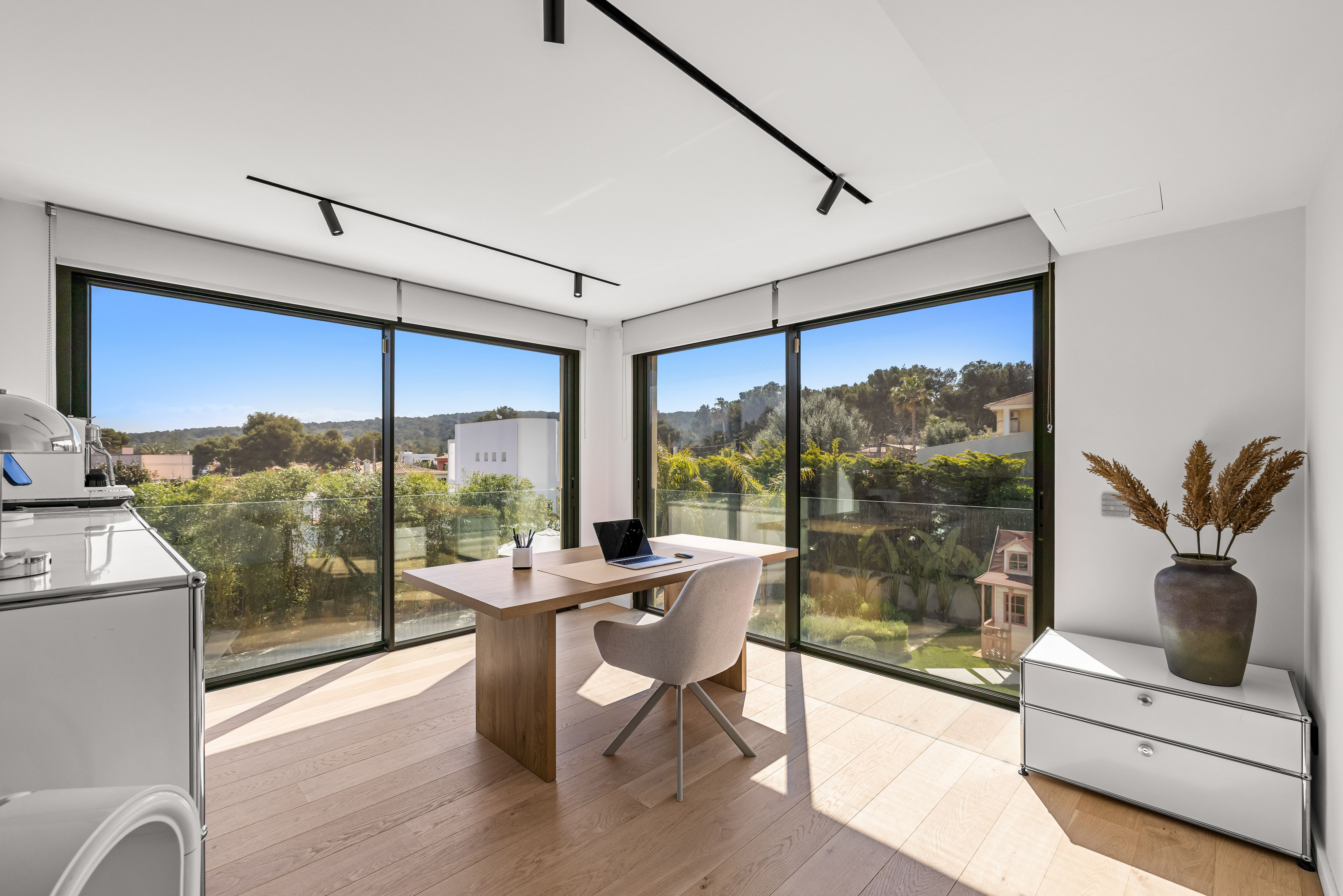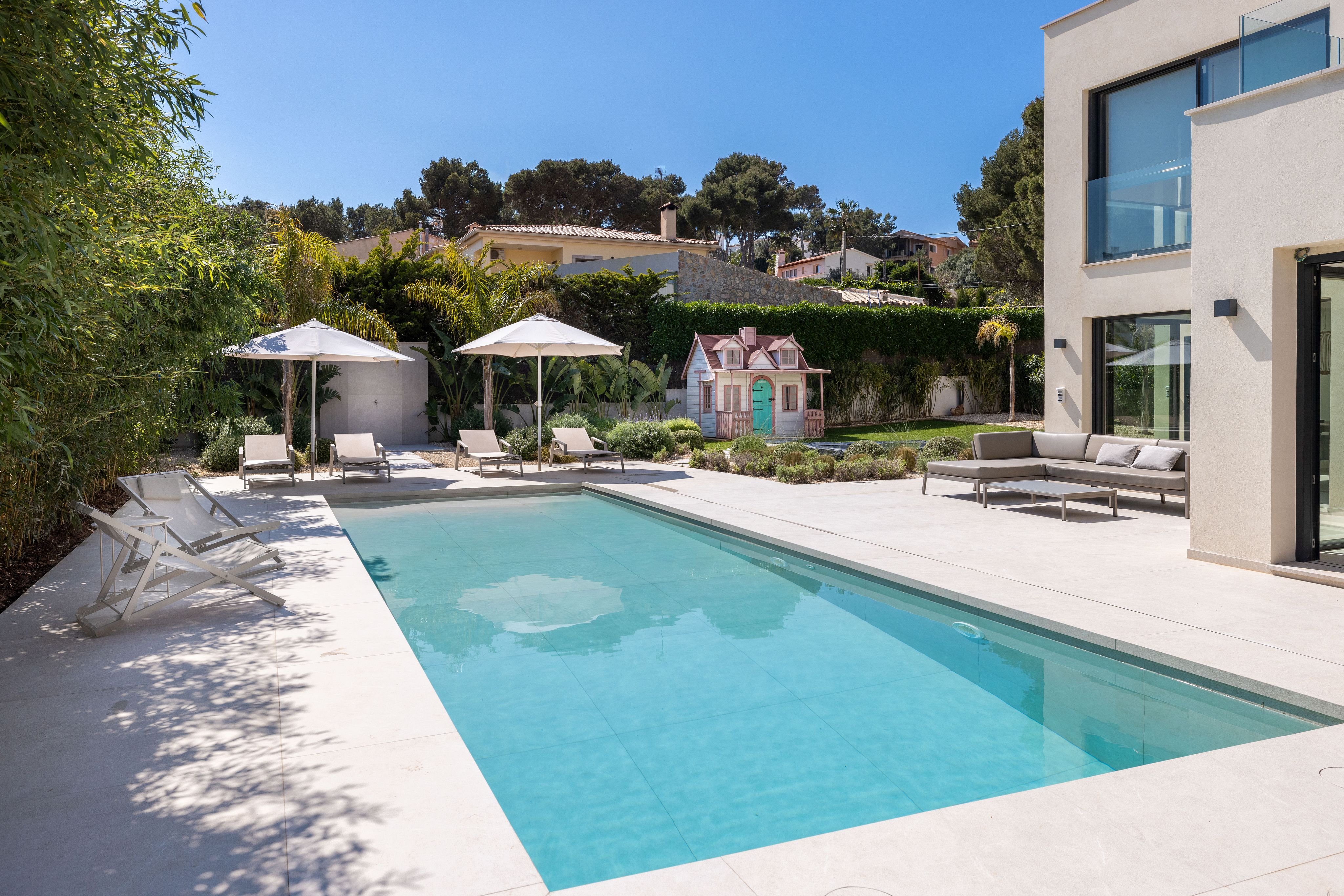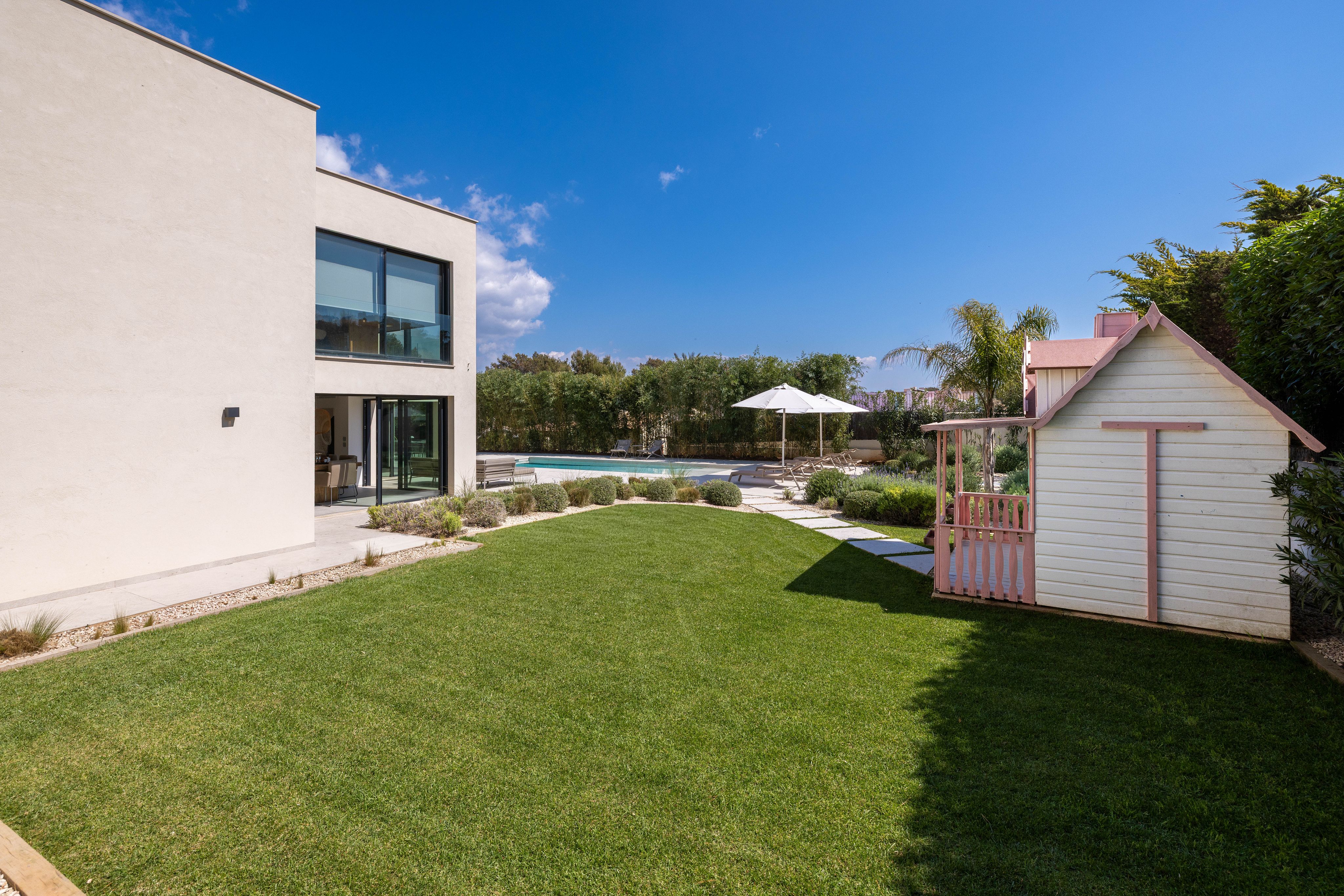 This detached, exclusive villa on a 1,000 m² plot in El Toro impressively combines luxury, comfort and privacy. The spacious property extends over two levels and offers a total built area of 400 m², complemented by generous terrace spaces. The ground floor features an open-plan living and dining area, a modern designer kitchen with a large island and integrated bar area, one bedroom with en-suite bathroom, a utility room, bodega, guest toilet, and a separate entrance area. The covered and open terraces invite you to relax and enjoy. On the upper floor there are four additional bedrooms, each with access to the large open terraces. The master area impresses with approx. 100 m², comprising two bedrooms, a spacious bathroom and a separate dressing room. The outdoor area includes a 34.71 m² swimming pool, inviting terraces, well-maintained lawns and exotic landscaping that ensures maximum privacy. Parking for up to four vehicles is also available. The garden and pool benefit from a sunny south-facing orientation throughout the day. The villa stands out due to its very high construction quality, premium features and a well-thought-out layout, making it ideal for families as well as regular guests. The location is particularly attractive: Just a few minutes away is the popular Port Adriano marina with restaurants, bars, boutiques, a water sports school and a sandy beach. A viewing of this exceptional villa is highly recommended. Contact us for further information or to schedule a private appointment.