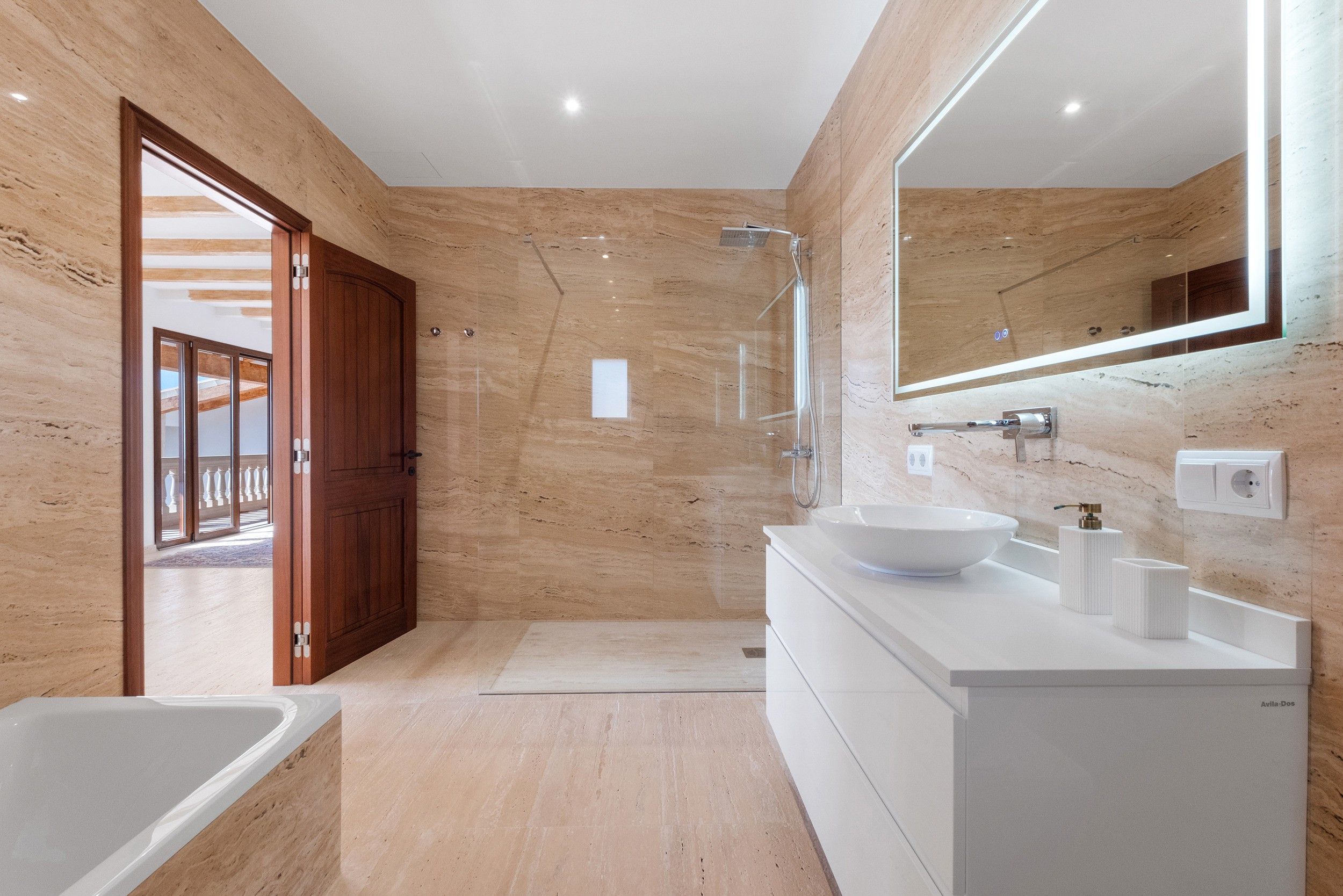 The upper floor is home to the luxurious master suite and two generously sized double bedrooms, each with an ensuite bathroom. The lower floor, which opens directly onto the pool area, hosts two additional guest bedrooms with ensuite bathrooms, as well as a self-contained apartment - ideal for guests or staff.