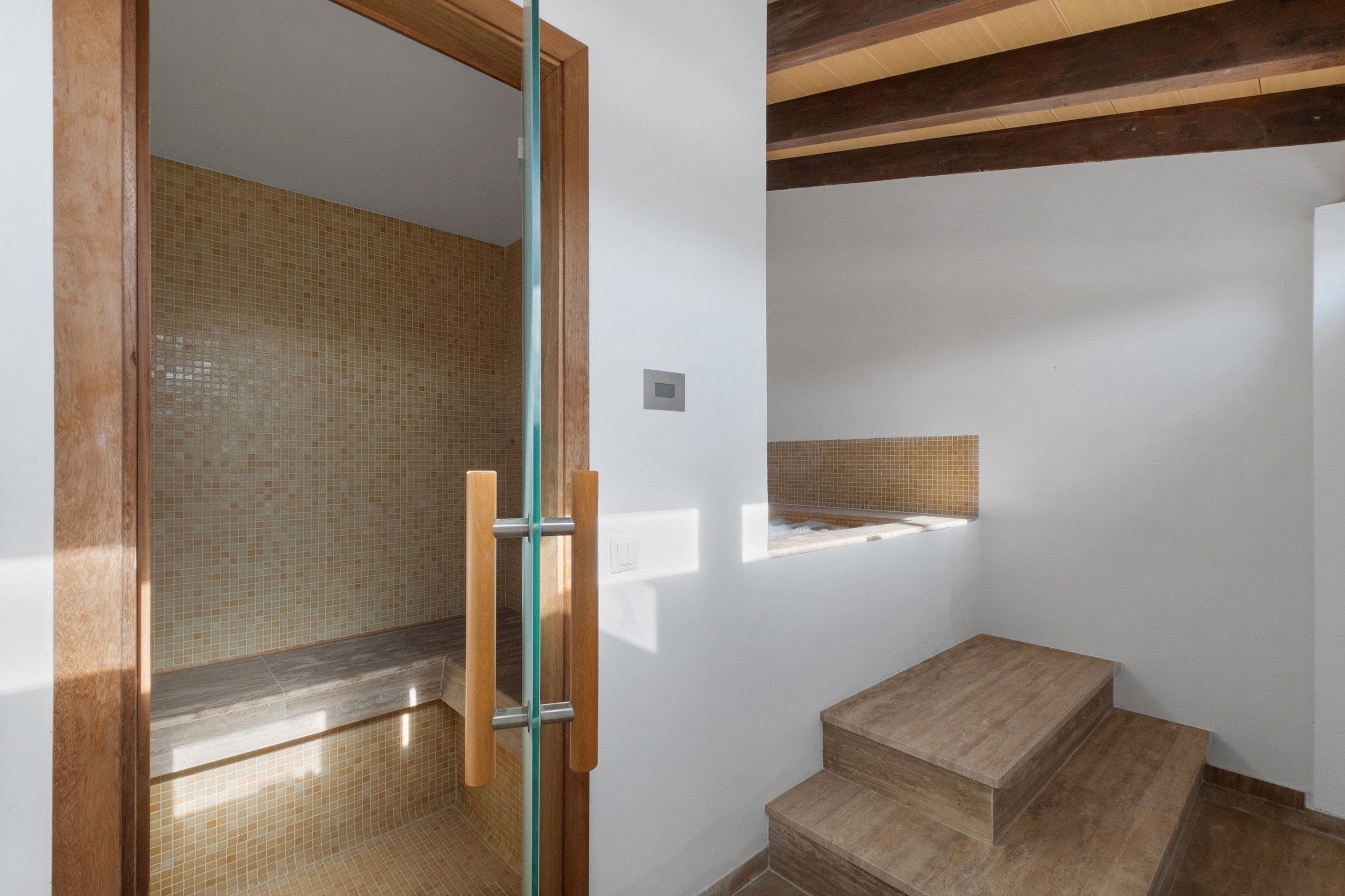 The ground floor features a grand living room with an open fireplace and soaring beamed ceilings, flowing effortlessly onto an immense covered terrace that showcases spectacular sea views and creates a seamless indoor-outdoor living experience. An adjoining dining room, a well-appointed kitchen, a home office, and a guest toilet complete this level, all arranged around a spacious central patio that enhances natural light and provides a cooling ambiance.