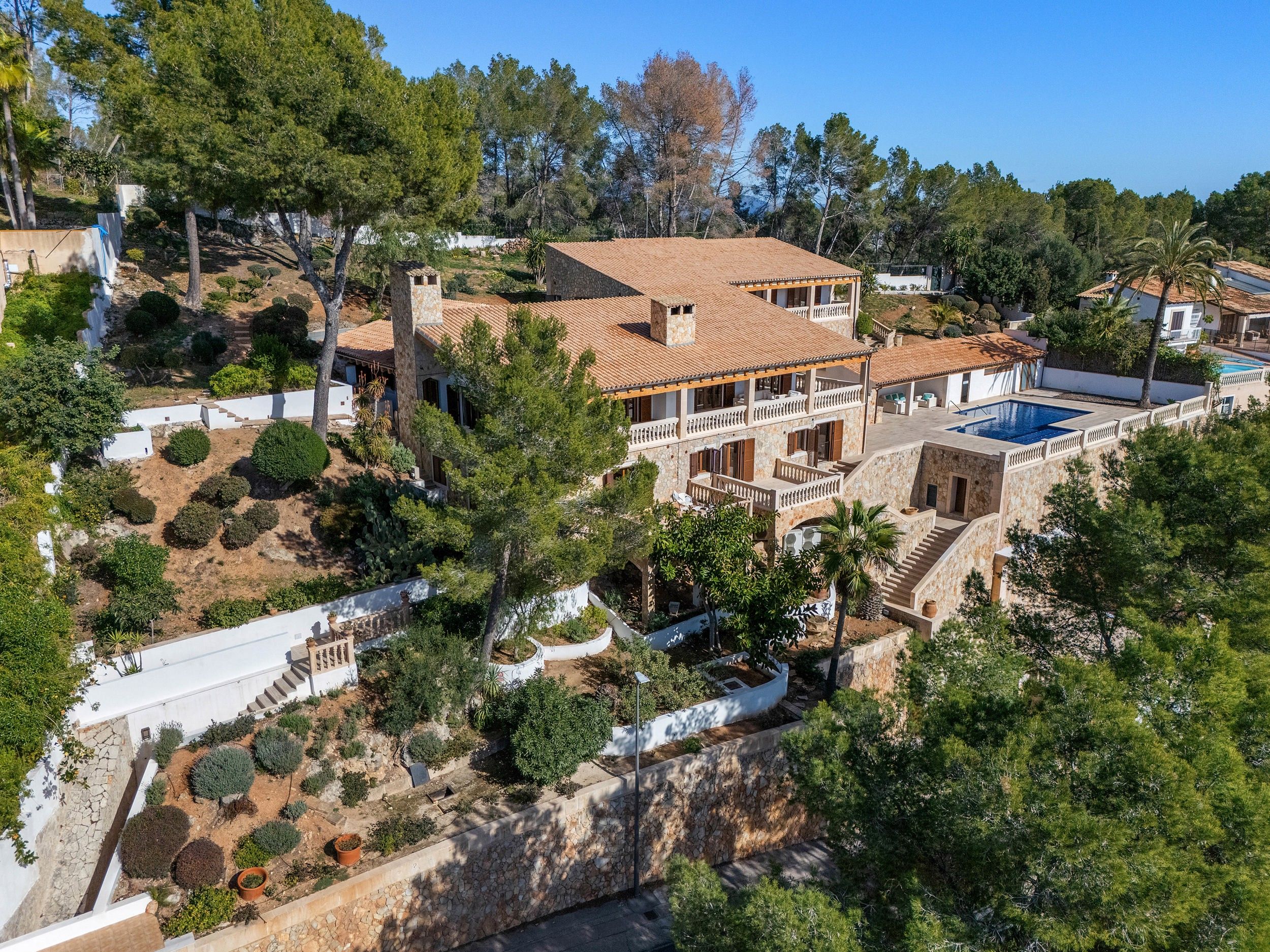 Type: House • Region: Son Vida & Palma Surroundings • Construction year: 1970 • Last restoration: 2024 • Total surface: 645 ㎡ • Bedrooms: 6 • Bathrooms: 6 • Plot size: 2,948 ㎡ • Parking: 5 • Terrace • Fireplace • Swimmingpool • Guest toilet • Heating: Underfloor heating, Split air-conditioned • Heating type: Heat Pump • Floor type: Stone
