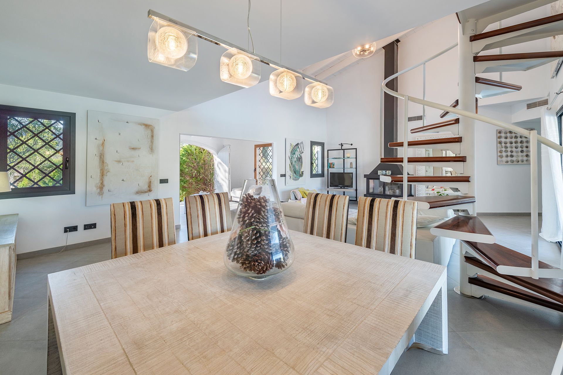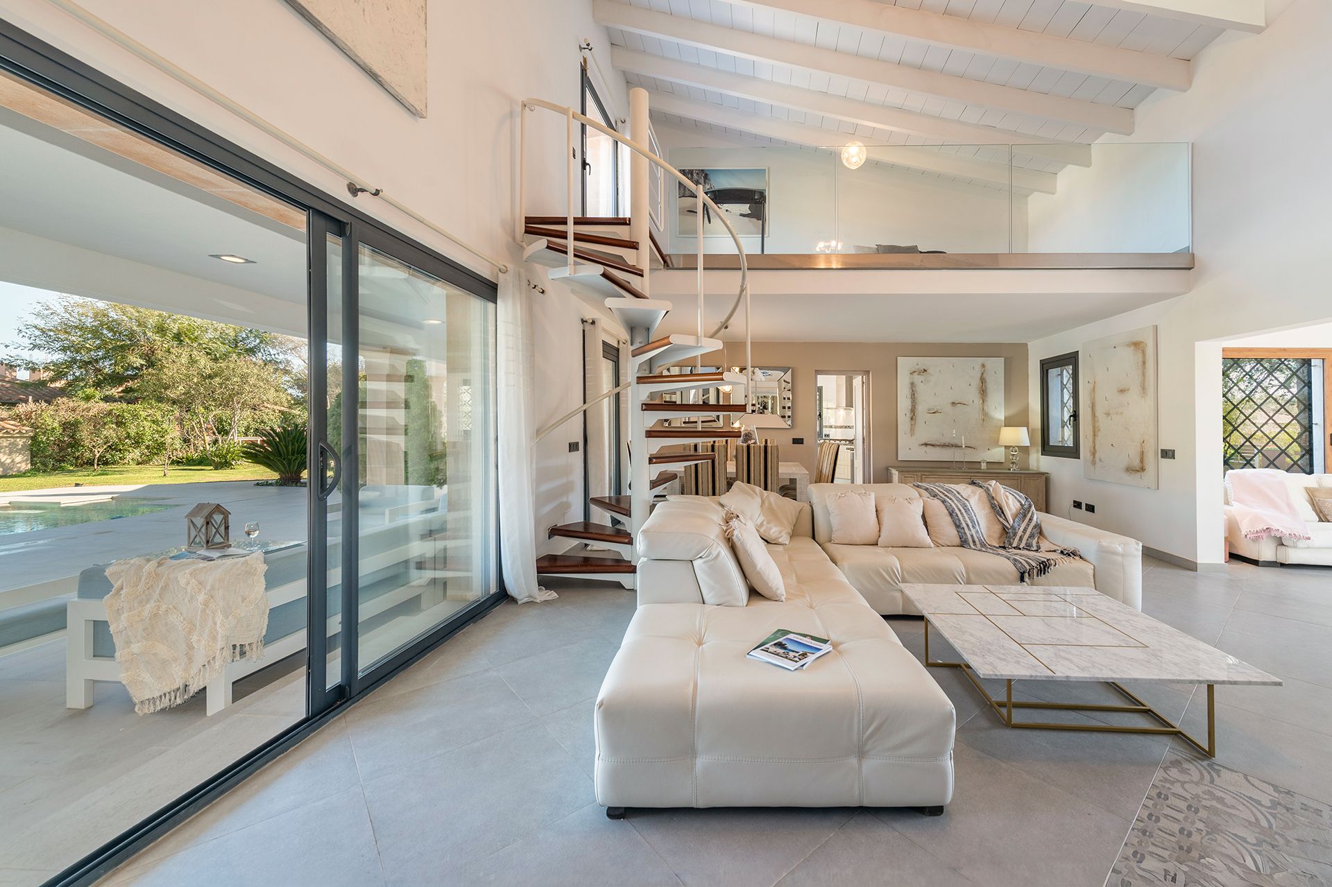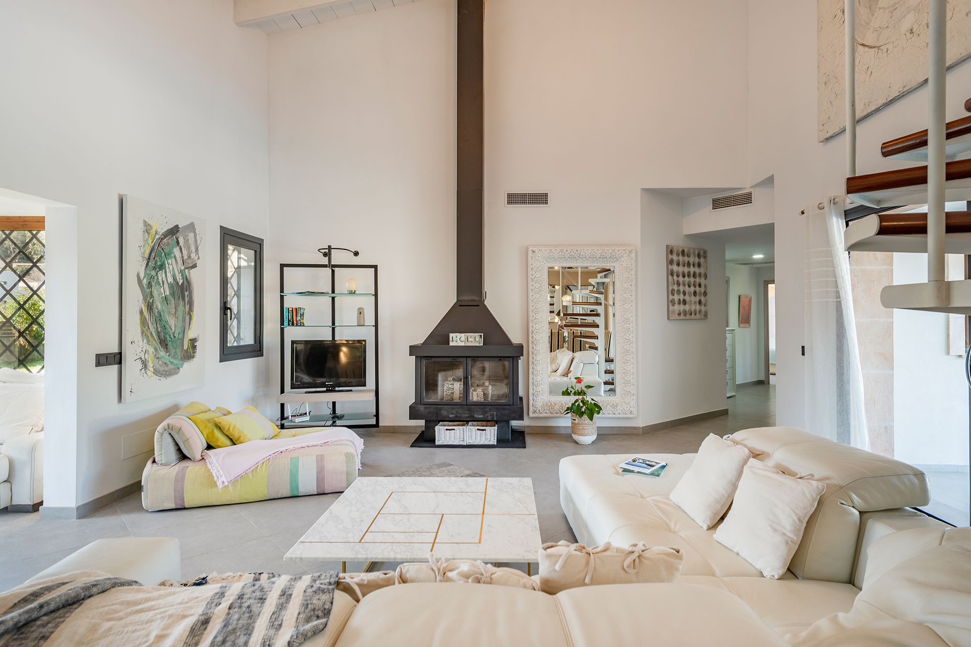 The home features a spacious living room with a fireplace, high ceilings, and a mezzanine that adds character to the space, perfect as a fitness area, office, or relaxation corner. From the living room, there is direct access to the outdoors, creating a seamless flow between indoor and outdoor spaces.
