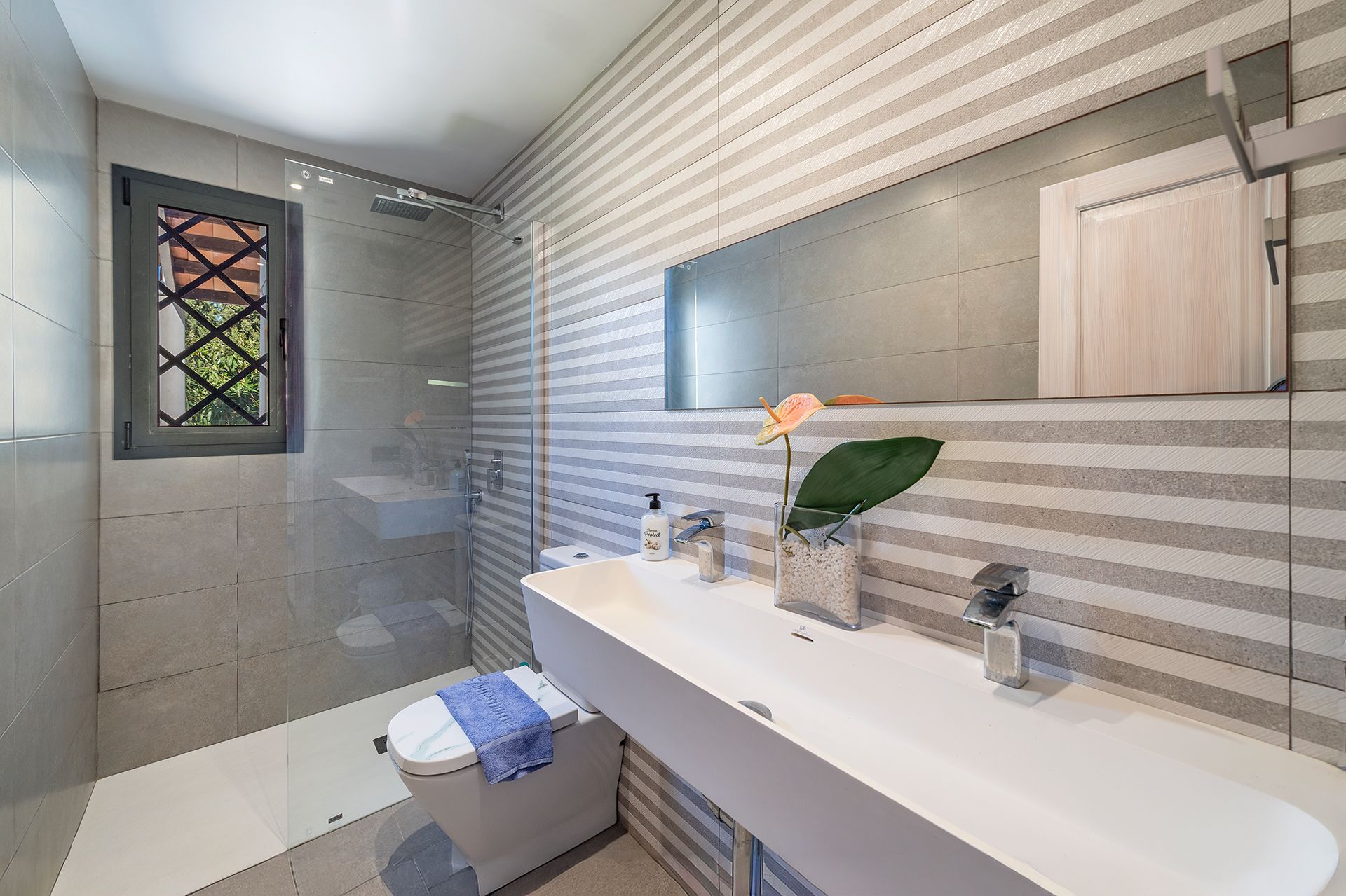The sleeping area is well defined and offers four bedrooms, two of which are doubles with matrimonial beds. The master bedroom stands out with a walk-in closet and an en-suite bathroom. Additionally, the property includes a bedroom with a single bed, a full bathroom with a shower, and a fourth bedroom with an en-suite bathroom and bunk beds—ideal for families with young children.