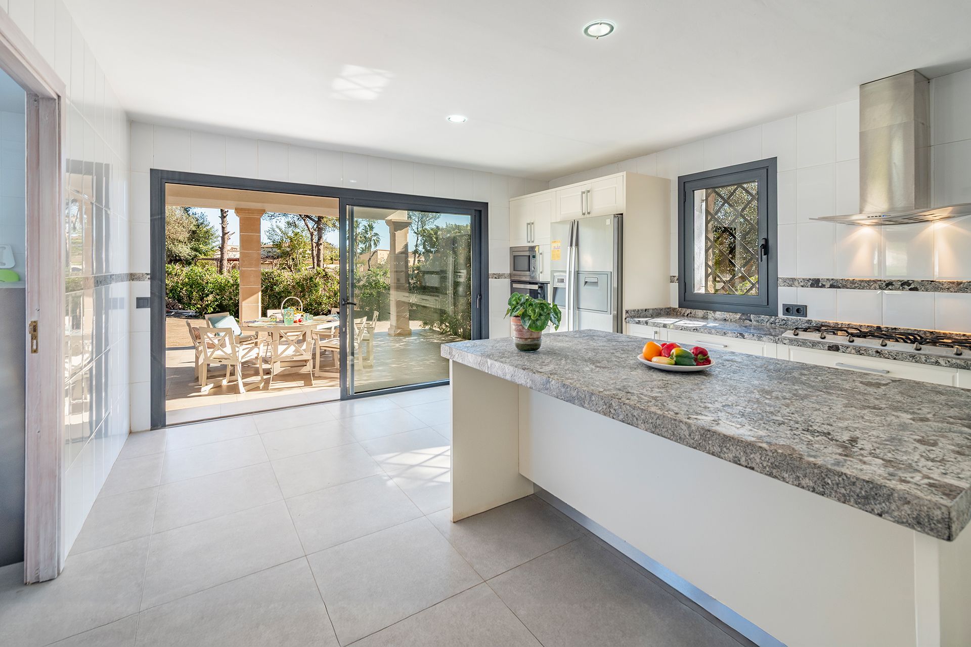 The generously sized kitchen includes a pantry and a separate laundry room, and also provides direct access to the porch and barbecue area.