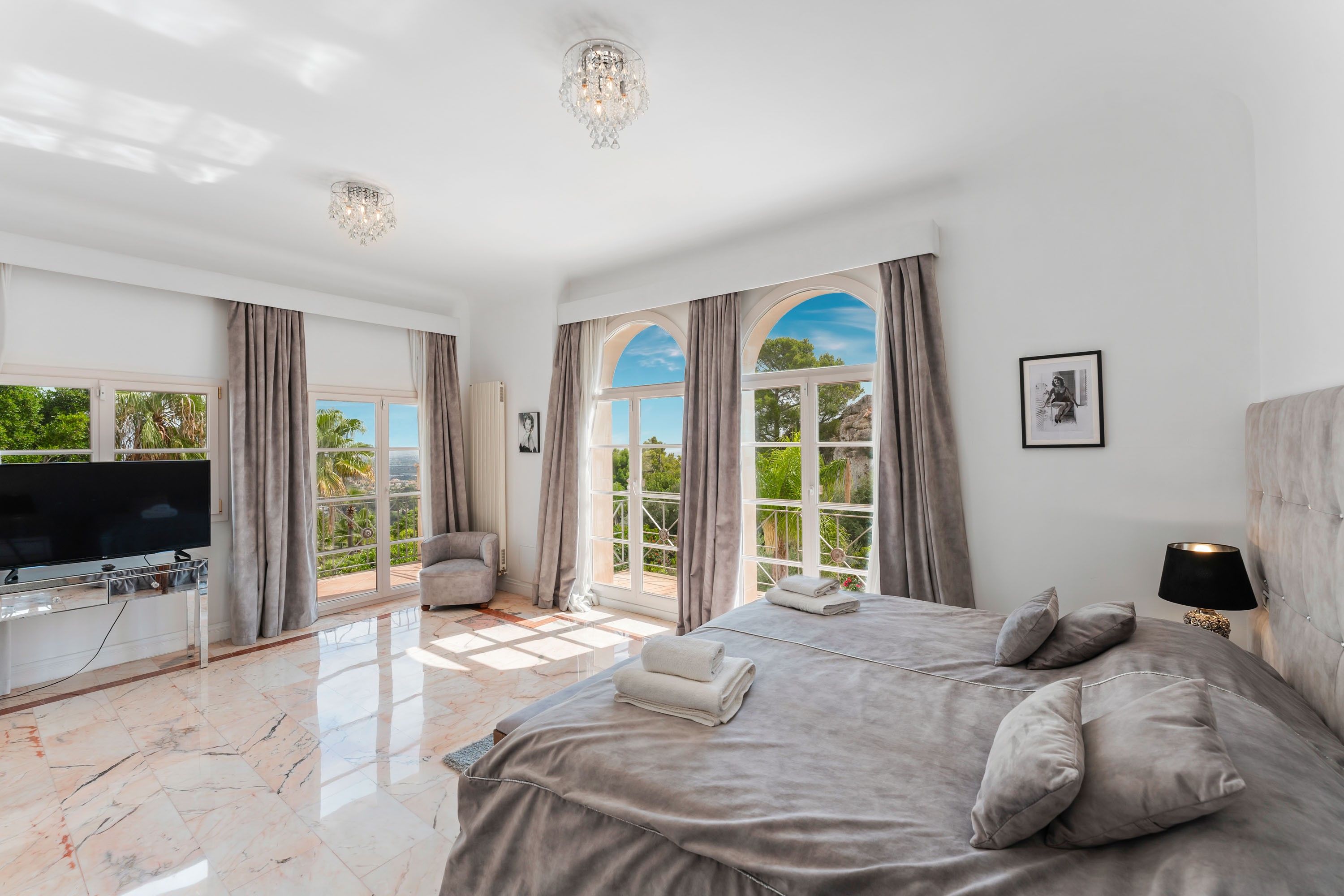 This villa, built in 2003, is situated on a 2,290 m2 plot and is distributed over three floors, a large garden and various terraces. Access to the entrance area is via the top living level. Here you will find the dining room, the fitted kitchen, utility room, double bedroom with en suite bathroom and the master bedroom with en suite bathroom and dressing room. The living level below offers a spacious living room with fireplace, a TV room and three bedrooms with en suite bathrooms. From the main terrace, a staircase leads down to a separate area with a kitchen and a bathroom. This part of the villa would be ideal for a staff apartment. The property also holds a valid holiday rental license. Located in the upper part of Son Vida Hills, this property offers magnificent views of Palma, especially at night. The spacious and flat outdoor area with its orange, lemon and olive trees gives this villa a great Mediterranean atmosphere. Son Vida is the most exclusive residential area of Palma de Mallorca and has a 24-hour security service and two five-star hotels with restaurants, bars and spa, offering their services to the residents of Son Vida. The golf courses of Son Vida, Son Muntaner and Son Quint are only three minutes away by car.
