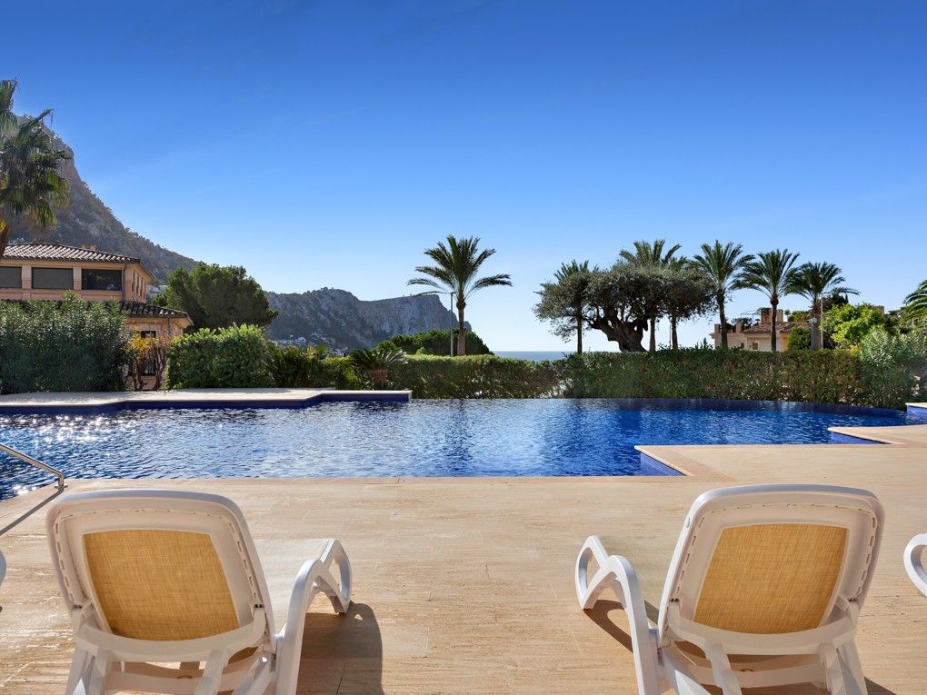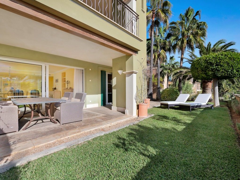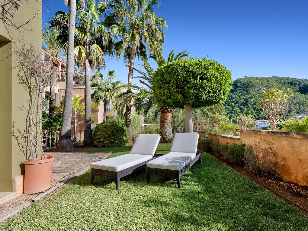 This exclusive apartment is located in Port Andratx, the prominent natural harbour in the southwest of Mallorca. Nestled in the picturesque bay of Cala Llamp, the luxury complex not only offers fantastic sea views, but also a wide range of services: Clubhouse with concierge service, wellness area with sauna, steam bath, fitness, as well as two large outdoor pools and a heated indoor pool with Jacuzzi. The ground floor apartment has two bedrooms with en-suite bathrooms, a living and dining room with fireplace and a separate kitchen with adjoining laundry room. The highlight of the apartment is the spacious terrace with garden. The special features include: air conditioning hot/cold, underfloor heating, elevator and underground parking space.