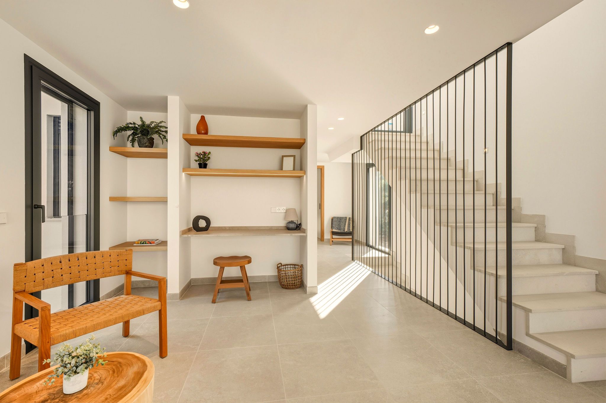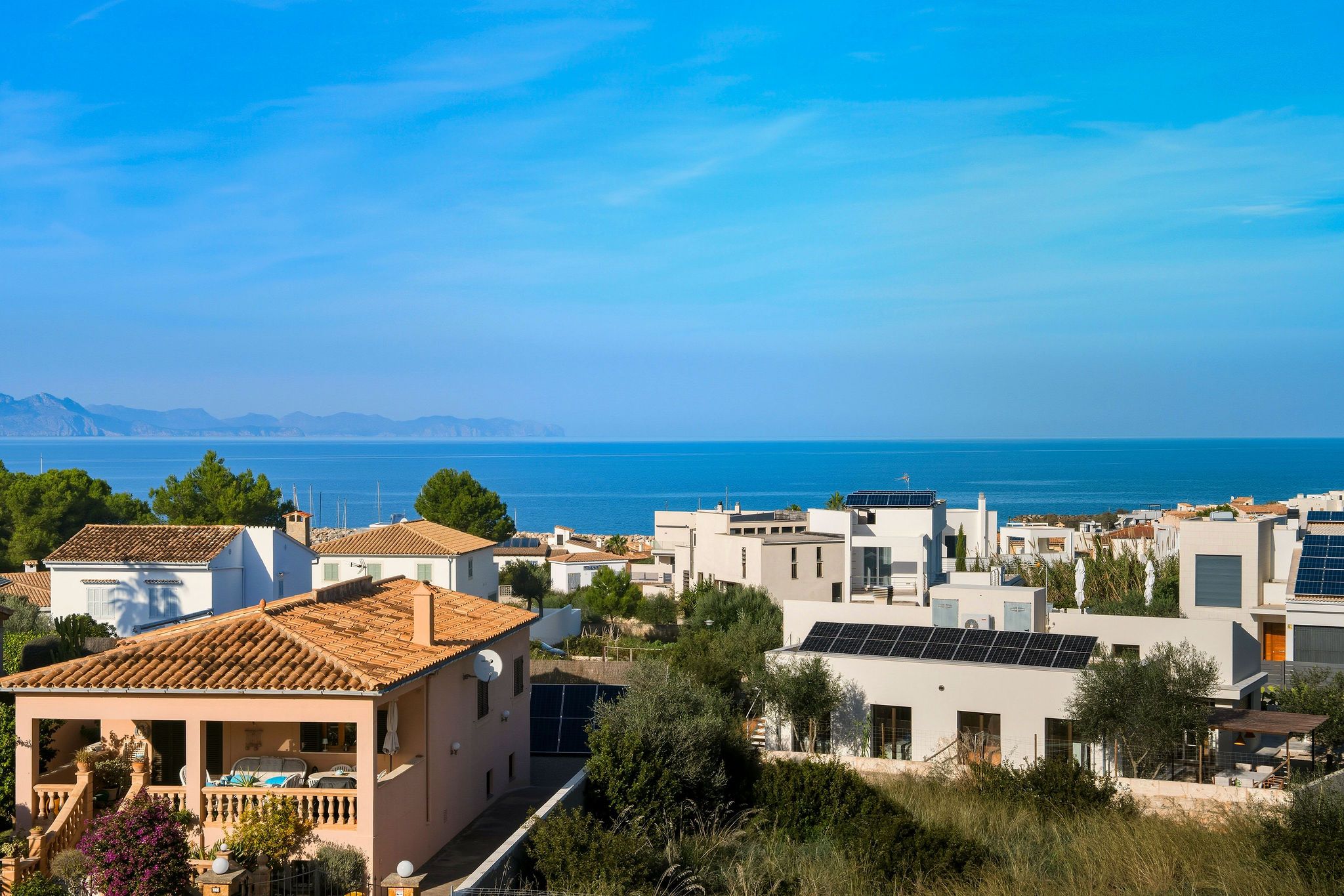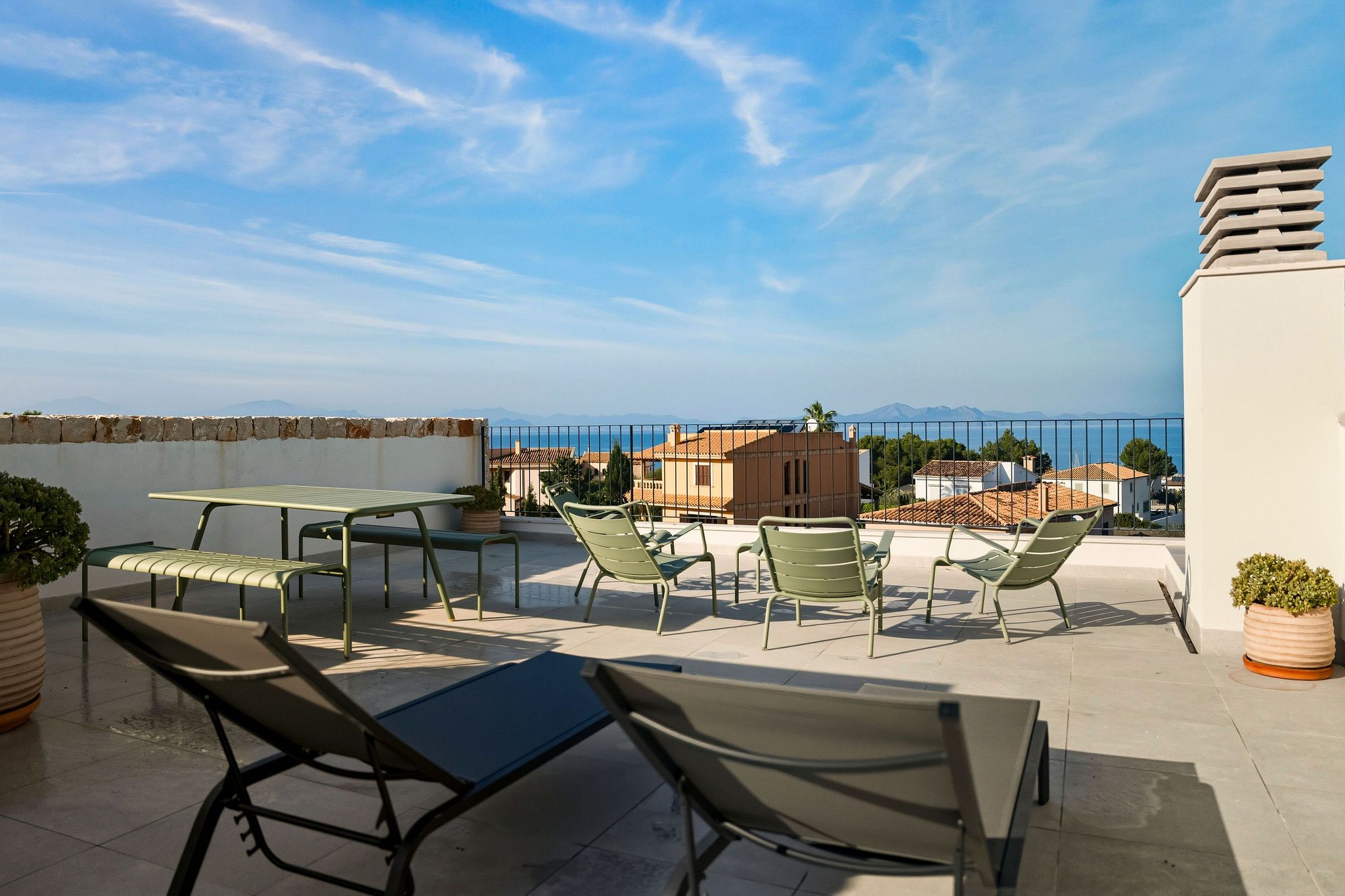 This modern new build family home is located in one of the quietest and most authentic coastal areas of Mallorca, combining clear Mediterranean architecture, high-quality materials, and a light-filled space concept. The privileged orientation without direct neighbors at the front allows for an unobstructed view over the Bay of Alcudia and the Montferrutx mountain range, a panorama that accompanies you every day. On a 425 m² plot, the residence offers around 190 m² of living space, complemented by generous outdoor areas such as a 40 m² pool terrace, a landscaped garden, and an impressive 100 m² rooftop terrace. Large glass sliding doors in the living area (4.4 × 2.6 m) seamlessly connect the interior and exterior spaces, creating a unique, open living experience. A special architectural highlight is the custom-made staircase with handcrafted iron railings, which shapes the interior as a sculptural element. The house has a total of four flexibly usable rooms, suitable as bedrooms, offices, studios, or fitness areas.
