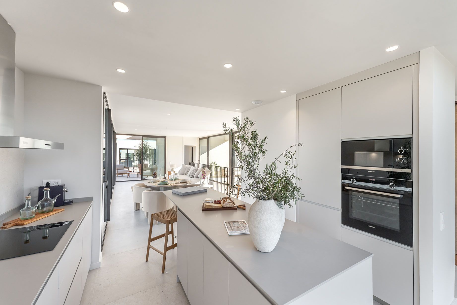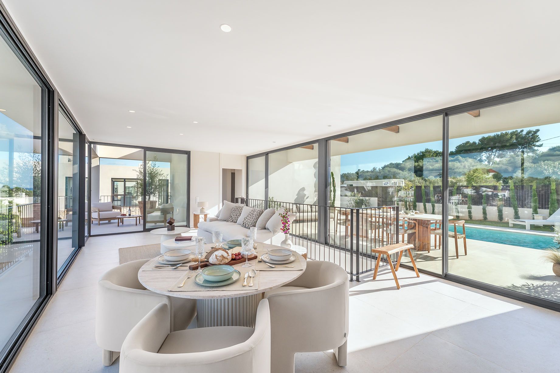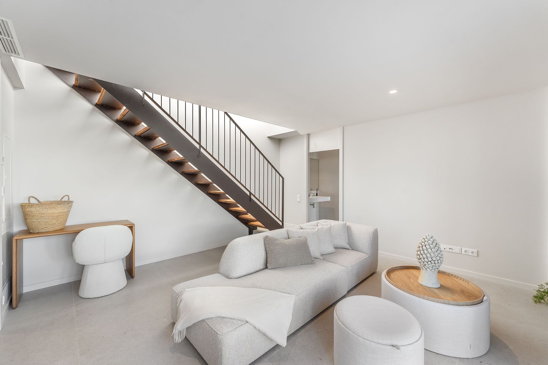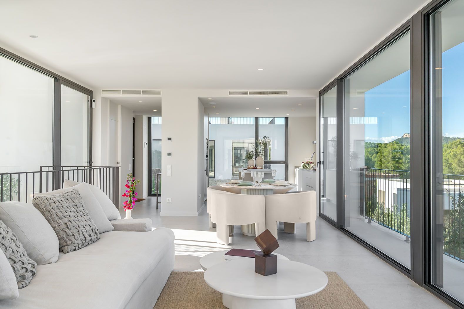 The new-build project “HORIZONZ” consists of 25 high-end villas and is nestled in a magnificent landscape not far from Cala Domingo Bay. Surrounded by a green belt, away from the noise and bustle of the major tourist resorts, this villa complex offers excellent conditions for a relaxing holiday stay, with quick access to all amenities and leisure options. Each villa features a modern, sophisticated ambience and offers owners high-quality materials and fittings. On the upper floor there is a living/dining area with adjoining fitted kitchen and guest WC, as well as a bedroom with en-suite bathroom and walk-in dressing area. The highlight is the covered terrace with a beautiful panoramic view.