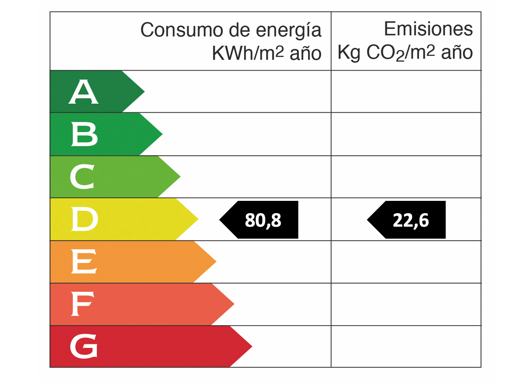 • Energy consumption value: 80.8 kWh/(m2*a) • CO2 emission: 22.6 kg/m2 • CO2 Emission Rating: D • Energy efficiency rating: D