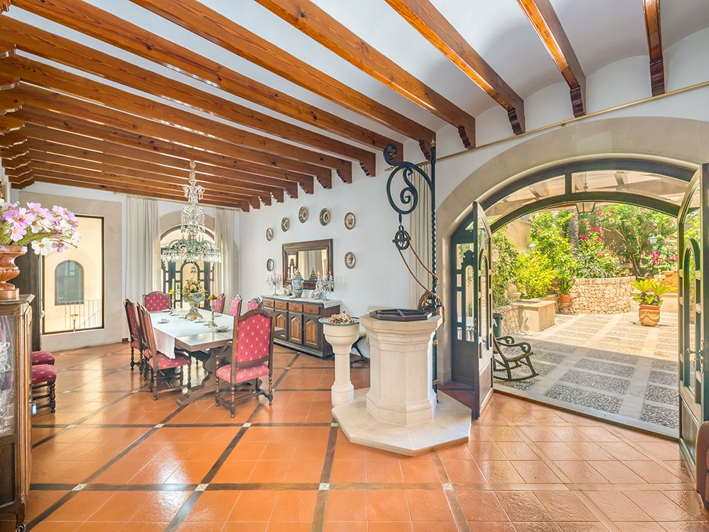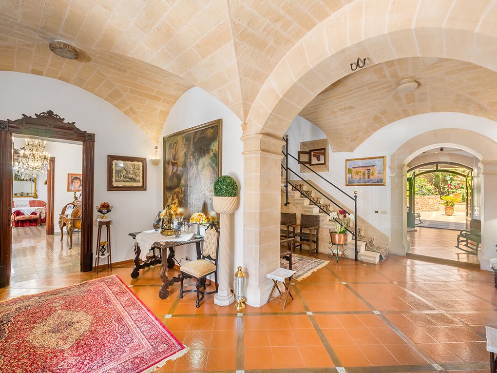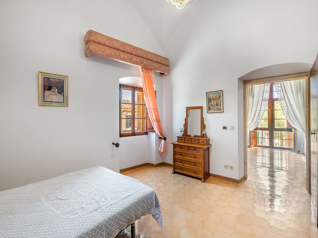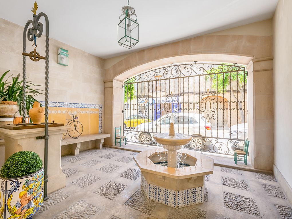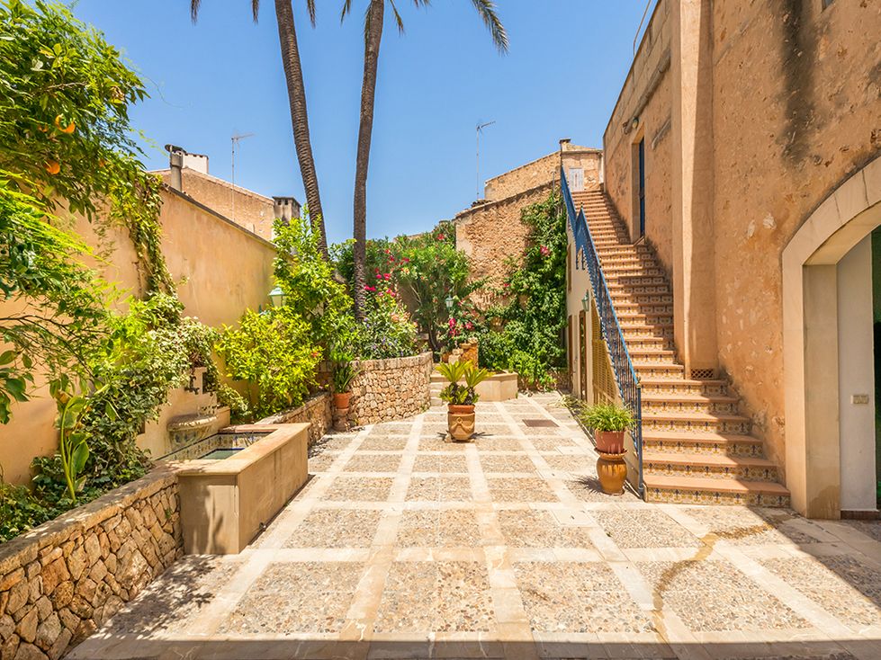 This unique town palace is located in the center of Campos, right on the market square. It extends over three stately floors with typically high ceilings and offers great potential. Upon entering, you will find a spacious entrance hall, from which you have access to the dining room, a kitchen, an office, and two bedrooms with en suite bathrooms. A small patio with water fountain and a large backyard with dining area completes this floor. On the second floor, a spacious reception room impresses with many antique style elements, the bedrooms with well-preserved Mallorcan tiles and the bathrooms recall the brilliance of bygone times. From almost all bedrooms you have access to a huge terrace overlooking the beautiful backyard. The unused second floor as well as the Mediterranean patio leave numerous possibilities for design. From the roof terrace you can enjoy a magnificent panoramic view over the rooftops of Campos. A garage and a large wine cellar complete this property. This sleeping jewel is waiting to be brought back to life with new glamour. In the center of Campos you will find various cafes, restaurants, boutiques and the weekly market. The special feature of this property is that this estate is sold with an adjoining building, which can still be renovated.