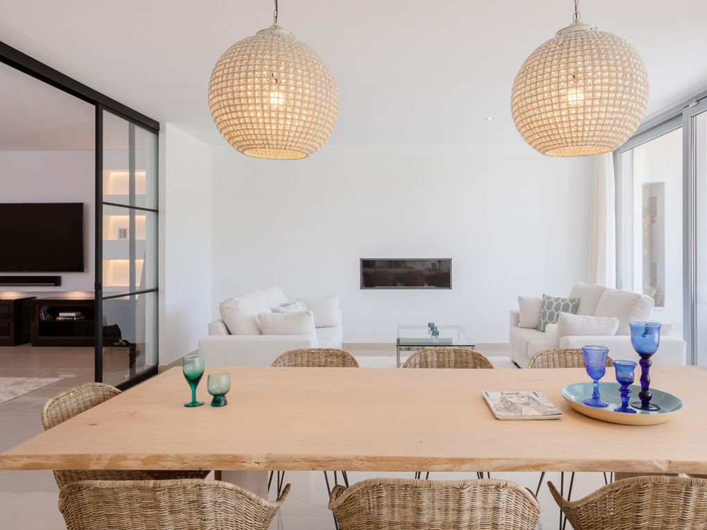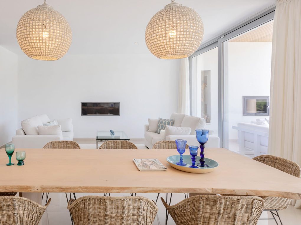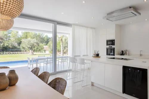 Upon entering, floor-to-ceiling windows fill the home with natural light. Soft lines and white walls create a serene, welcoming atmosphere. The open-plan living, dining, and kitchen area is perfect for family life and entertaining, with direct access to the terrace and pool.