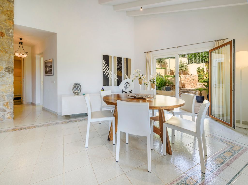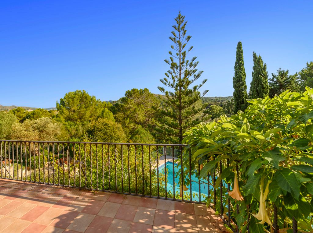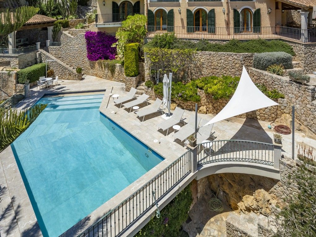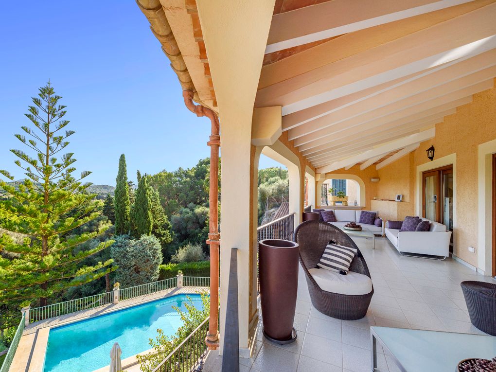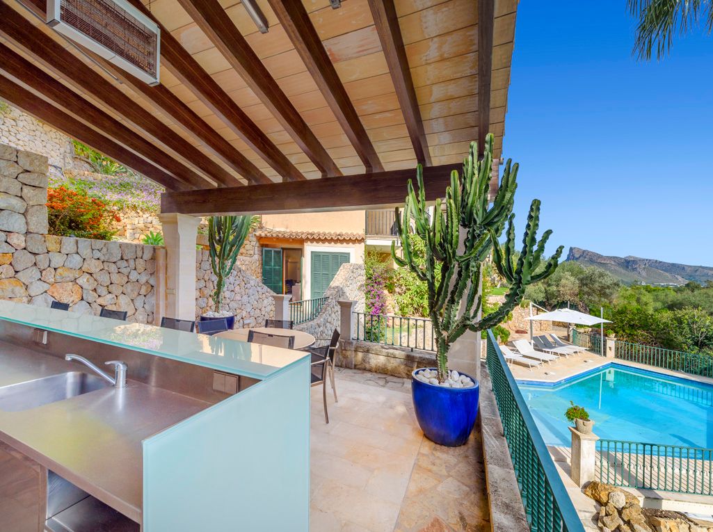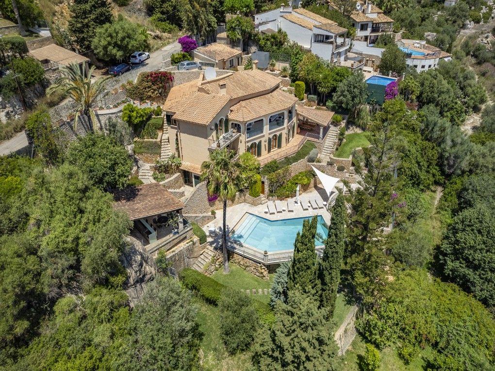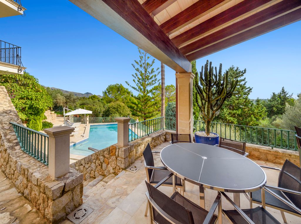 Situated on an elevated position and cleverly sculptured into the backdrop, this exquisitely presented property welcomes you into a stone feature entrance hall which leads to a spacious light filled dining area /living room with fireplace for the cooler winter evenings. On entering one is immediately taken by the panoramic views towards the bay of Puerto Pollensa and surrounding lush green gardens. Followed by an extensive sunny and covered terrace which is a delight to indulge the stunning views and enjoy anytime of the day. Next to the dining area there is a second patio style terrace with access from the kitchen, ideal for dining al fresco. The fully equipped kitchen has recently been renovated. The thoughtful distribution throughout offers great privacy for large families. The master ensuite is positioned separately giving extra privacy, with an ensuite bathroom and a private terrace. On a lower level there are four additional bedrooms, each one unique with ensuite bathroom, direct terrace access and great views. On this level you can also find a guest toilet and fully equipped laundry room and kitchenette to serve the oversized covered terrace leading from all bedrooms. The property is surrounded by mature trees, exotic plants and sun terraces ensuring optimal comfort for outdoor living.There is also a separate guest apartment with ensuite. A second cosy winter lounge/TV room with a traditional style bar. Fully equipped outdoor luxury bar overlooking the marbol swimming pool and fantastic sun terraces. The high quality built property has been enjoyed as a family home for many years by its current owners and is presented in very good condition, ready to enjoy. Equipped for all year round living with central heating and air conditioning throughout. The adjacent plot is also included. A real gem of a property waiting to be seen.