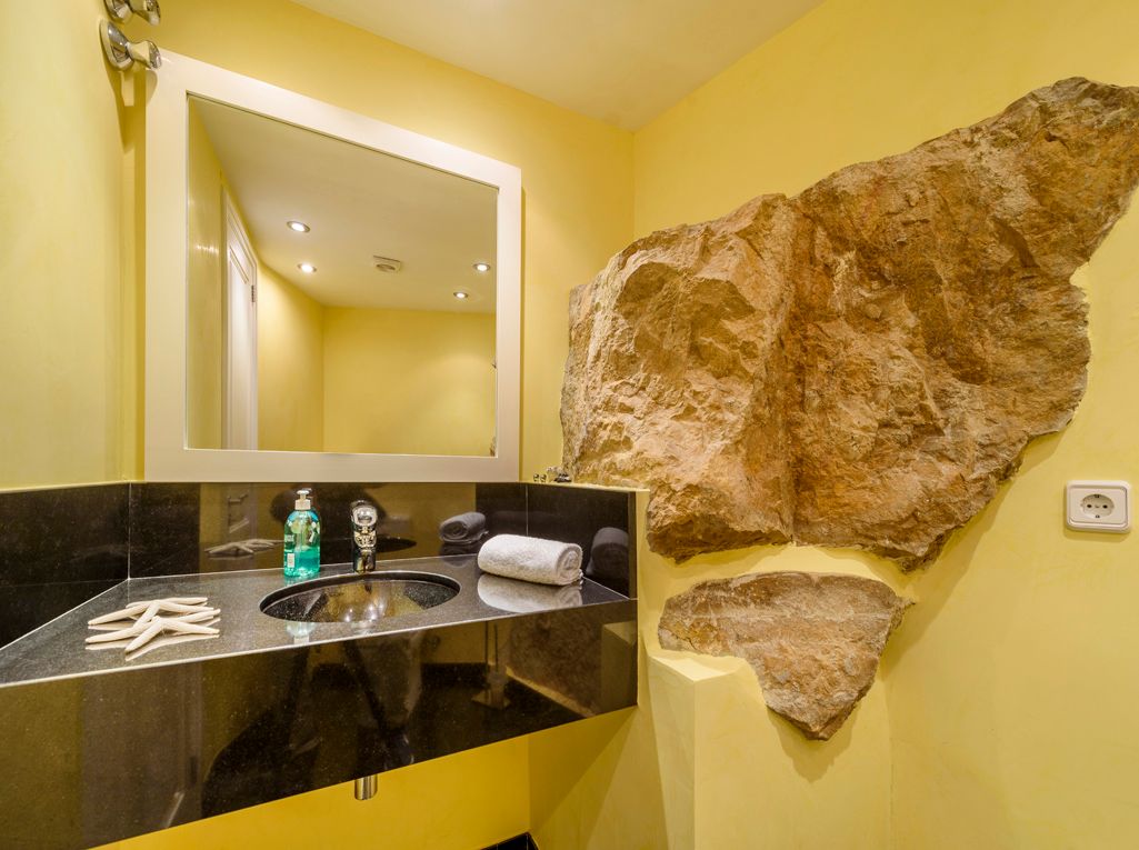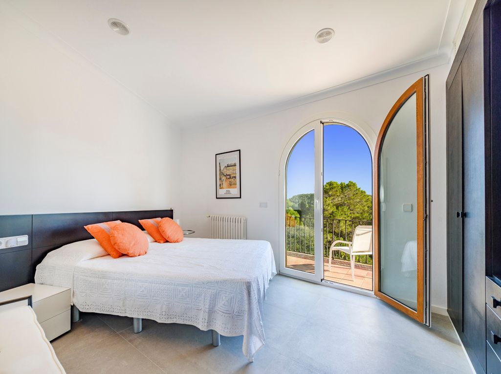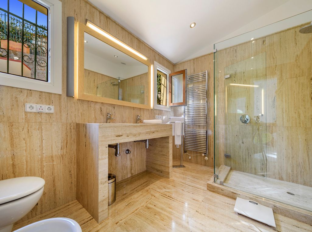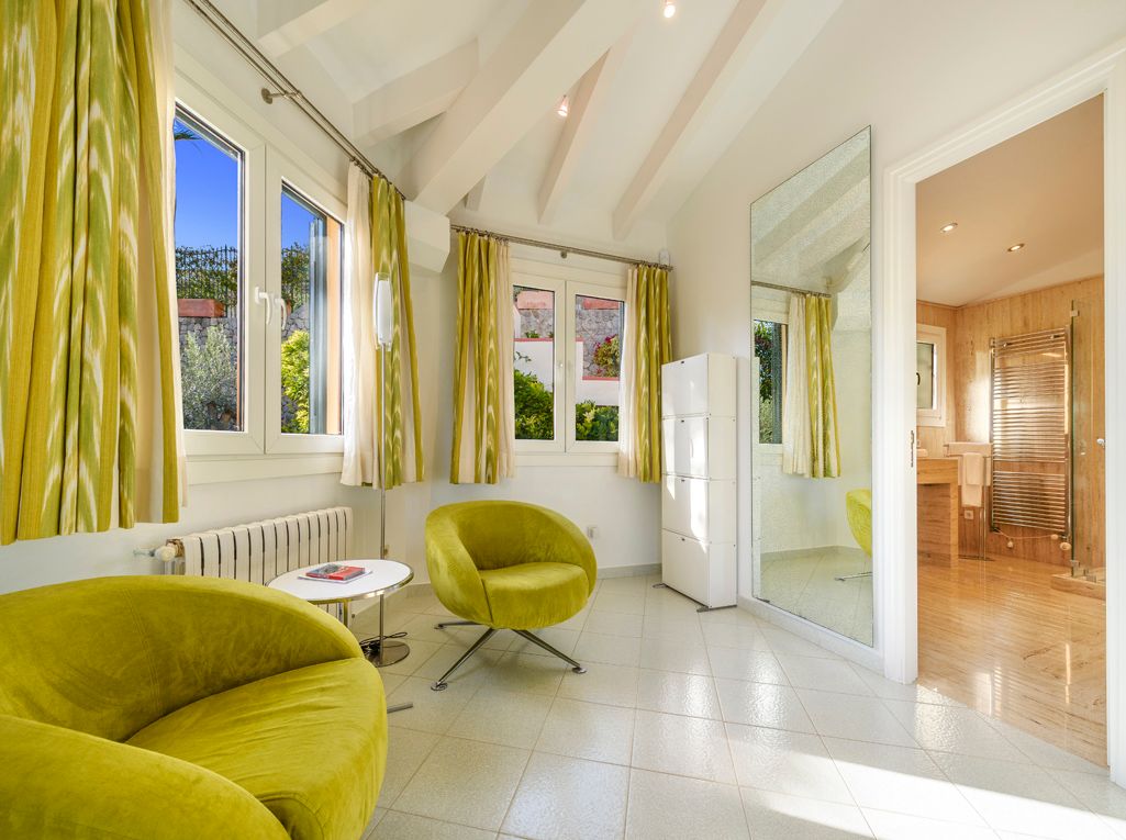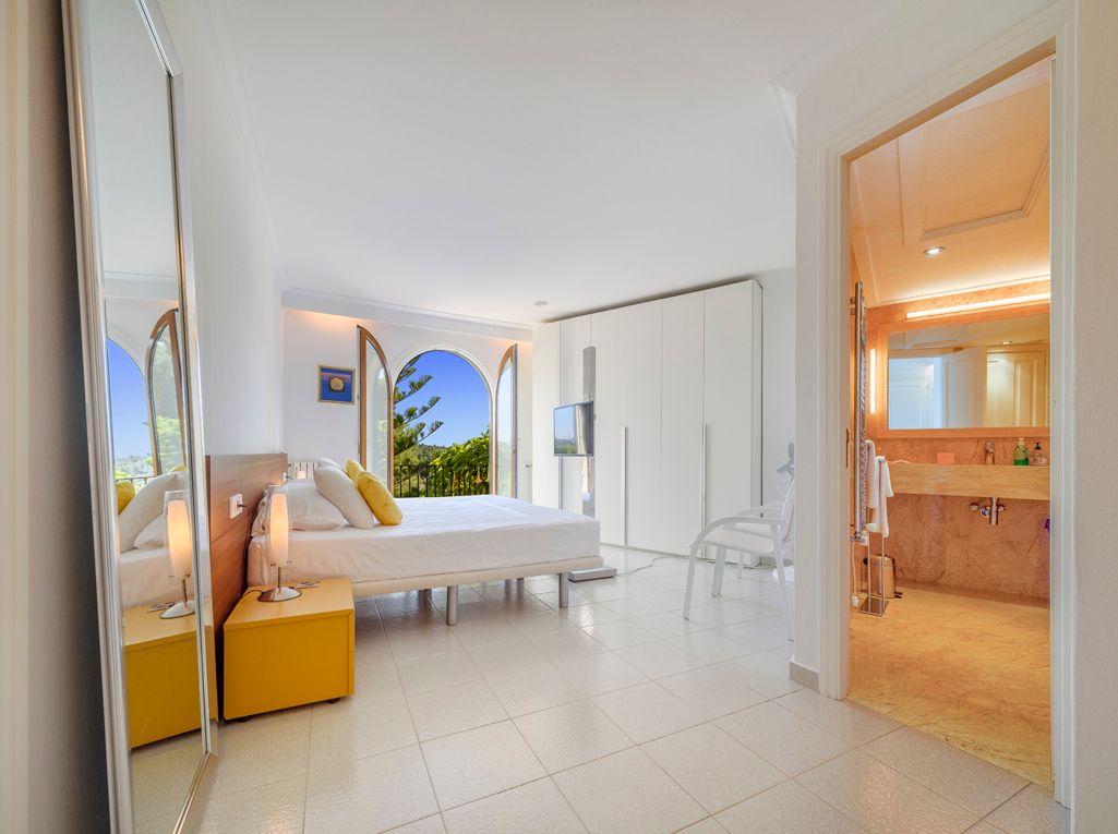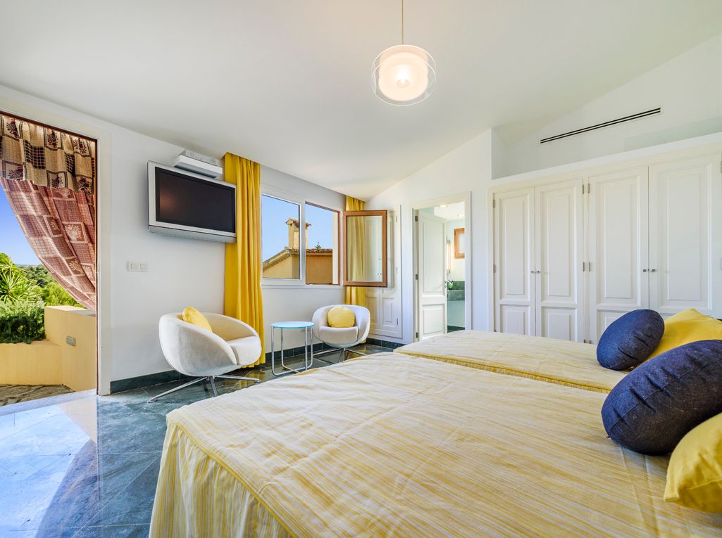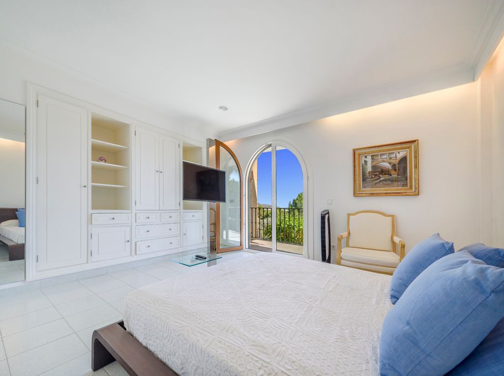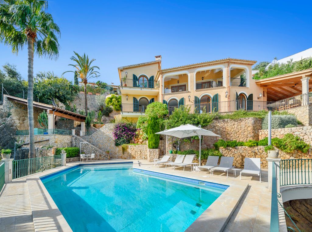 Situated on an elevated position and cleverly sculptured into the backdrop, this exquisitely presented property welcomes you into a stone feature entrance hall which leads to a spacious light filled dining area /living room with fireplace for the cooler winter evenings. On entering one is immediately taken by the panoramic views towards the bay of Puerto Pollensa and surrounding lush green gardens. Followed by an extensive sunny and covered terrace which is a delight to indulge the stunning views and enjoy anytime of the day. Next to the dining area there is a second patio style terrace with access from the kitchen, ideal for dining al fresco. The fully equipped kitchen has recently been renovated. The thoughtful distribution throughout offers great privacy for large families. The master ensuite is positioned separately giving extra privacy, with an ensuite bathroom and a private terrace. On a lower level there are four additional bedrooms, each one unique with ensuite bathroom, direct terrace access and great views. On this level you can also find a guest toilet and fully equipped laundry room and kitchenette to serve the oversized covered terrace leading from all bedrooms. The property is surrounded by mature trees, exotic plants and sun terraces ensuring optimal comfort for outdoor living.There is also a separate guest apartment with ensuite. A second cosy winter lounge/TV room with a traditional style bar. Fully equipped outdoor luxury bar overlooking the marbol swimming pool and fantastic sun terraces. The high quality built property has been enjoyed as a family home for many years by its current owners and is presented in very good condition, ready to enjoy. Equipped for all year round living with central heating and air conditioning throughout. The adjacent plot is also included. A real gem of a property waiting to be seen.