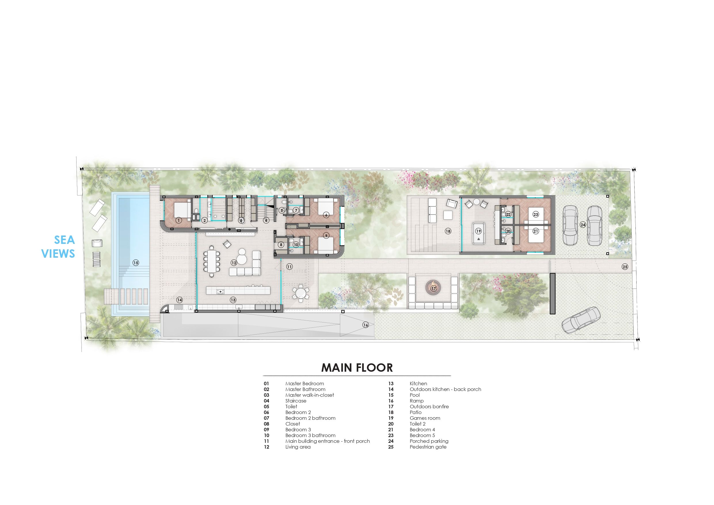 All on one level, this property perfectly combines contemporary design, functionality, and comfort. It features five spacious bedrooms, each with its own en-suite bathroom, ensuring privacy and convenience for family members and guests alike. Two of these bedrooms, each with en-suite bathroom, are located in a separate guest house.