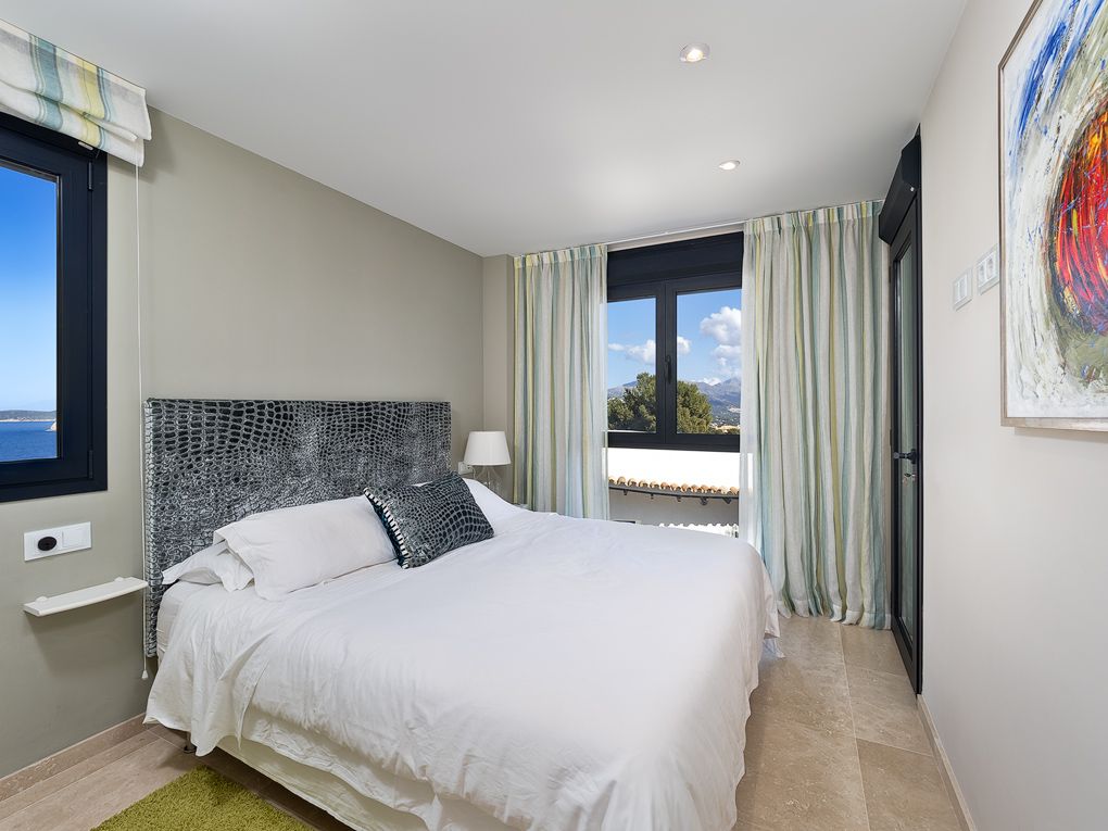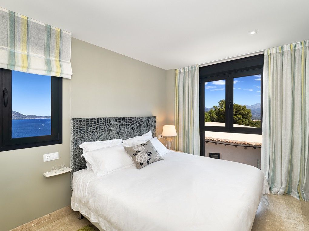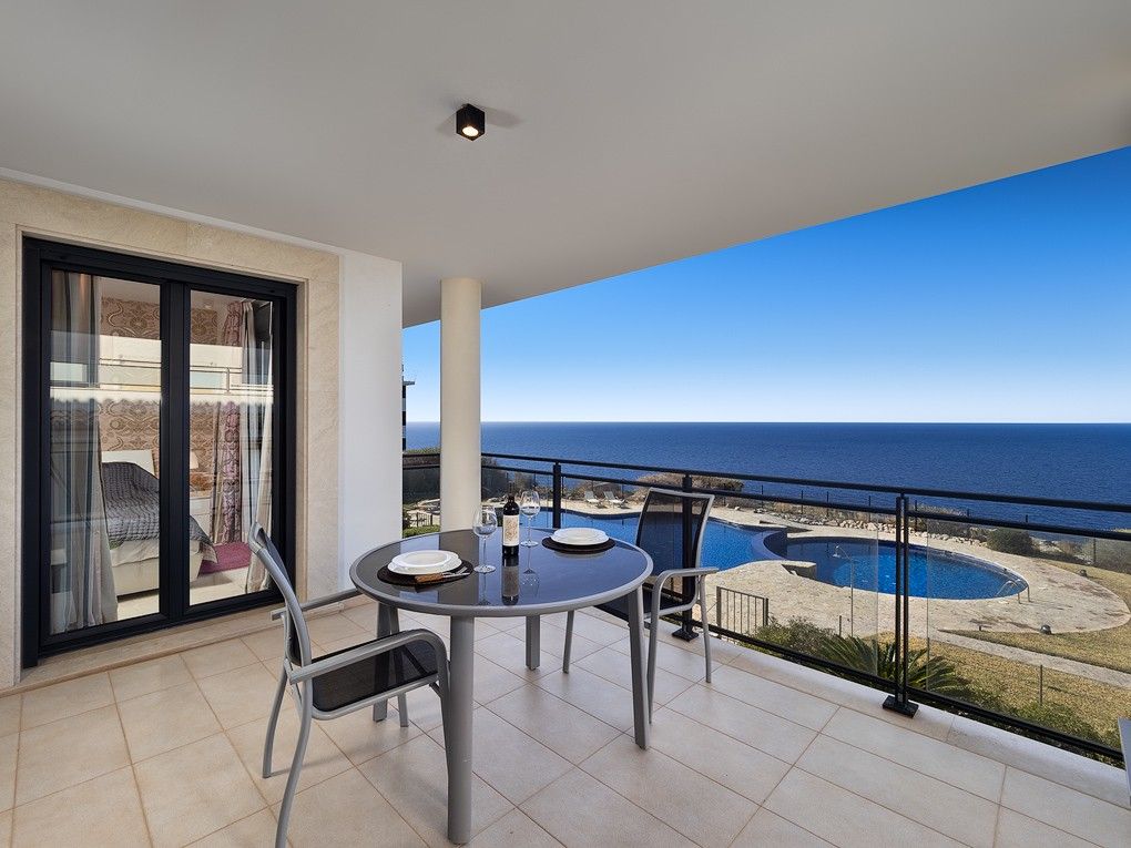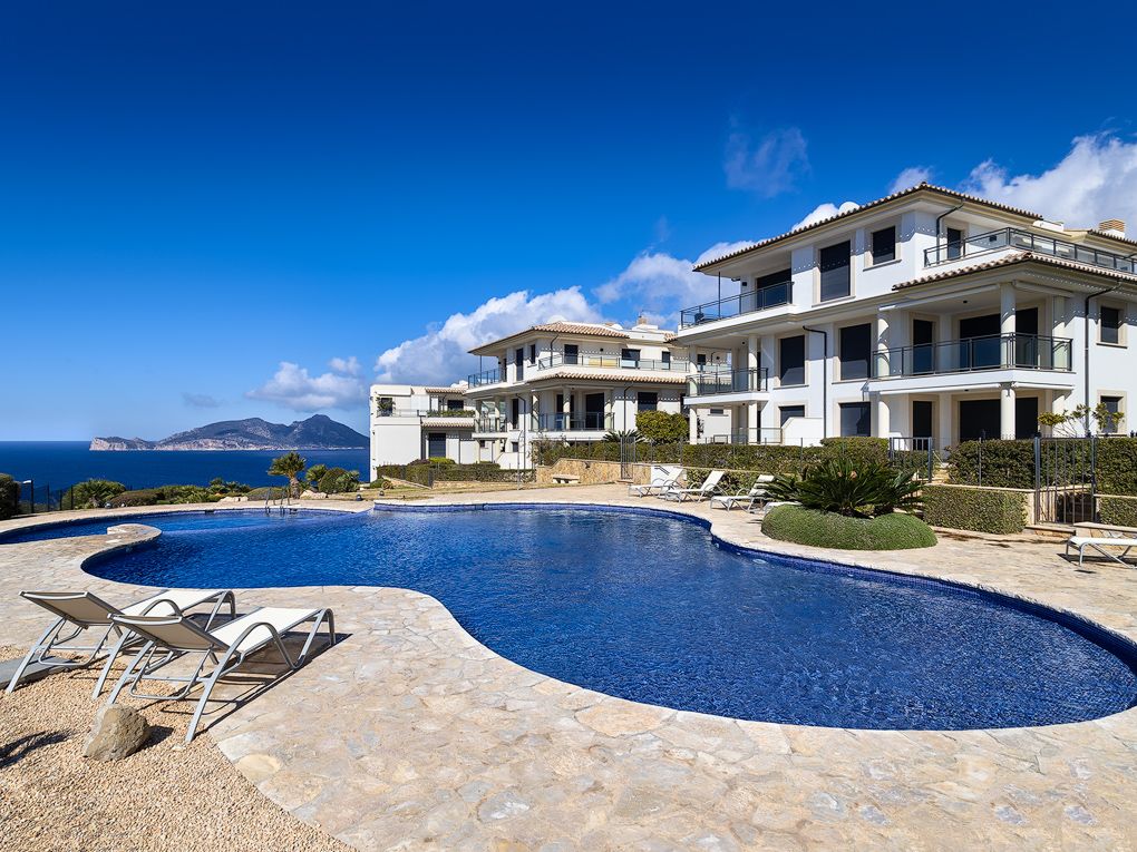 This luxury apartment is situated in a prime location on the seafront and offers breathtaking views of the Mediterranean Sea and the Tramuntana mountains. Nestled in a small and exclusive community complex on "La Mola" , located just 130 meters above sea level, this bright and high quality apartment offers an exceptional blend of location, views, quality and lifestyle. The spacious living area is bathed in natural light and connects the modern open plan kitchen, equipped with top of the range appliances, to the living room. The master bedroom has an en-suite bathroom with underfloor heating, providing a touch of luxury and warmth. The second bedroom is equally well equipped, making this apartment suitable for both relaxation and entertaining guests. A separate laundry room makes daily chores easier. The excellent furnishings make this apartment even more attractive. Hot and cold air conditioning ensures year-round comfort, while an elevator from the garage to the apartment provides easy access. The community has a large, inviting pool, perfect for a refreshing dip or simply sunbathing. The location of the apartment is just a few minutes' drive from the port of Port Andratx, where you can discover a variety of restaurants, bars and stores, adding to the comfort and enjoyment of this property. Further features include: 1 underground parking space, storage room, electric underfloor heating in the bathroom and electric blinds on all Windows.