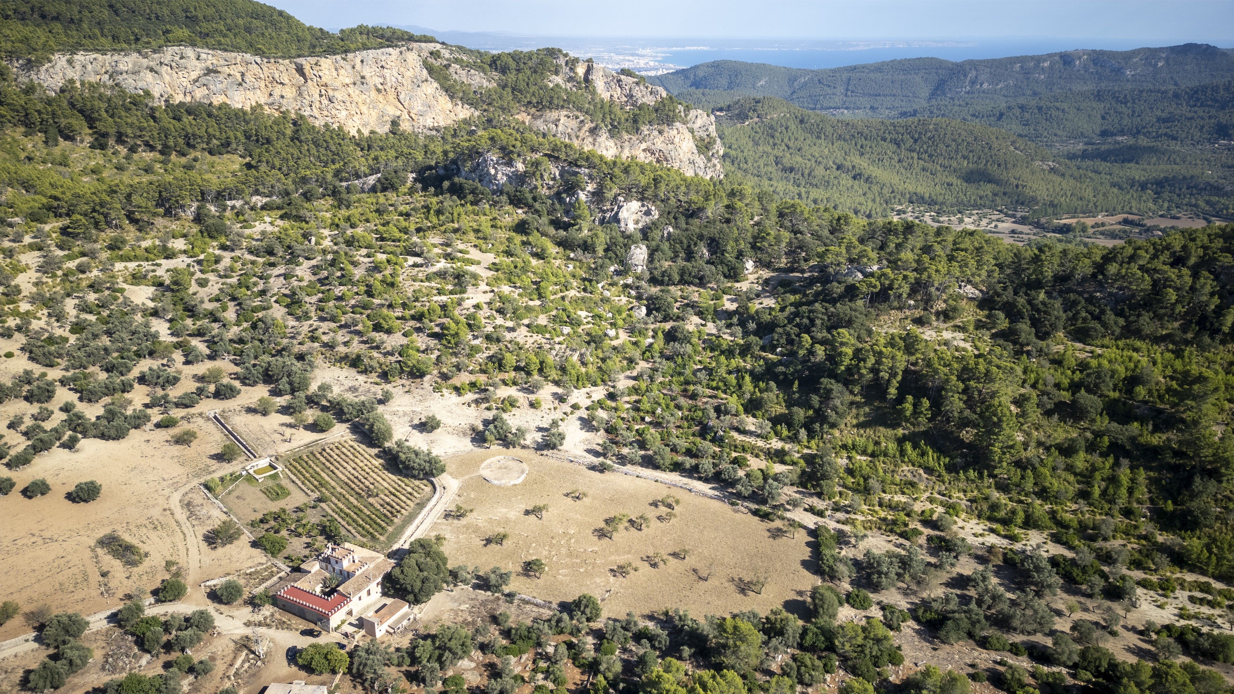 Discover this magnificent 18th-century estate nestled between the charming towns of Puigpunyent and Esporles, set in a breathtaking valley. Thanks to the size of the land (96,60ha), this property offers diverse landscapes and an infinity of spaces with views to different parts of the island as well as paths to walk through the estate and its magnificent vegetation: including an olive grove with approximately 2,500 centenary olive trees, a vineyard for own wine production, a historic talayot, caves, holm oak forests, pine groves, almond trees and much more. There is also a reservoir, two water wells and an authentic Mallorcan Tafona (oil mill), which is part of Mallorcan history.