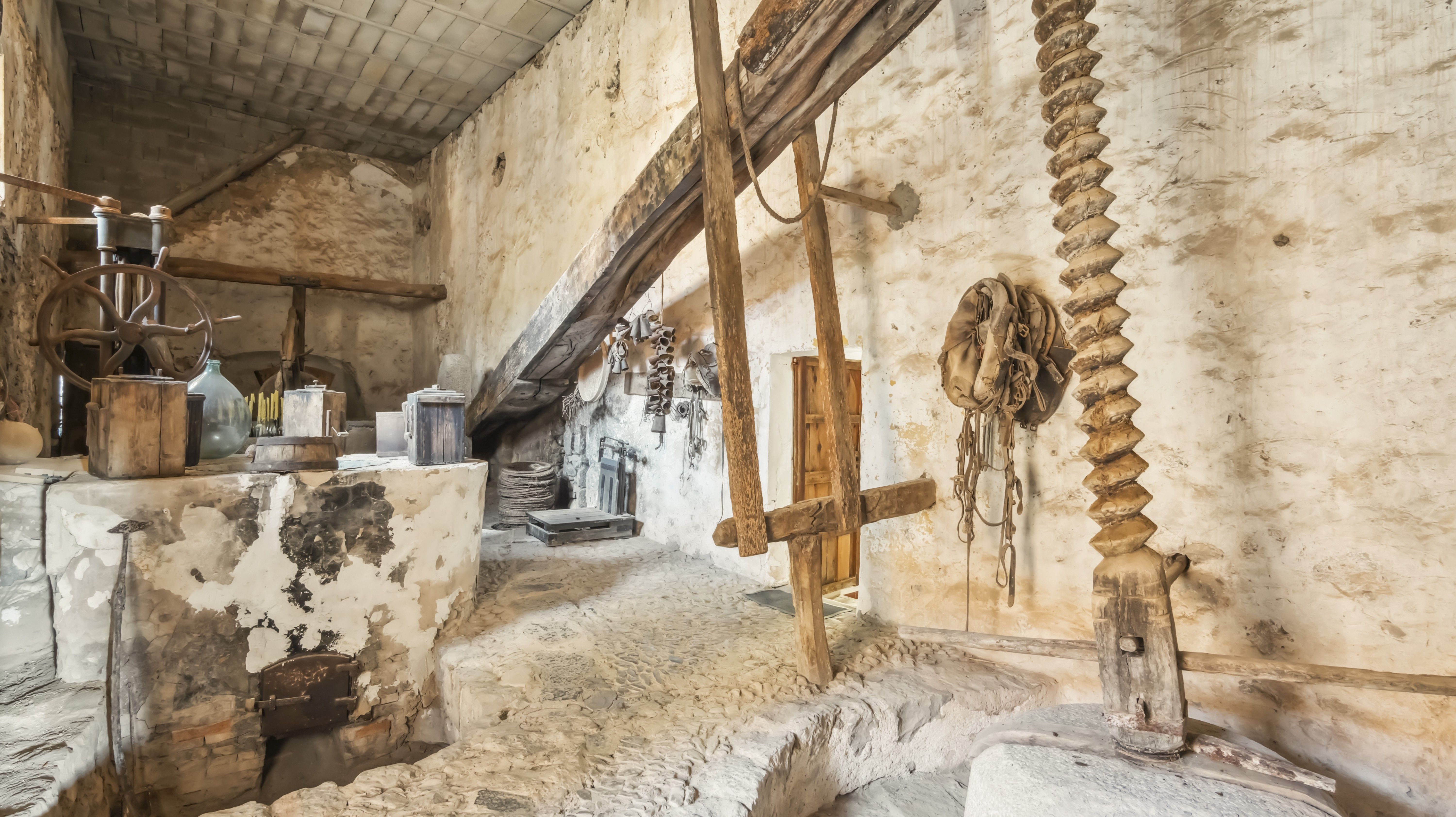 The main house, in need of comprehensive renovation, encompasses approximately 1.497m² of constructed area and is designed around a central square courtyard. The main facade features a sundial and leads into a spacious living-dining area with exposed beams and high ceilings. The kitchen, with an antique fireplace, connects to the former animal stable. Upstairs, there are 8 bedrooms, 2 of which are en-suite, along with another kitchen and a living room with a fireplace and direct access to the courtyard. Additionally, there is the potential to construct a third floor, currently an open space.