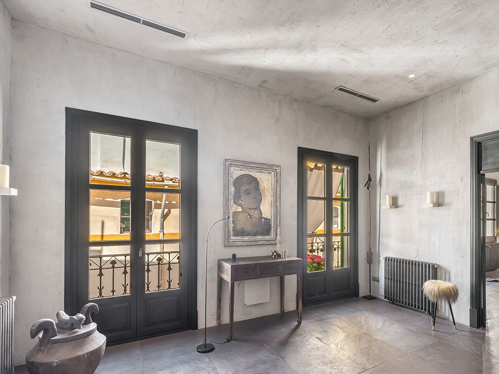 On a quiet Palma side street of the popular Paseo del Borne you will find this extraordinary treasure: a 218 sqm penthouse in post-industrial New York loft style placed in a historical building of Palma de Mallorca’s Old Town. The loft style living room leads through the full length of the property, starting at one street and ending on another small street of Palma’s Old Town. The modern and minimalistic living room joins an open kitchen with a cooking island, a dining area and the lounge area with a fireplace. Furthermore, the spacious apartment has three bedrooms with designer bathrooms (two of them ensuite). The designer paid special attention on the whole apartment by using high-quality elements such as Belgian mosaic tiles, floors made of fine stone tiles in slate look, wall cladding made of smoked wood and plastered walls. The kitchen is exclusively equipped with products from Miele, Smeg, Liebherr etc. The flat has central air conditioning in the bedrooms as well as central gas heating through radiators. All windows are fitted with double glazing. A roof terrace with a fantastic view over the Cathedral and historic Old Town buildings is available for the common use of only three proprietors.