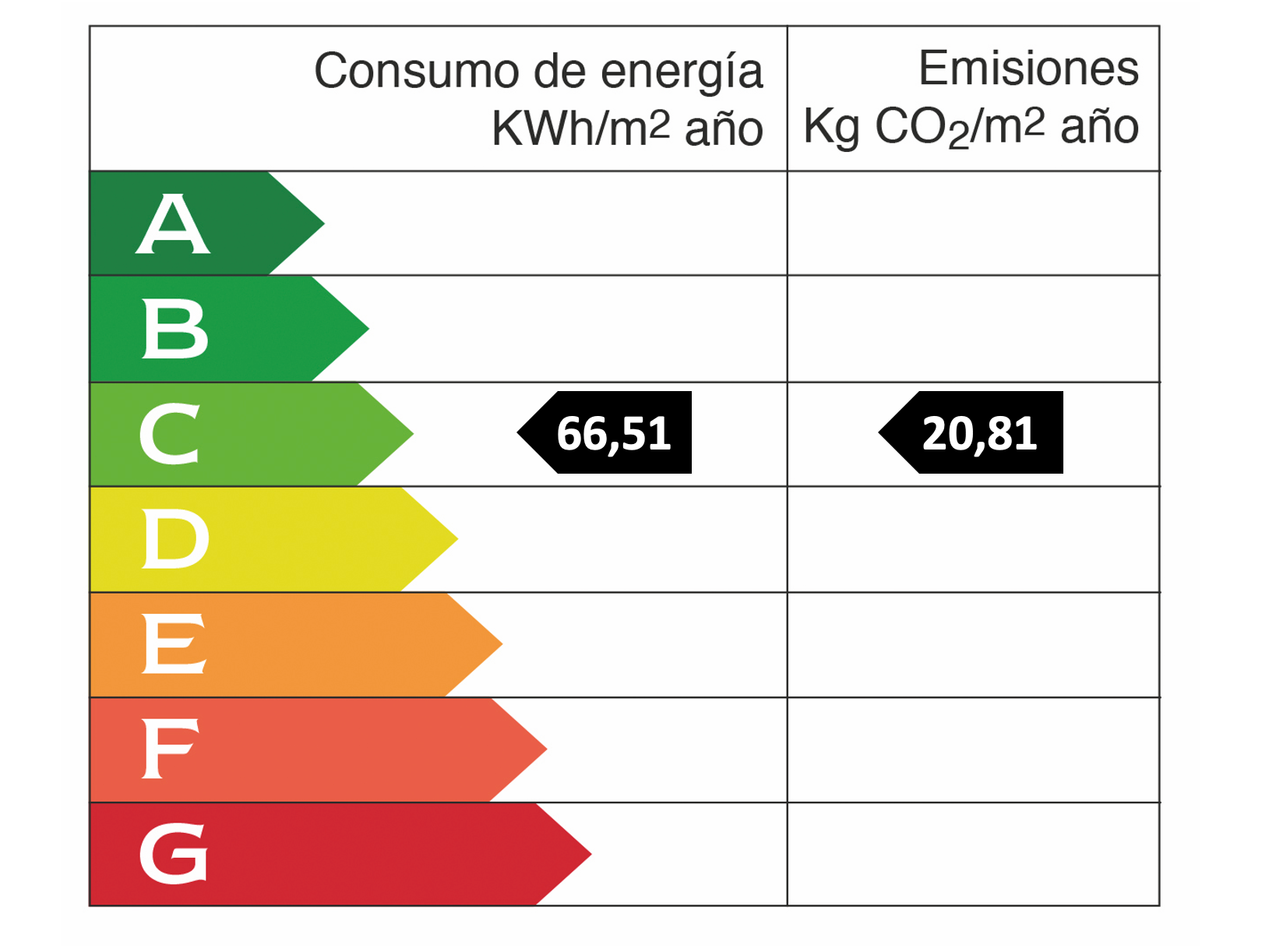 • Energy consumption value: 66.51 kWh/(m2*a) • CO2 emission: 20.81 kg/m2 • CO2 Emission Rating: C • Energy efficiency rating: C