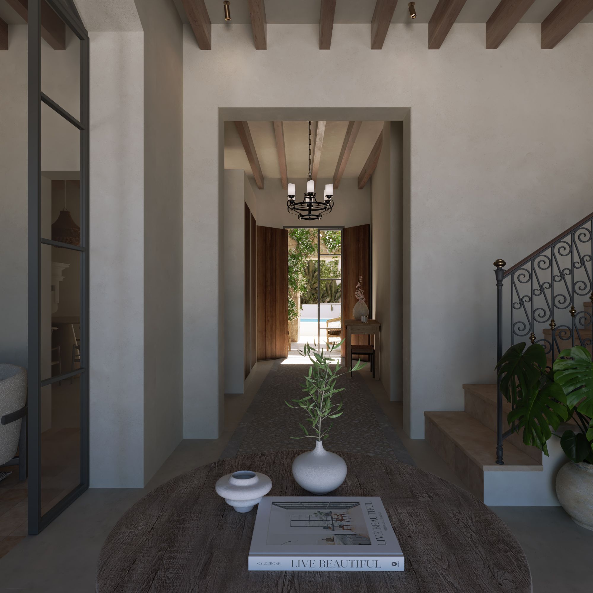 The property spans three levels. The plans feature an entrance that immediately sets the tone: a bright, spacious hall with the original staircase and glazed doors that fill the space with natural light. The inviting living room, complete with a traditional fireplace, flows seamlessly into the dining area, while the kitchen opens directly onto a charming patio. Enclosed by stone walls, the patio and pool are set to become the heart of the home, complete with a summer kitchen and even a guest toilet, perfect for entertaining and enjoying Mallorca’s outdoor lifestyle.