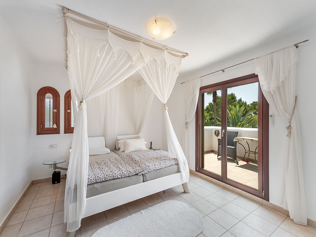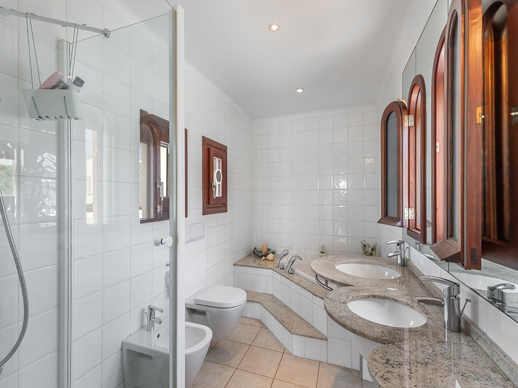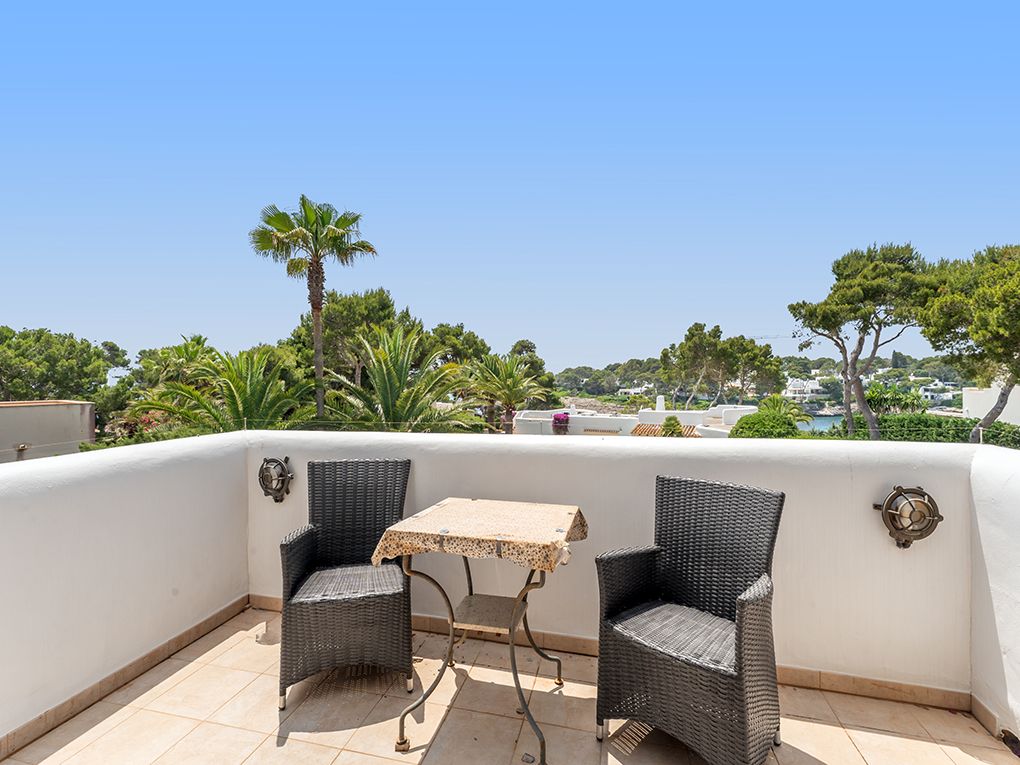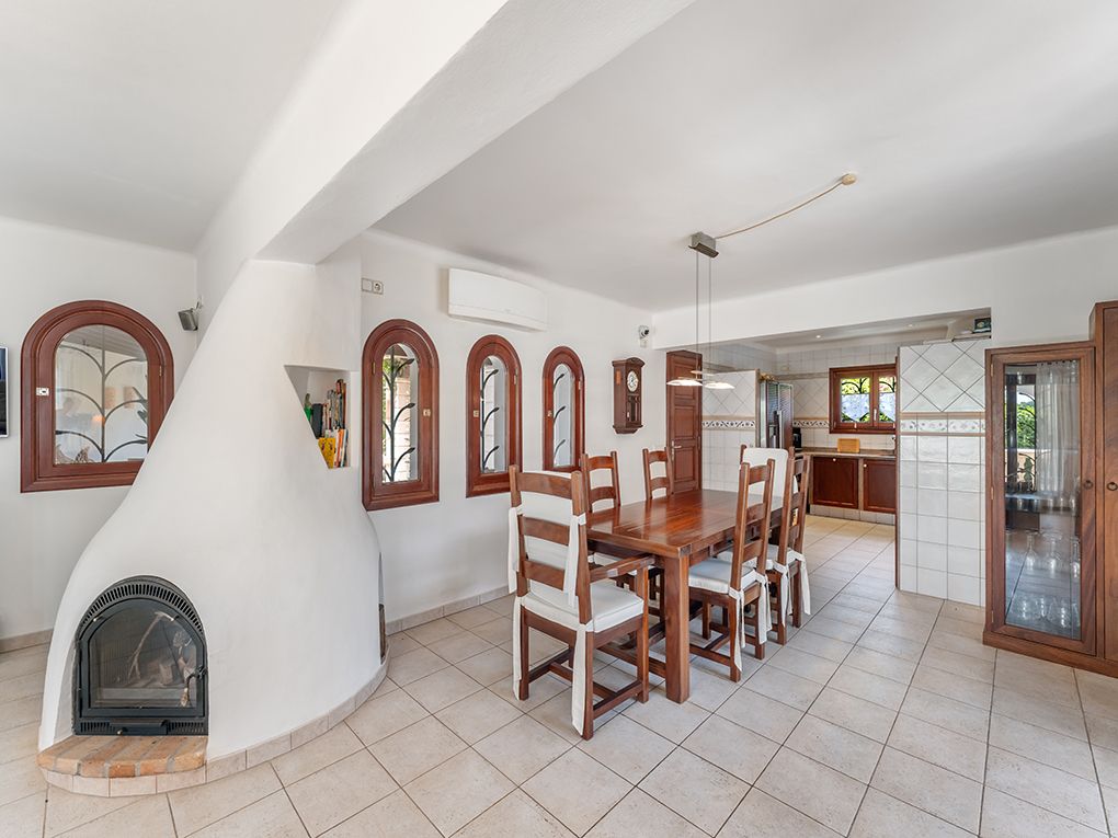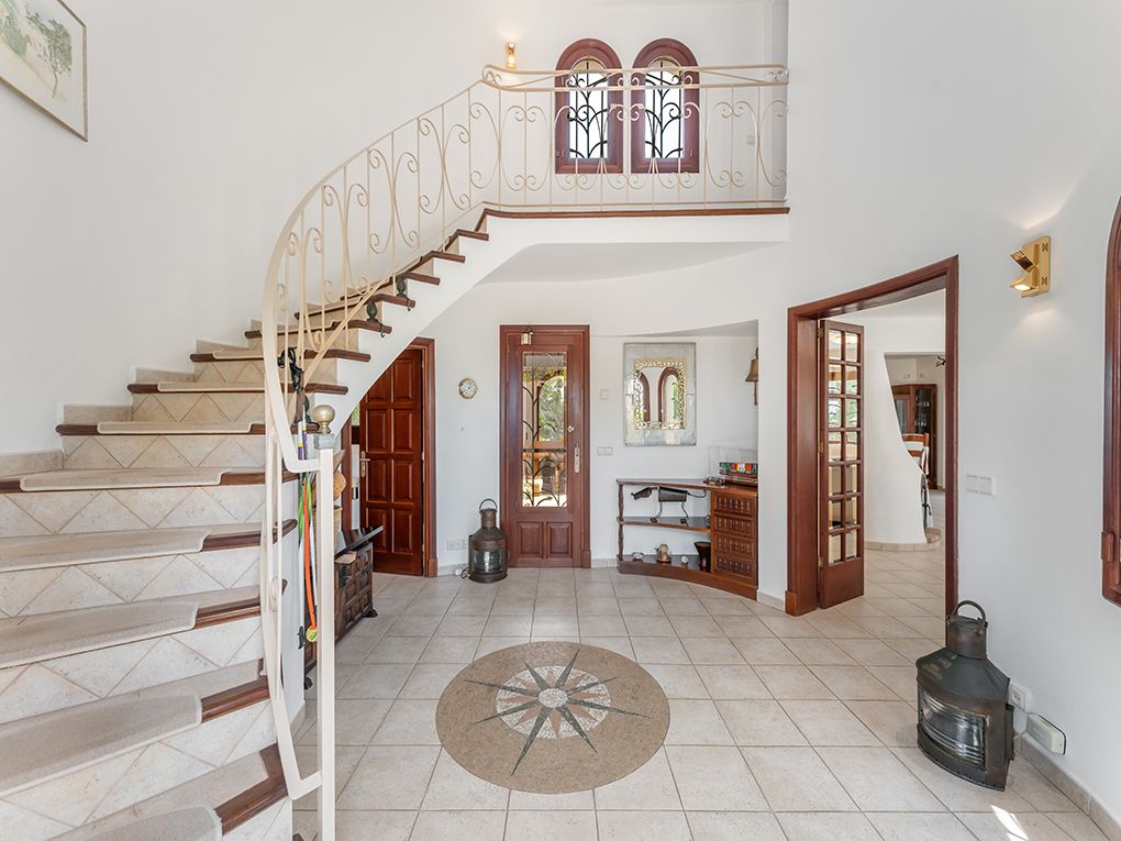 This charming villa, situated in a preferred cul-de-sac location in Cala d'Or, lies in the second line to the picturesque Cala Gran and perfectly combines Mallorcan charm with exceptional privacy. Originally built in 1976, the property underwent a comprehensive renovation in 2004 and today presents itself as a truly welcoming home with distinctive character—stylish, spacious, and set within a lovingly landscaped garden. Upon entering, you are greeted by a bright, open entrance hall with high ceilings that create a striking sense of space. To the left is a guest toilet, while to the right the path leads into the open-plan living, dining, and kitchen area. From here, you enjoy beautiful views of the mature garden with a large pool, offering an absolute oasis of calm. The Mediterranean patio forms the central focus of the ground floor; this sheltered courtyard is the heart of the house, creating a natural connection between indoor and outdoor spaces and providing access to two generous bedrooms with en suite bathrooms as well as a separate study. The protected, almost intimate atmosphere of the patio makes it a special retreat. Upstairs, the master suite includes a bedroom, dressing room, and a spacious en suite bathroom, with an adjoining balcony that offers a side view of the nearby sea. A staircase from the patio leads up to various roof terraces, which will delight sun lovers; at the very top, the tower above the entrance hall provides an impressive sea view—an ideal spot for watching sunsets or enjoying a sundowner. The villa is equipped with central heating, air conditioning throughout, and a stylish fireplace in the living room that adds coziness on cooler days. Ample parking is available thanks to a double garage. A further highlight is the valid holiday rental license (ETV), which makes this property particularly attractive for investors or owner-occupiers looking to rent. The home offers many unique corners and also some potential for further personalization—perfect for lovers of authentic Mallorcan houses seeking something truly special.