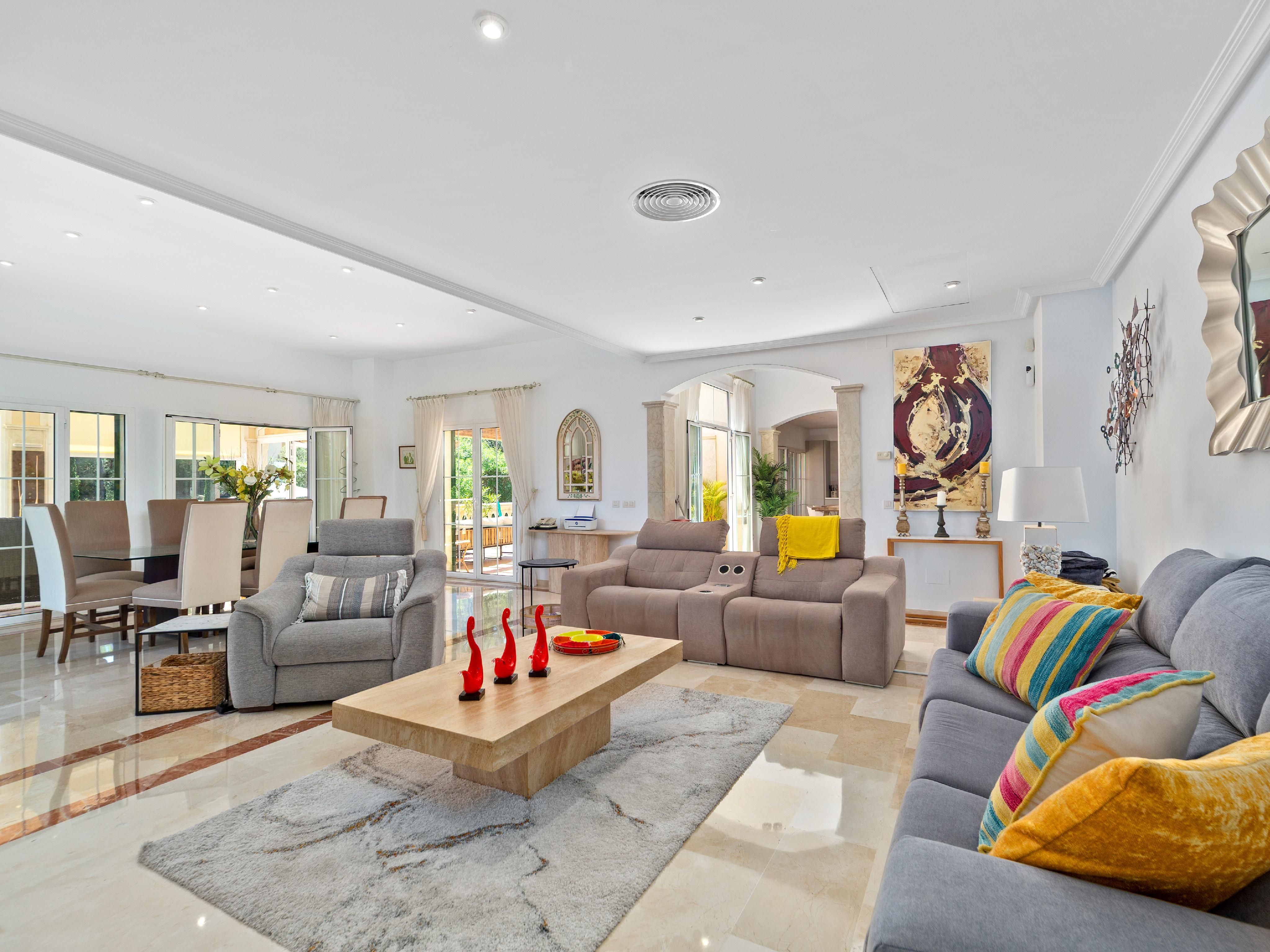 Located in the exclusive residential area of Bahía de Palma, this spacious and immaculately kept villa for sale in Cala Viñas offers privacy, comfort, green and partial sea views. Set on a 1,255 m² plot with a built area of 337 m², this spacious Mediterranean-style home is distributed over two floors, featuring a master bedroom suite with dressing area and 3 further large bedrooms with bathrooms en suite. The bright, open-plan interior includes a generous living and dining room with a fireplace, a spacious kitchen with informal dining, laundry and guest wc. Outdoors, there are beautiful covered and uncovered terraces perfect for year-round relaxation and a private 32 m² swimming pool surrounded by lush gardens. Additional features of the property include h/c air con, marble flooring, garage parking for 1 car and secure parking for 2. Situated just minutes from pristine beaches, golf courses, marinas, and top-tier amenities, this exclusive villa in Mallorca offers a perfect blend of elegance and convenience. With easy access to Palma and the airport, it is an ideal investment for both permanent and 2nd homeowners. Contact us today for more information and to arrange a private viewing