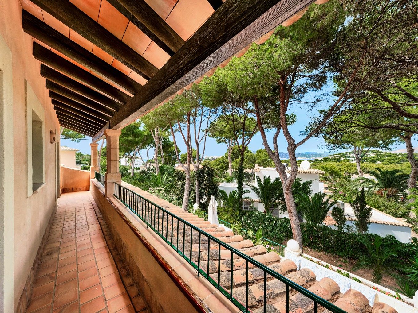 This charming villa is located in one of the most sought-after residential areas at the foot of Santa Ponsa’s local mountain, combining Mediterranean character with a high level of privacy. Natural stone façades and traditional architecture lend the property a timeless appeal. The living area is harmoniously distributed over two levels: on the ground floor you will find a spacious living room with panoramic windows overlooking the pool, an adjacent dining area and a generous kitchen. All rooms offer direct access to the open and covered terrace areas, as well as to the west-facing swimming pool. Here you will find ideal spaces for a large dining table, an outdoor kitchen or a cosy lounge – perfect for relaxing pleasantly in the shade even on warm summer days. Sun lovers can enjoy the pool terrace with views of the greenery and mountains. The upper floor features four bedrooms, each with an en-suite bathroom, and partial sea views. The property, built in the late 1990s, impresses with many original, local design details inside and out. With selective modernisation, the house can be transformed according to individual preferences into a stylish holiday home or a comfortable year-round residence – for example, by combining traditional elements with modern accents. Additional features include a double garage, a utility room, a guest toilet and two additional separate guest bedrooms with en-suite bathrooms. Please feel free to contact us for further information or to arrange a viewing appointment.