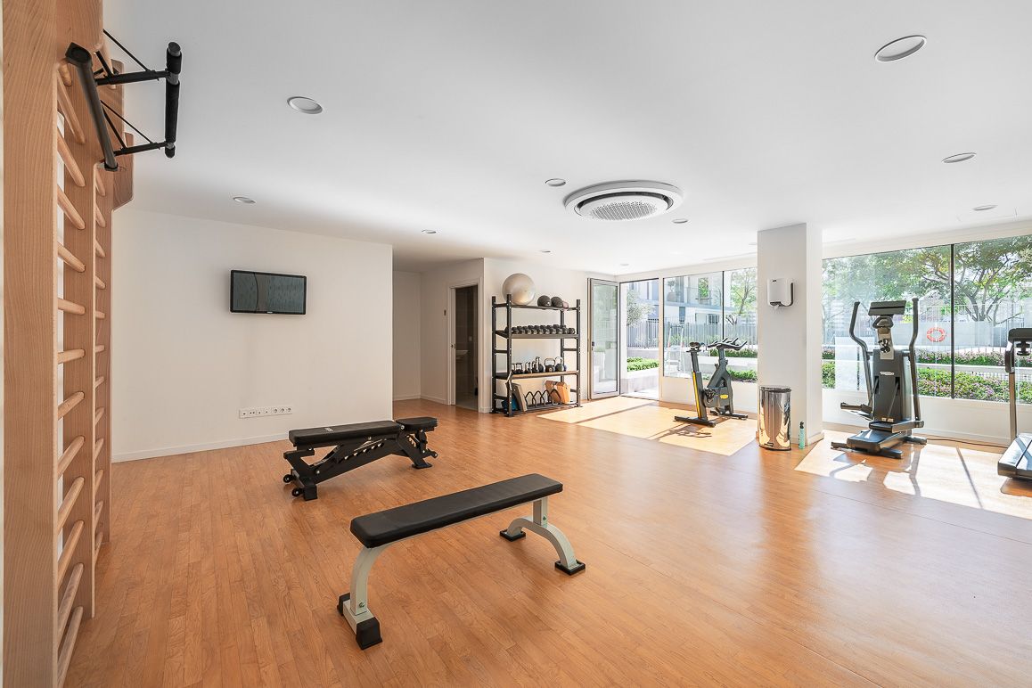 White built-in wardrobes offer ample storage space, complemented by a separate utility room. The bright laminate flooring gives the rooms a friendly and inviting atmosphere, while the air conditioning ensures a pleasant indoor climate all year round. A special bonus is the parking space in the spacious underground garage, which includes an exceptionally large storage room. Other highlights of the residential complex include the well-maintained communal garden with a pool and a fitness room located directly opposite.