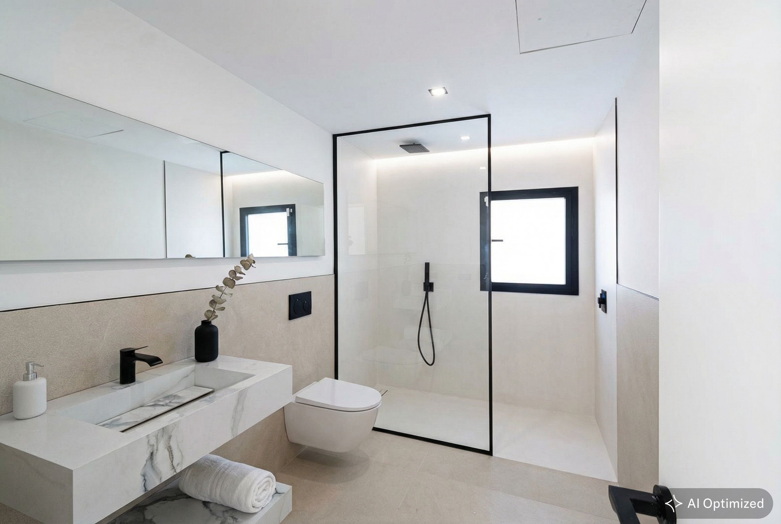 Additional features include: Iroko wood security door, minimalist aluminum windows with thermal and acoustic laminated glass, energy-efficient facade system (SATE), large-format tiles, Hans Grohe and Roca sanitary equipment, RGB LED illuminated glass balustrades, and aerotermia.