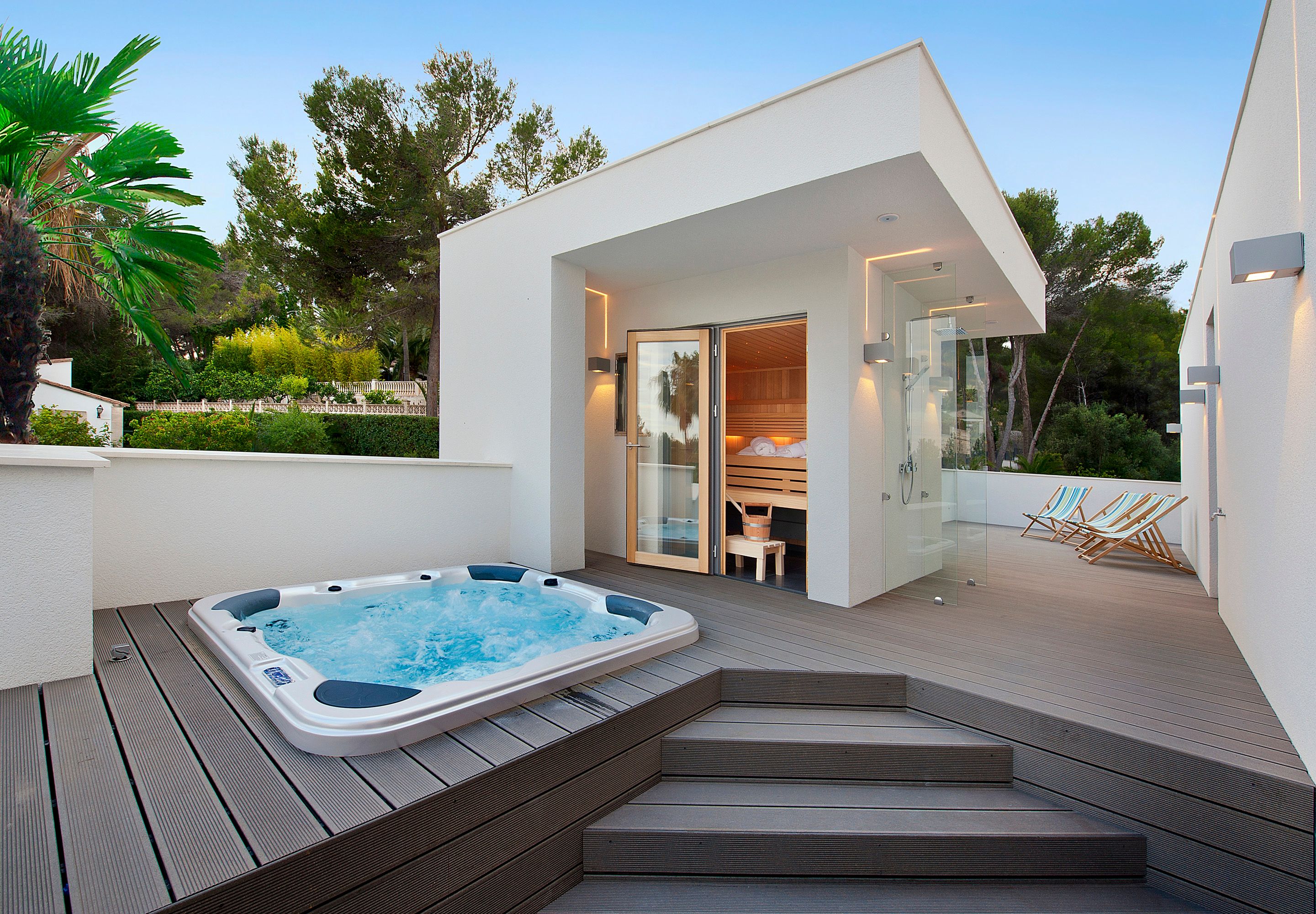 The ground floor features an entrance hall, spacious living room with fireplace, dining room, designer kitchen, office and two bedrooms with bathrooms en suite. All are clustered around an attractive inner patio with a water feature. The entire upper floor is dedicated to the master bedroom with bathroom en suite, fully lined fitted wardrobes and surrounded by private terraces with sauna and whirlpool and a fantastic 180-degree view of the golf course.