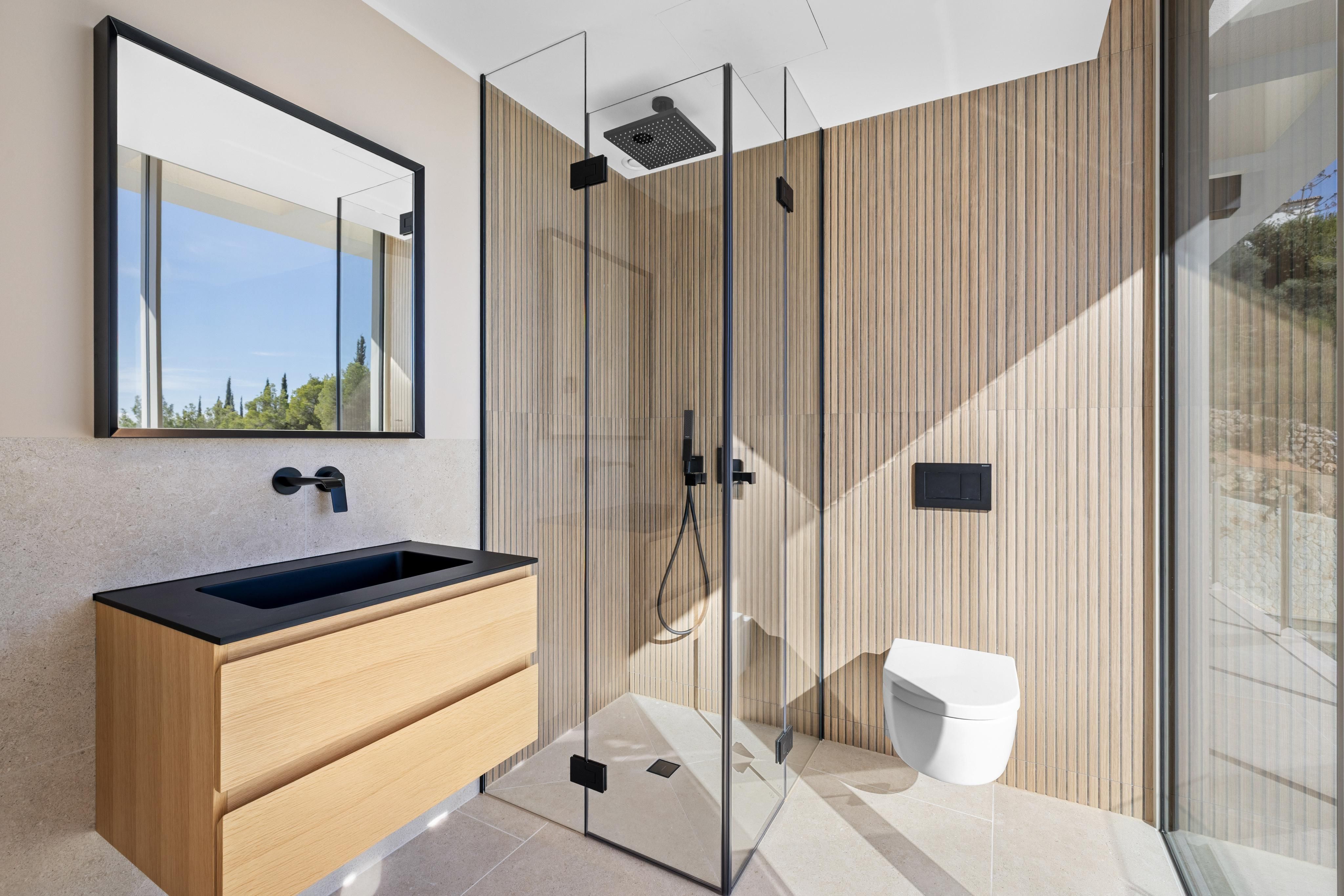 This luxurious modern villa is ready to move into. Only the best materials are being used and the perfect location, right in Portals with walking distance to the various beaches and shops as well as restaurants and the famous Puerto Portals harbour makes it one of a kind. The villa can be accessed by car through the car elevator or by the main entrance on the same level. On the upper level you have the five bedrooms, all with bath en suite and amazing sea views and on the ground floor, also with great sea views, you will find the large open living/dining room with the panoramic sea views, the fully equipped open plan kitchen with an extra cooking space. The whole area has a direct access to the terrace where you will be able to enjoy a wonderful time with the large pool and the chill out area, the BBQ and the outdoor dining area. Also, on the same level there is another bedroom en suite as well as a guest toilet. This wonderful villa features under floor heating, air conditioning hot/cold, parking space outside in the garage for a total of 6 cars as well as in the large basement a gym, spa area, media and games room as well with a further bedroom en suite.