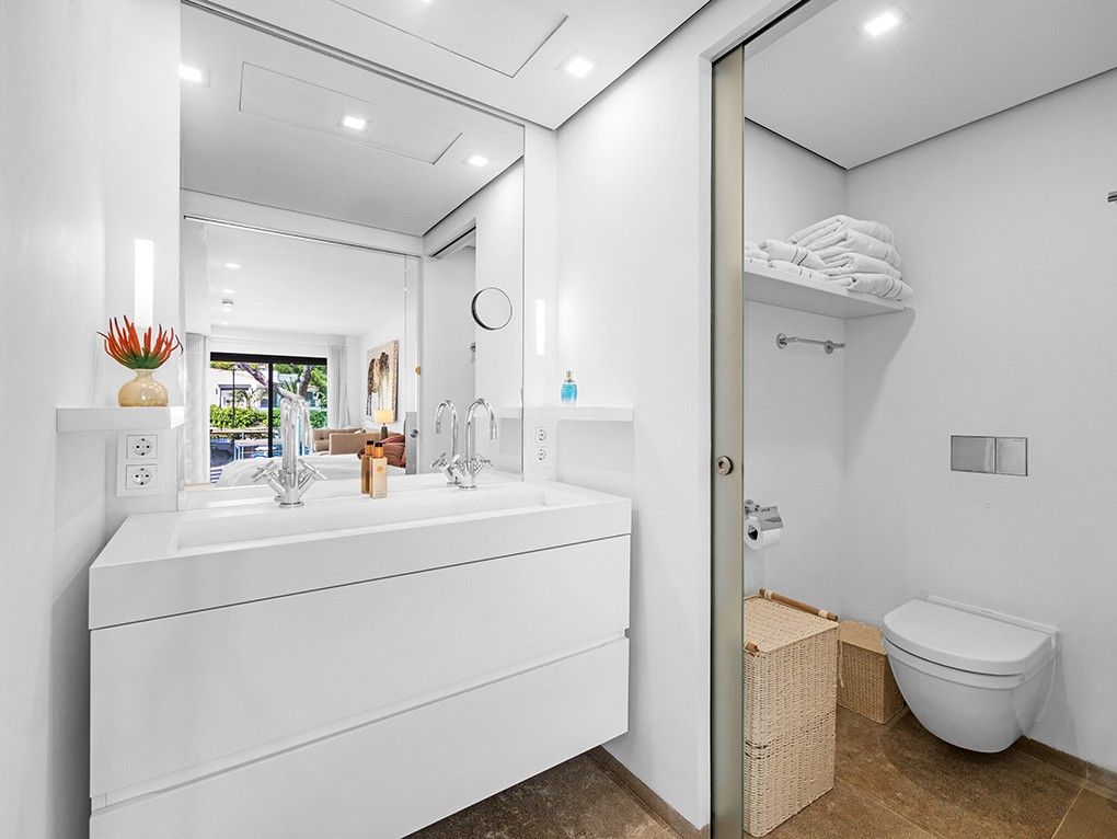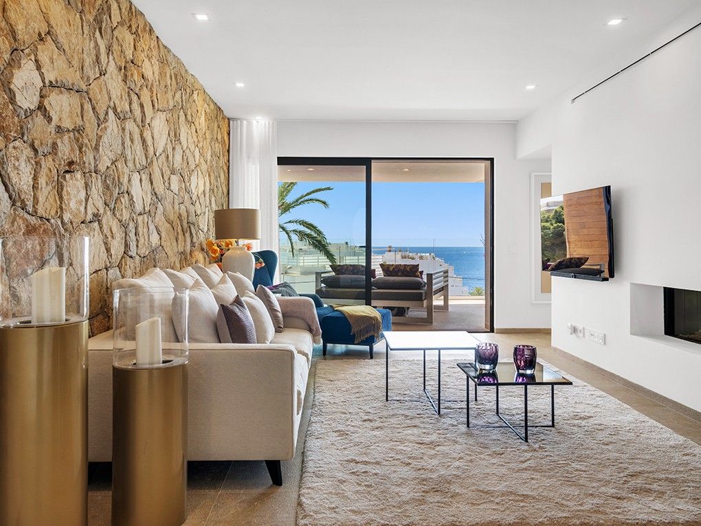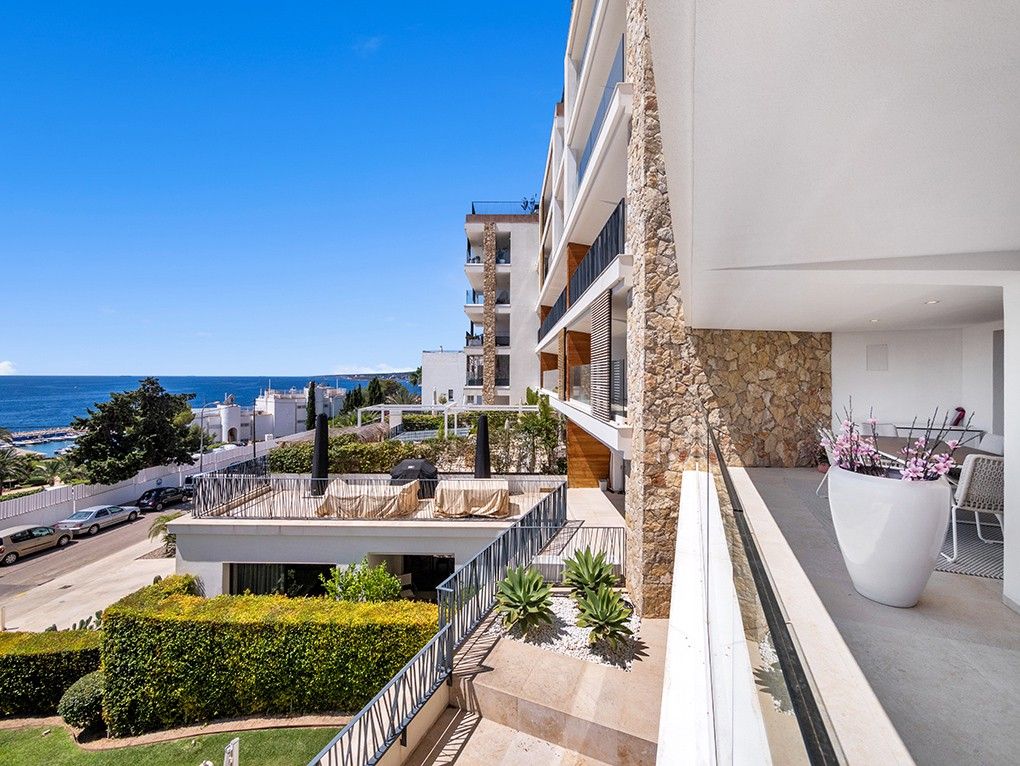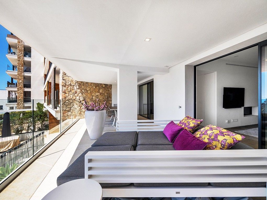 This high-quality new-build apartment is located in the exclusive ELEMENTS residential complex in Puerto Portals, one of the most sought-after areas of the Mediterranean, around 15 minutes' drive from the island's capital, Palma. The design complex combines the four elements of earth, fire, water and air, which are reflected in each of the 31 exclusive apartments. In a unique location within walking distance of the beautiful sandy beach of Portals as well as the fashionable marina and the centre of Portals Nous, the high-quality equipped apartment offers two spacious bedrooms with en-suite bathrooms and numerous built-in wardrobes as well as access to a terrace, an inviting living and dining area with an open-plan kitchen with cooking island and fireplace. In addition, the living and dining area offers fantastic views of the sea and access to another spacious covered terrace. The interior design blends a Mediterranean lifestyle with exceptional quality and maximum comfort, and the apartment will be sold fully furnished. Air conditioning and underfloor heating ensure a pleasant living climate all year round. Pure relaxation or personal training is possible all year round in the spaMENTS. In addition to a concierge service, ELEMENTS offers its residents a spacious relaxation lounge, an inviting outdoor pool with sun terrace, a heated indoor pool and a fully equipped fitness room. A car parking space and a storage room in the complex are also included in the purchase price.