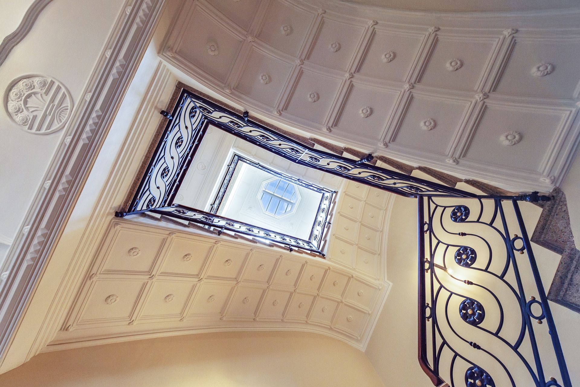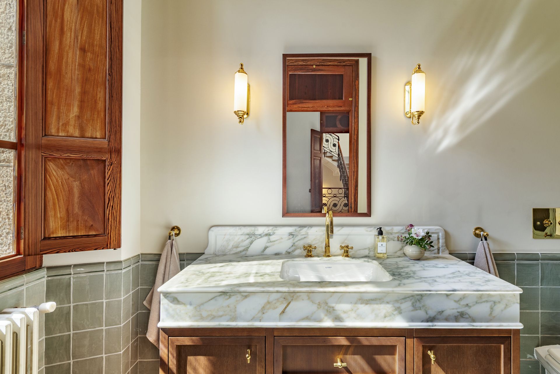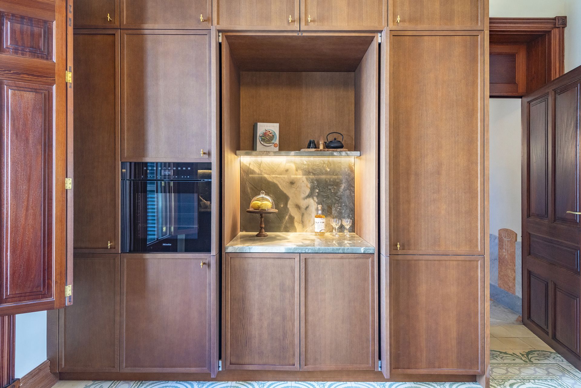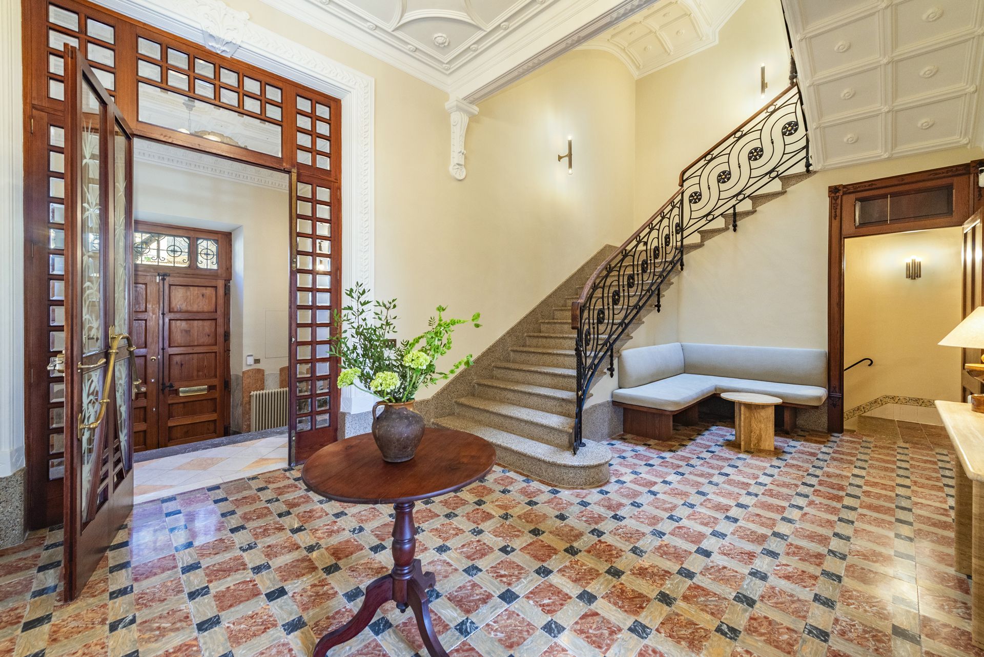 Displaying meticulous attention to detail, the property retains its original architectural beauty, featuring stucco work in every room, Mallorcan tiles, and a lounge adorned with restored 19th-century porcelain wall tiles. The dwelling has been fully renovated with luxurious finishes and design throughout. The kitchen, designed by Cocinart/Espacio Home, is complete with solid noble wood cabinetry, and equipped with high-end appliances from Gaggenau, Siemens, and Miele. The bathrooms feature marble countertops, underfloor heating and top-of-the-line fittings from Toni CPH.