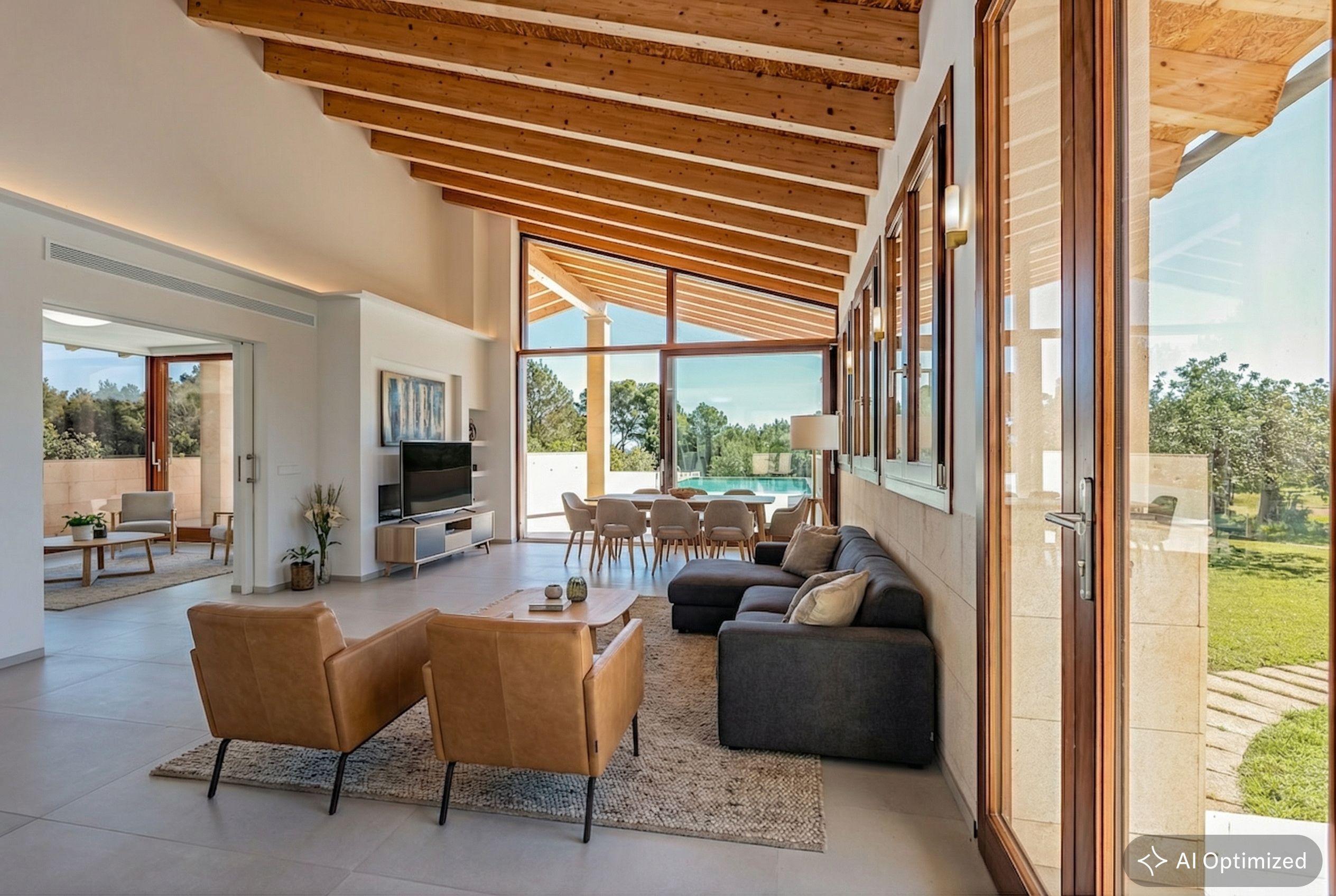 This first-class new finca from 2023 is located on a 16,119 m² plot in Capdepera, in close proximity to the small bathing bay Es Carregador. The property with 238 m² of living space and a 50 m² pool is surrounded by a charming green hilly landscape, and through the trees, the nearby turquoise-blue sea sparkles. The spacious entrance area on the ground floor leads to the open-plan living room. This area of the house impresses with high ceilings and numerous windows that allow light at all times of the day. Large sliding glass fronts extend the living space to the pool terrace with a view of the garden. Additionally, on this floor, there is a spacious country-style kitchen as well as a guest room with an en-suite bathroom. The upper floor with a gallery and panoramic windows offers two more bedrooms with en-suite bathrooms and a guest toilet. Bright tiled floors and white built-in country-style furniture give the modern finca an elegant yet rustic character. The spacious basement offers extra space for visionaries. Here is the entire house technology, space for the fleet, and the possibility to create another apartment or a spa and fitness area. Outside the house, six more vehicles can be easily accommodated. The well-insulated exterior facade, high-quality teak windows with double glazing, as well as a heat pump for operating the central air conditioning and underfloor heating, and last but not least a gas fireplace ensure a pleasant living climate all year round. Thanks to a sustainable photovoltaic system and its own licensed well, one lives absolutely self-sufficiently on this finca. A 30,000L water cistern is used for garden irrigation. Additionally, the finca has its own city power connection. Modern living comfort and a well-thought-out energy concept – this finca combines all the elements for a unique living experience on the enchanting island of Mallorca in a sought-after location, within walking distance to the sea and the popular coastal and port town of Cala Ratjada. The property is sold unfurnished in its current state – visualizations with exemplary furnishings were created for illustration purposes.