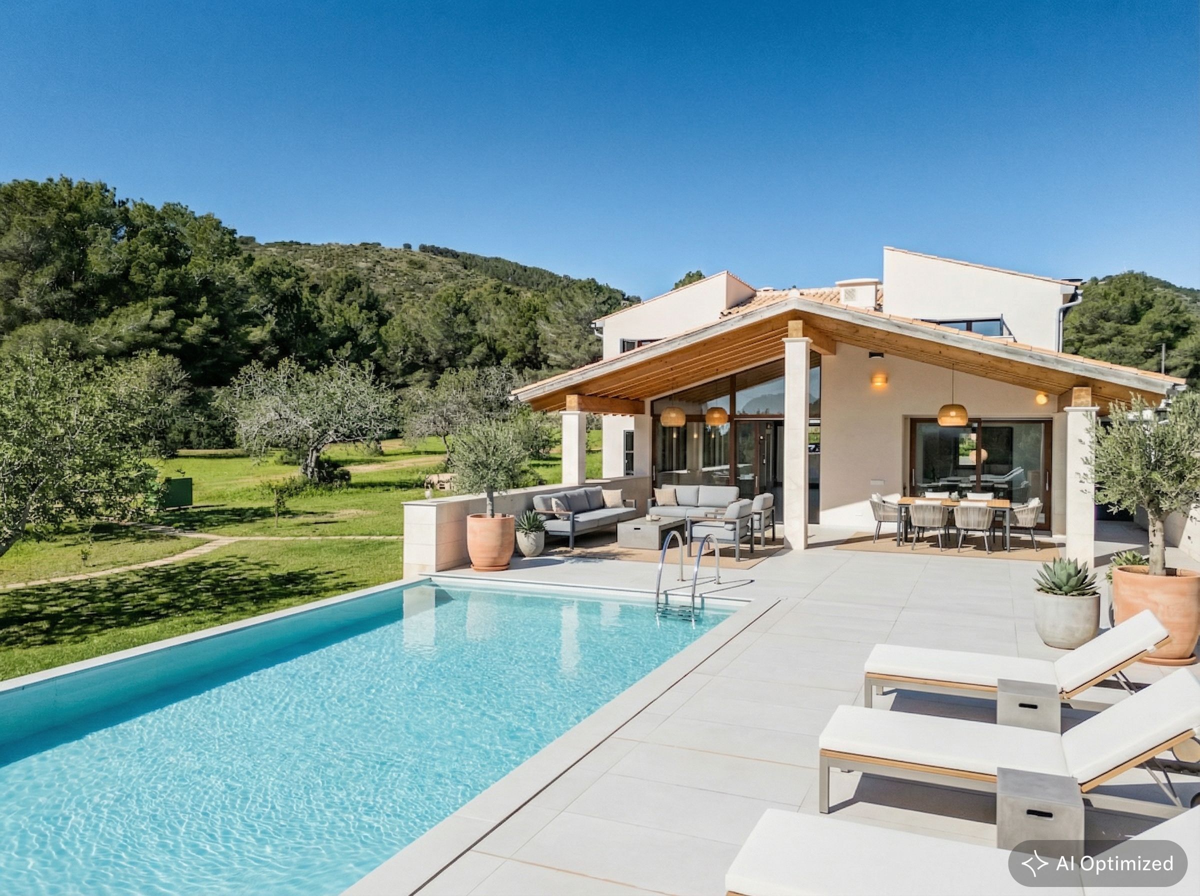 Type: Finca • Region: North East • Construction year: 2023 • Total surface: 322 ㎡ • Total rooms: 4 • Bedrooms: 3 • Bathrooms: 4 • Living space: 238 ㎡ • Plot size: 1,62 ㏊ • Parking: 2 • Kitchen • Fireplace • Swimmingpool • Heating: Underfloor heating, Central air-conditioned • Heating type: Heat Pump • Floor type: Tiles