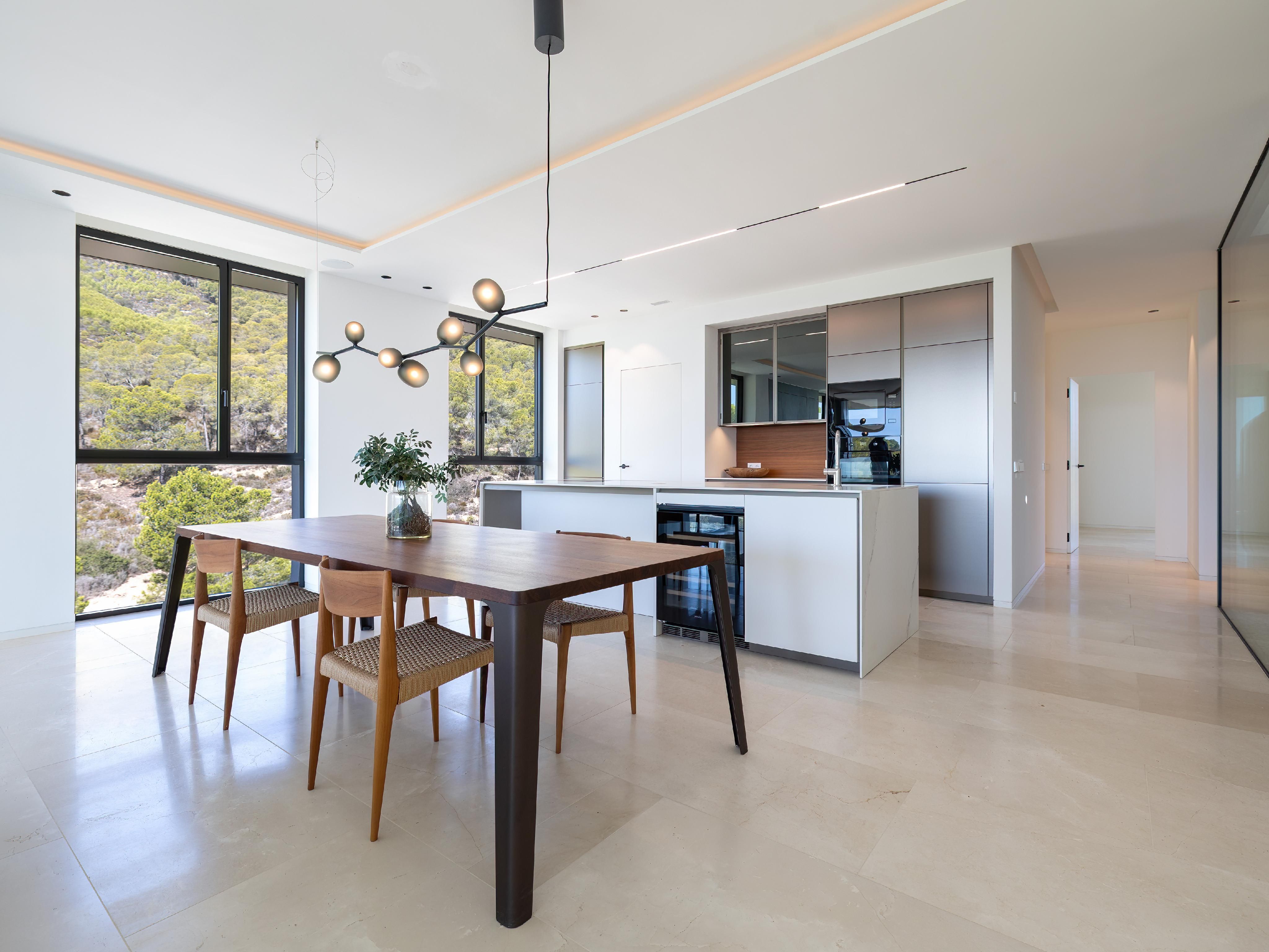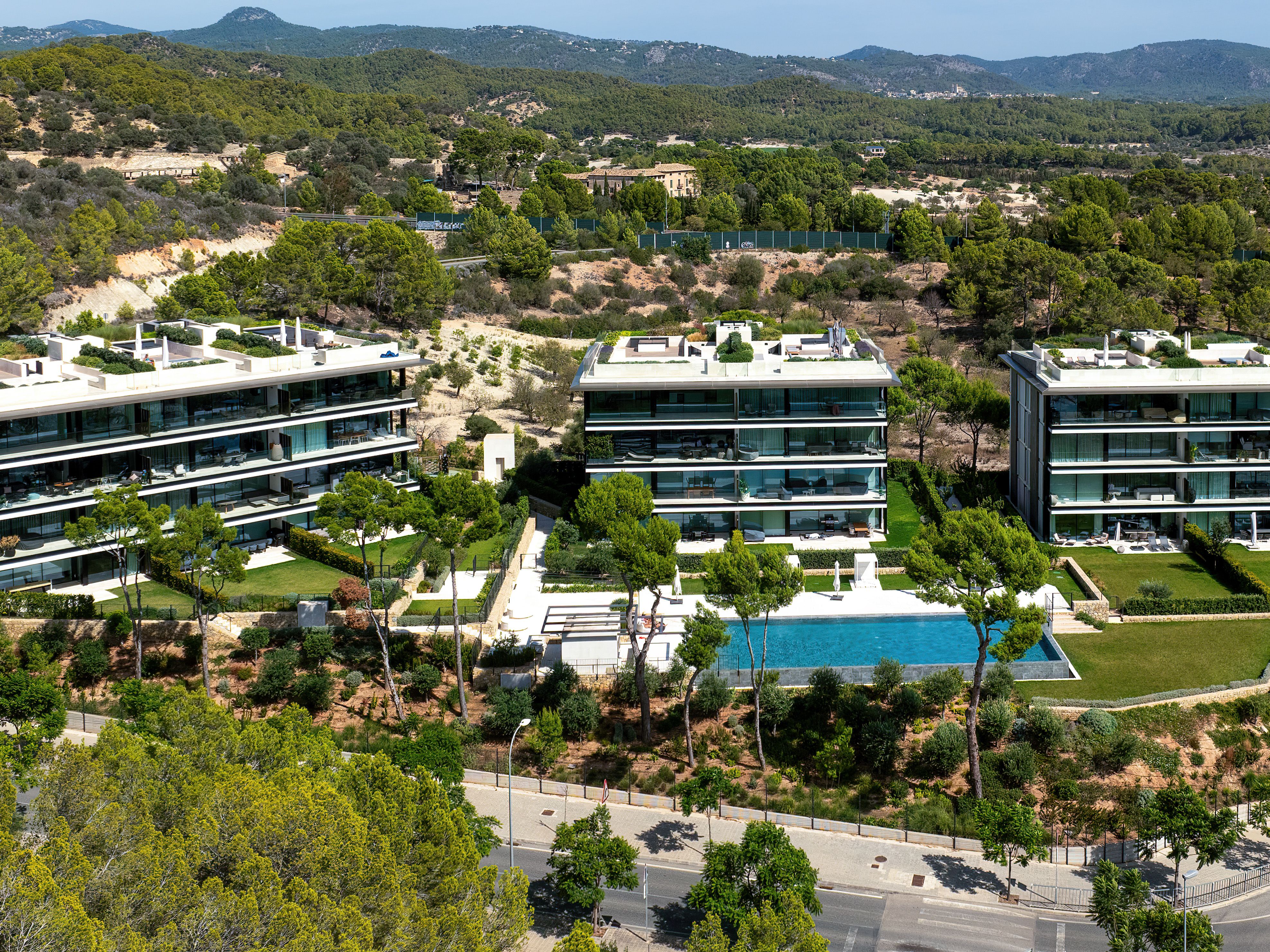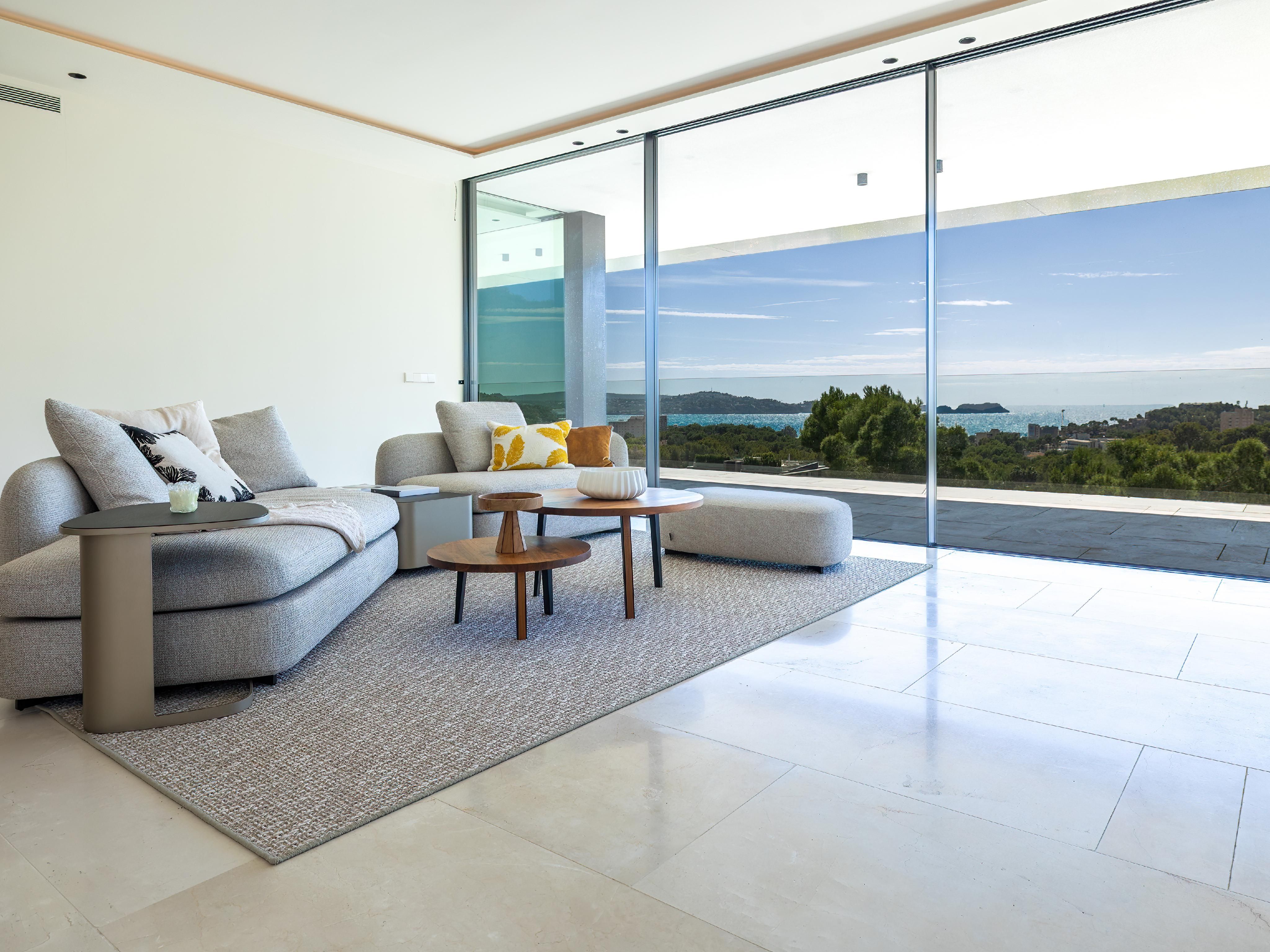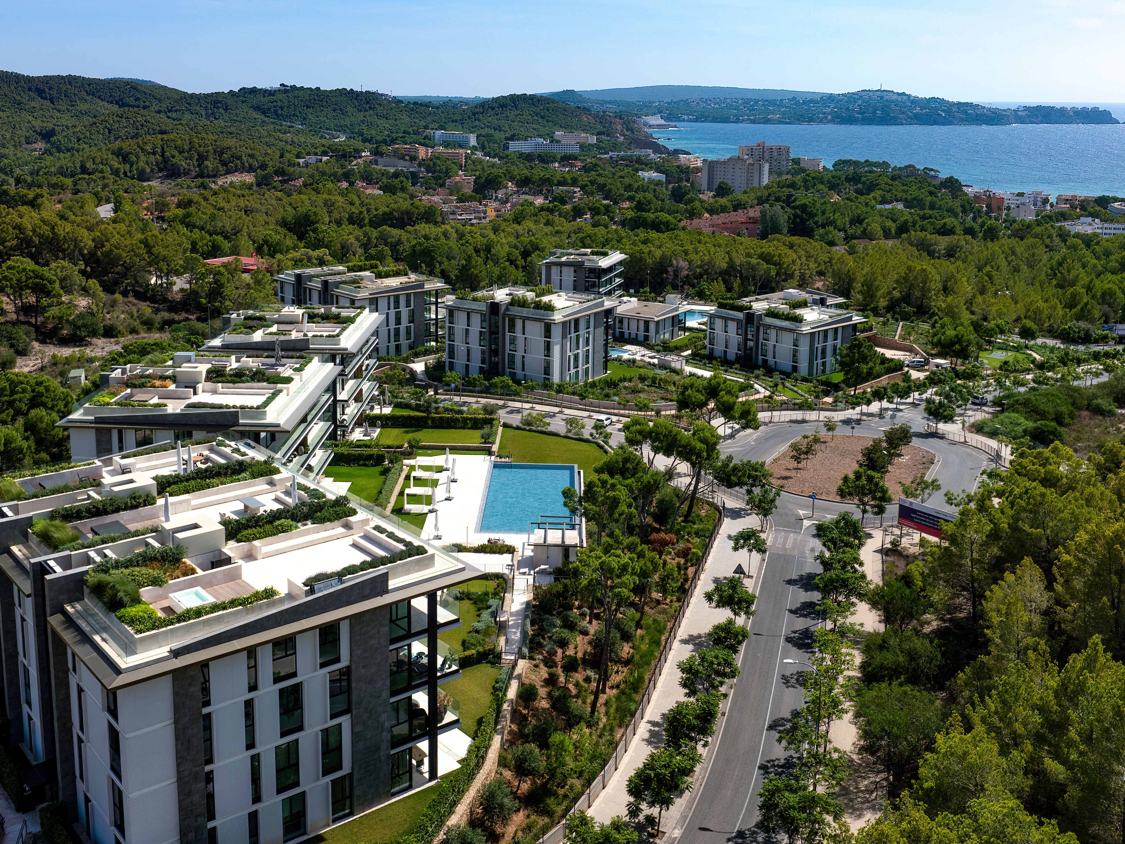 Contemporary luxury living, intelligent layouts and a dreamlike panoramic view over the Mediterranean landscape and the sea to the picturesque Malgrats Islands, all this is offered by this unique new development in the southwest of Mallorca. The project consists of 2 residential complexes: One complex with a total of 28 exclusive apartments in 3 buildings and an inviting communal pool with chill-out area and pool bar. Here you can enjoy a fantastic sea view even from the garden apartments. In the 6 buildings of the second complex, with 2 large community pools and a children’s playground, a further 42 luxury apartments are being built. In addition, both complexes have an underground car park. The main focus of the project was on integration into the original landscape. Lush Mediterranean plants give the community the special atmosphere of a Mediterranean oasis. Furthermore, it is characterized by a sophisticated architectural concept, developed by an international team of architects. All apartments have large window fronts, high ceilings and convince with a great combination of natural materials and modern elements. The overall concept is completed by a well thought-out and very high-quality interior: designer kitchen and built-in cabinets by Poliform, Fantini fittings, minimalist floor-to-ceiling windows by Panoramah, and much more. All garden apartments have large, lush gardens, and most of the penthouses have roof terraces with lounge areas and Jacuzzis. Several beaches as well as cafés and restaurants are within walking distance.