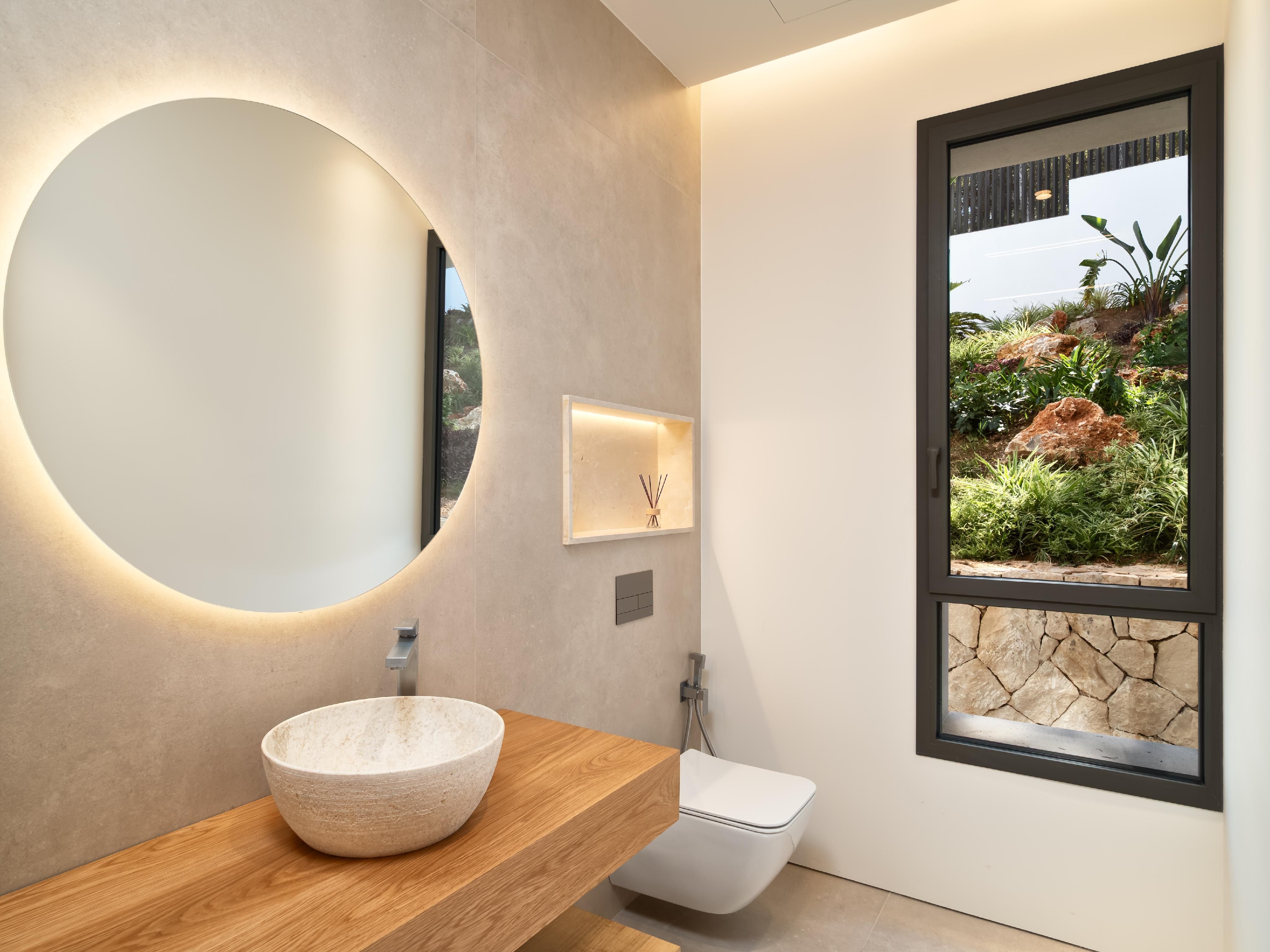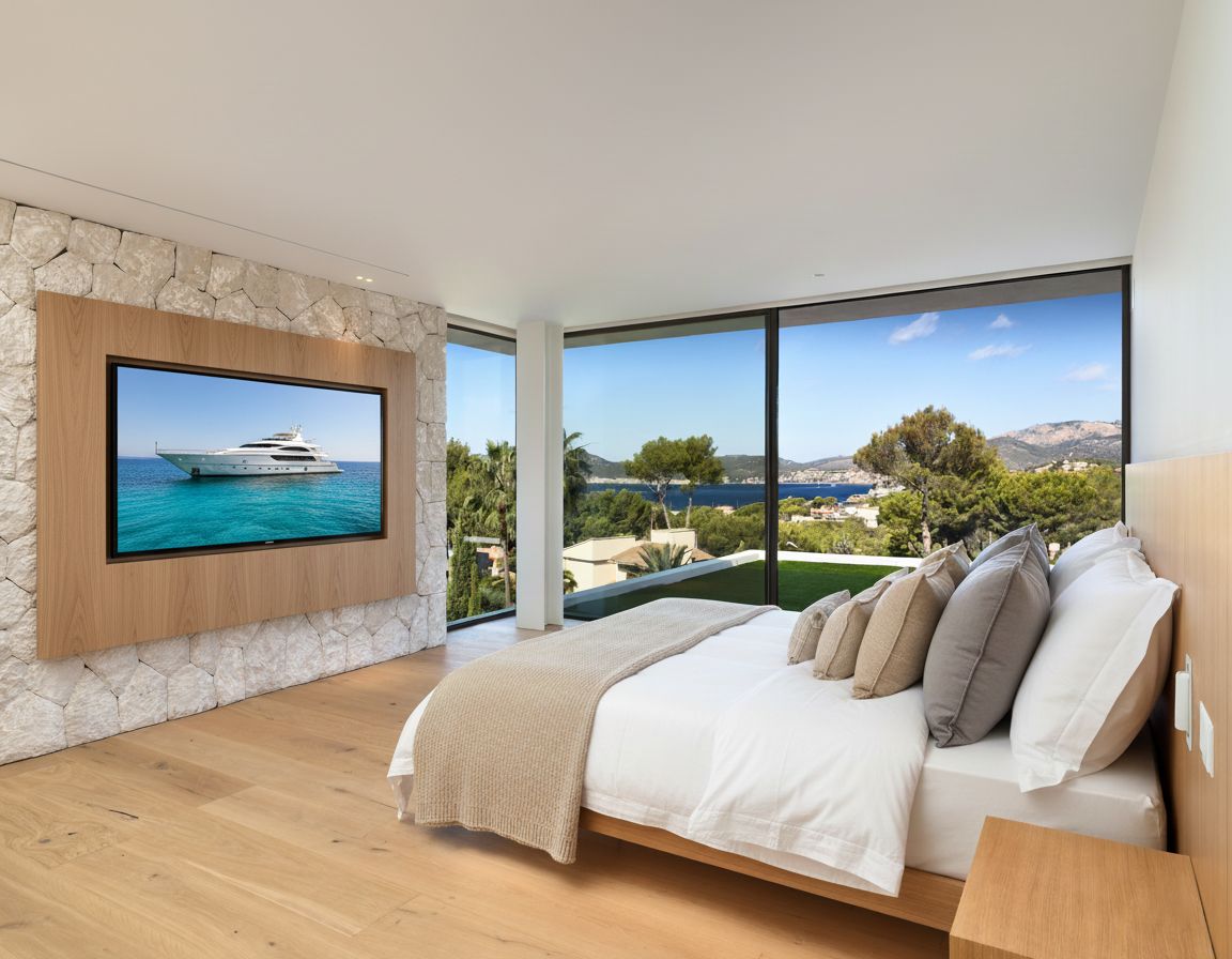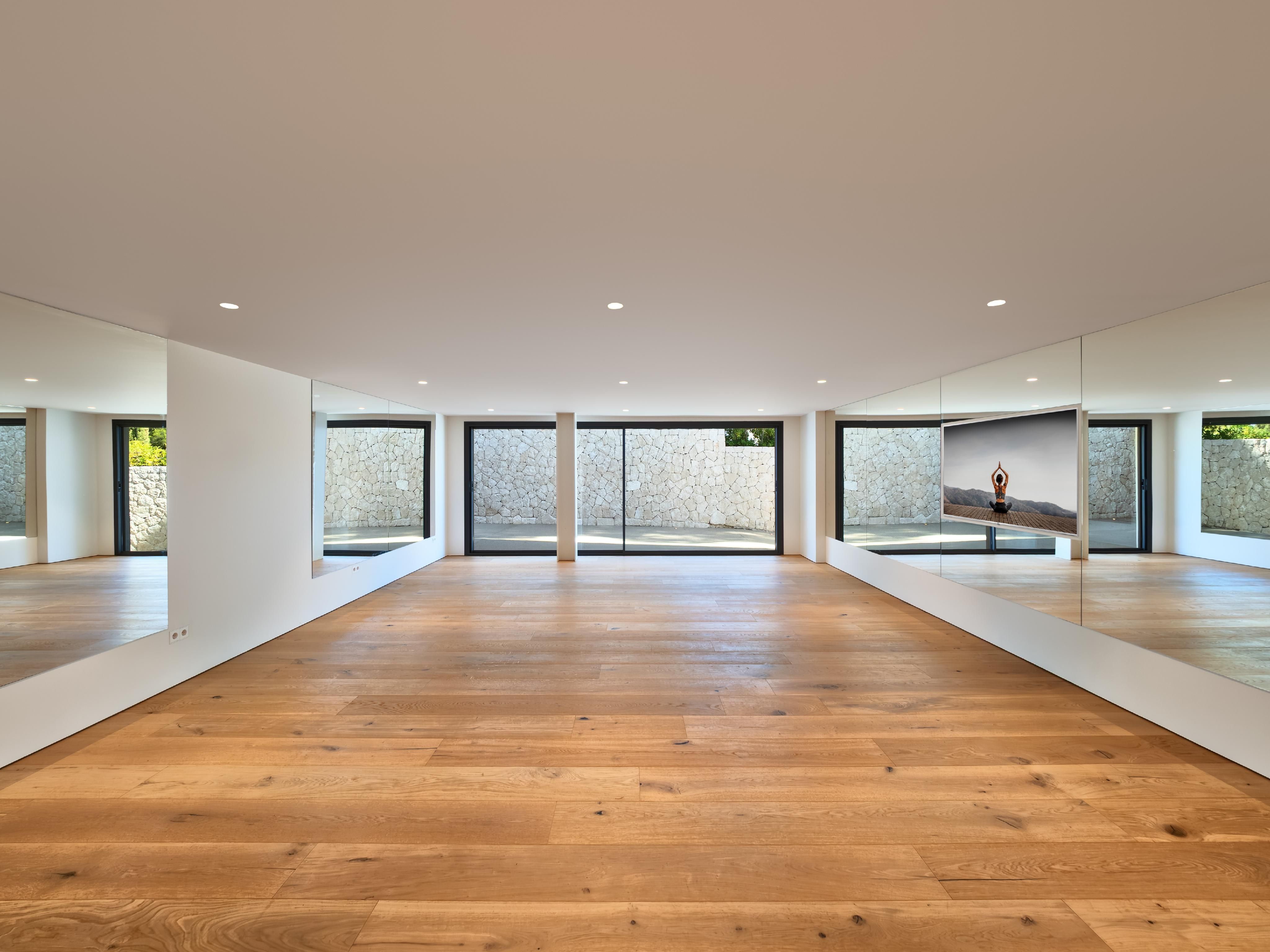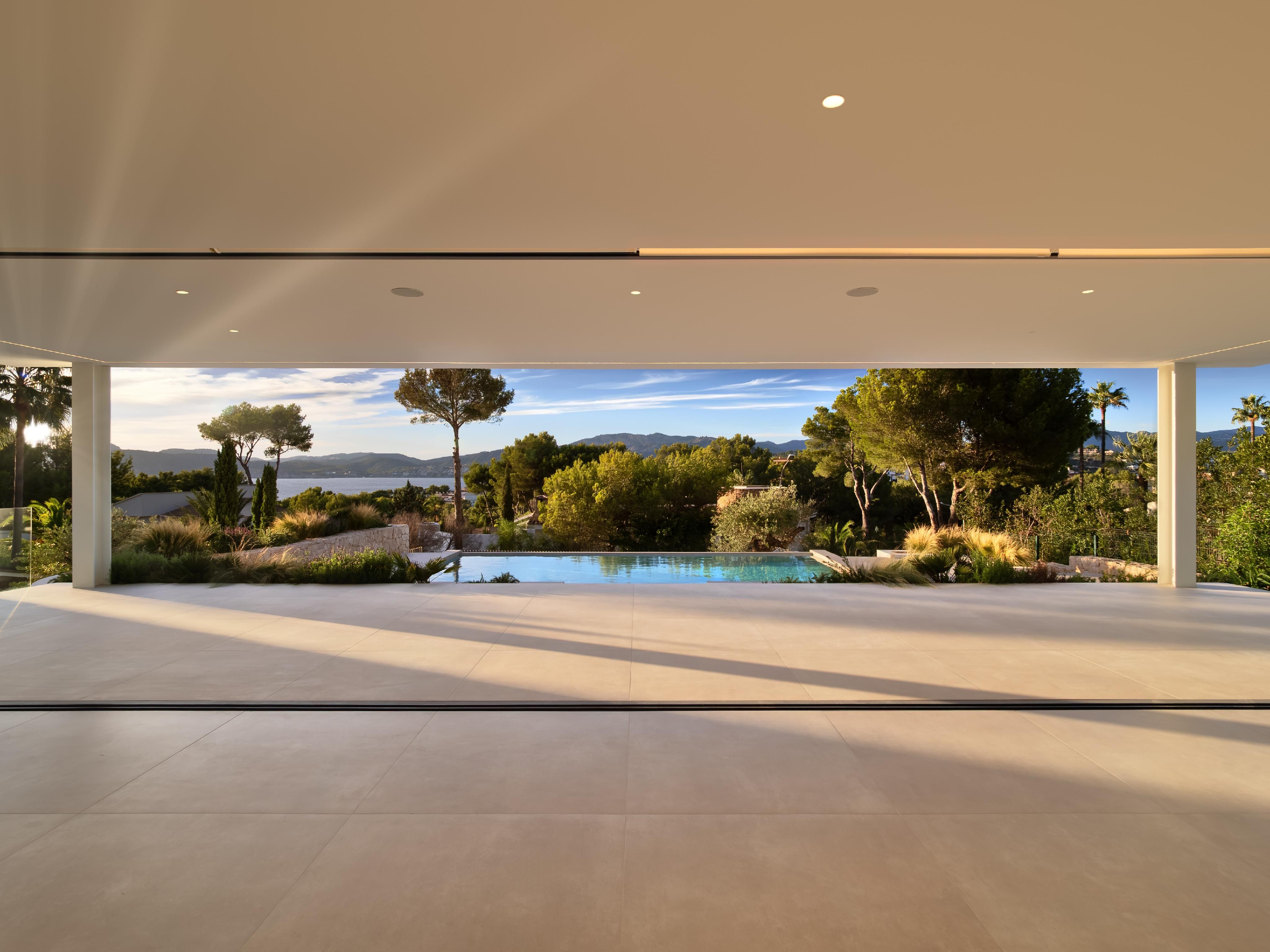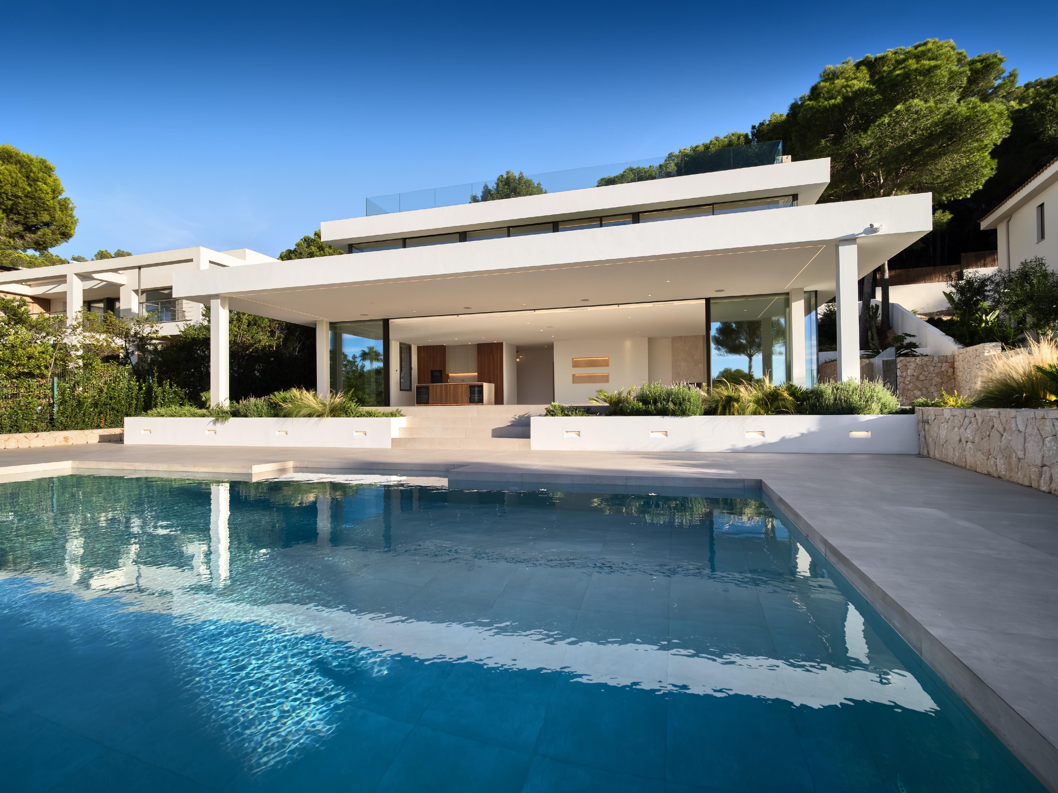 In the heart of Santa Ponsa, in one of the most exclusive and quietest residential areas, stands this newly built villa, adjacent to a nature reserve, combining modern design, the highest level of living comfort and first-class quality materials. With 656 m² of living space, the property offers spacious, clearly structured rooms that guarantee both privacy and functionality. The villa has four spacious bedrooms, including a master bedroom with a generous dressing room, each with its own en-suite bathroom, flooded with light and equipped with modern details that create an elegant feel-good atmosphere. The open-plan living areas impress with their very large continuous window fronts (22.5 m on the ground floor and 20 m on the upper floor), which open up to a fantastic sea view. The modern designer kitchen with cooking island and high-quality built-in appliances forms the heart of the home and invites you to enjoy convivial get-togethers. Exclusive amenities are available for relaxation and leisure: a private gym, spacious sun terraces and an infinity pool that invites you to relax outdoors. The offer is rounded off by a garage with space for four vehicles, ensuring security and convenience. This residence combines contemporary luxury, high living comfort and a privileged location: a private oasis just minutes from beaches, golf courses and all the amenities of Santa Ponsa – ideal both as a primary residence and as an exclusive holiday villa.