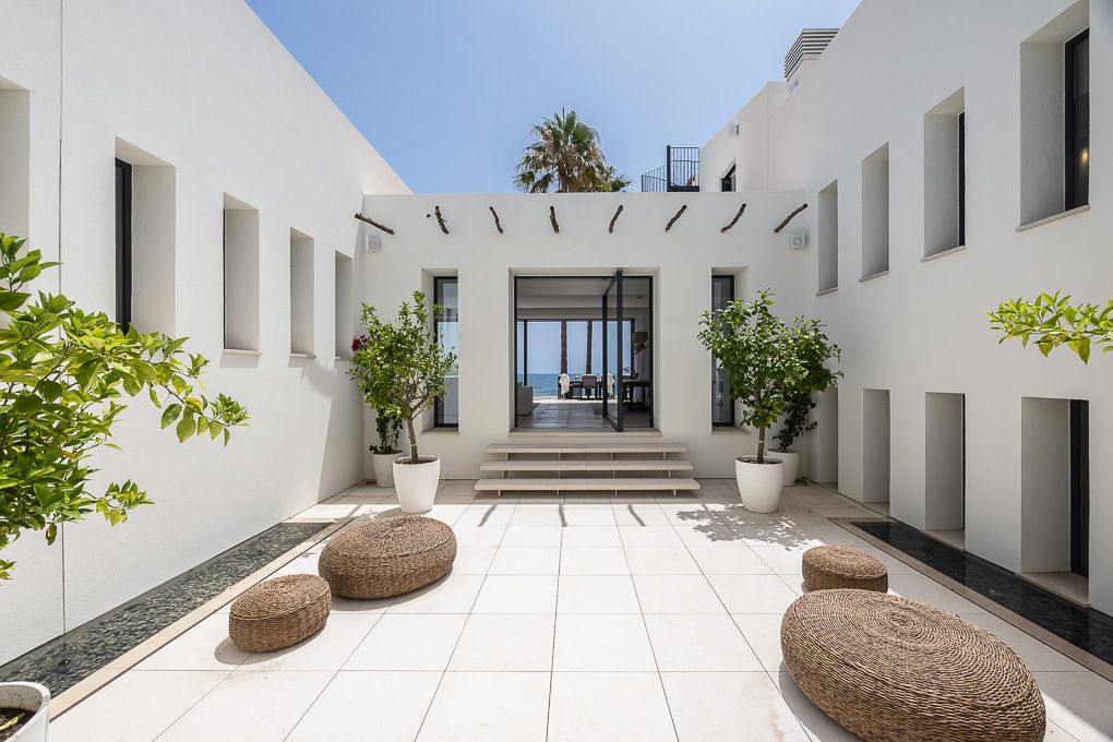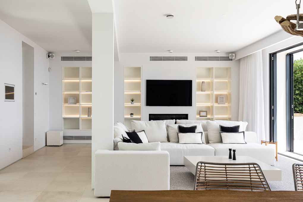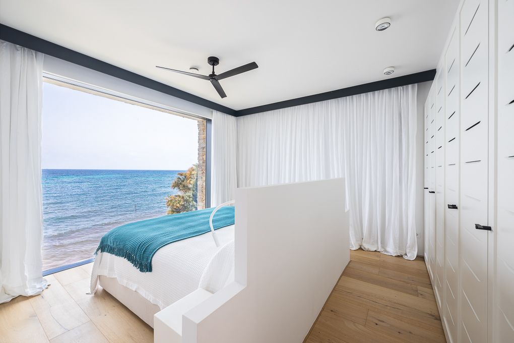 This new-build villa is located on the first sea line in Port Verd with private sea access. The property was developed with the premise of creating maximum privacy in the house and combining the relationship between light and water with the architecture. An impressive wooden door leads to the patio, through which you enter the main house, the spacious living room with fireplace, dining room and open-plan kitchen. The adjoining terrace is just a few metres from the sea, and if you cross the short stretch of lawn, a gate leads directly to the sea and the beach. The living-dining area is the central axis of the house, from where you can access the four bedrooms, each with an en suite bathroom. The master bedroom, in the tower, offers a breathtaking direct sea view. There is also a large roof terrace with marvellous sea views over the coast. The very spacious pool area has a 40 m² pool, a great relaxation area with a pool house, an outdoor kitchen and a separate shower and toilet area. Highlights: PV system with 6.4 KWP for the complete basic supply of the house depending on consumption, KNX bus system for SMART control of the entire house from anywhere in the world, Tense and Gira switching systems with Ochio lights, rooms are equipped with REVOX sound systems, video system, alarm system, 3000 litre water system for self-sufficient supply, 20,000 litre cisterns for garden use. An absolute dream property of the highest quality.