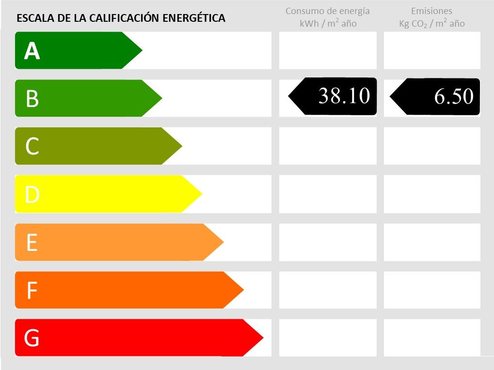 • Energy consumption value: 38.1 kWh/(m2*a) • CO2 emission: 6.5 kg/m2 • CO2 Emission Rating: B • Energy efficiency rating: B
